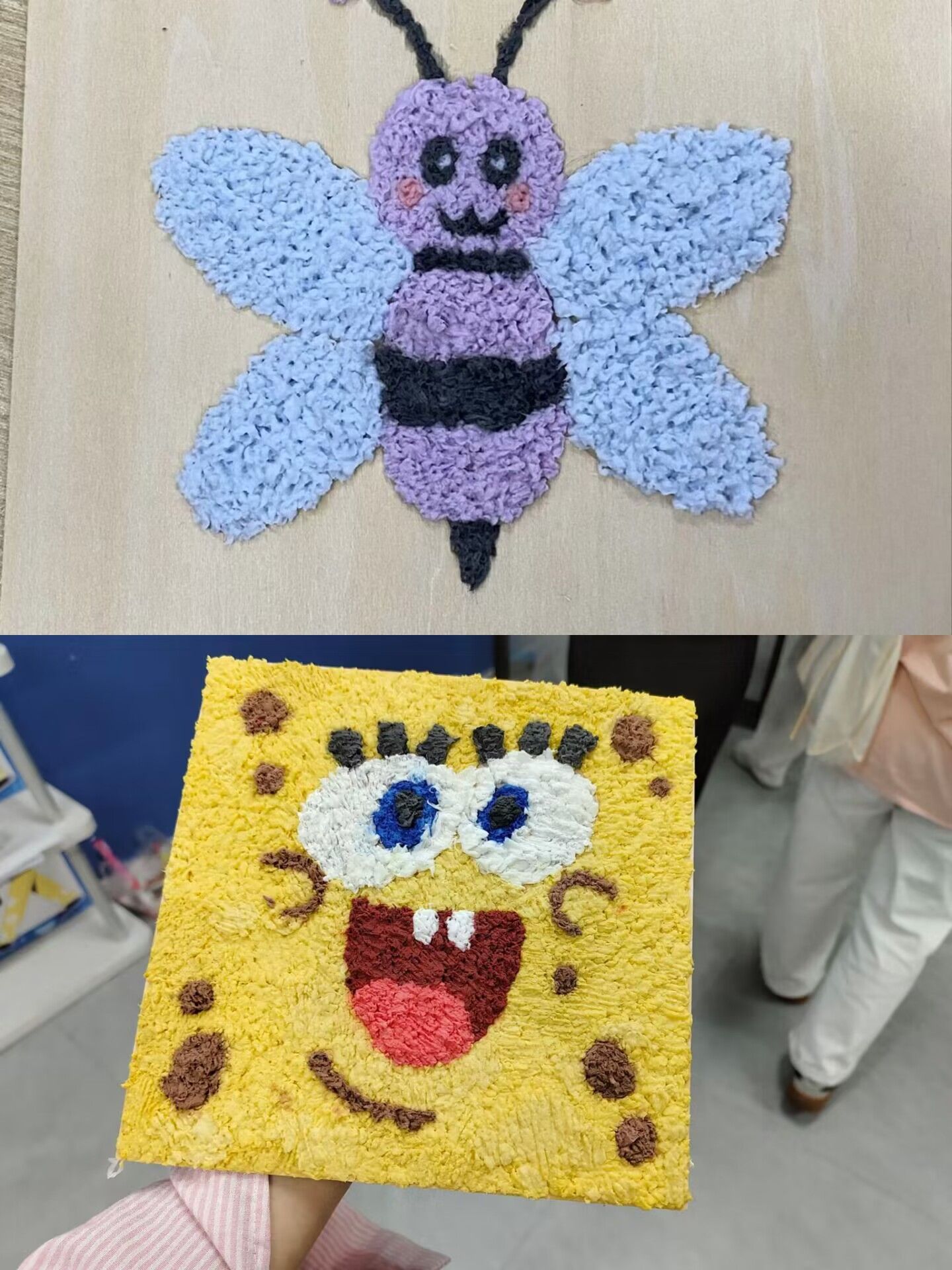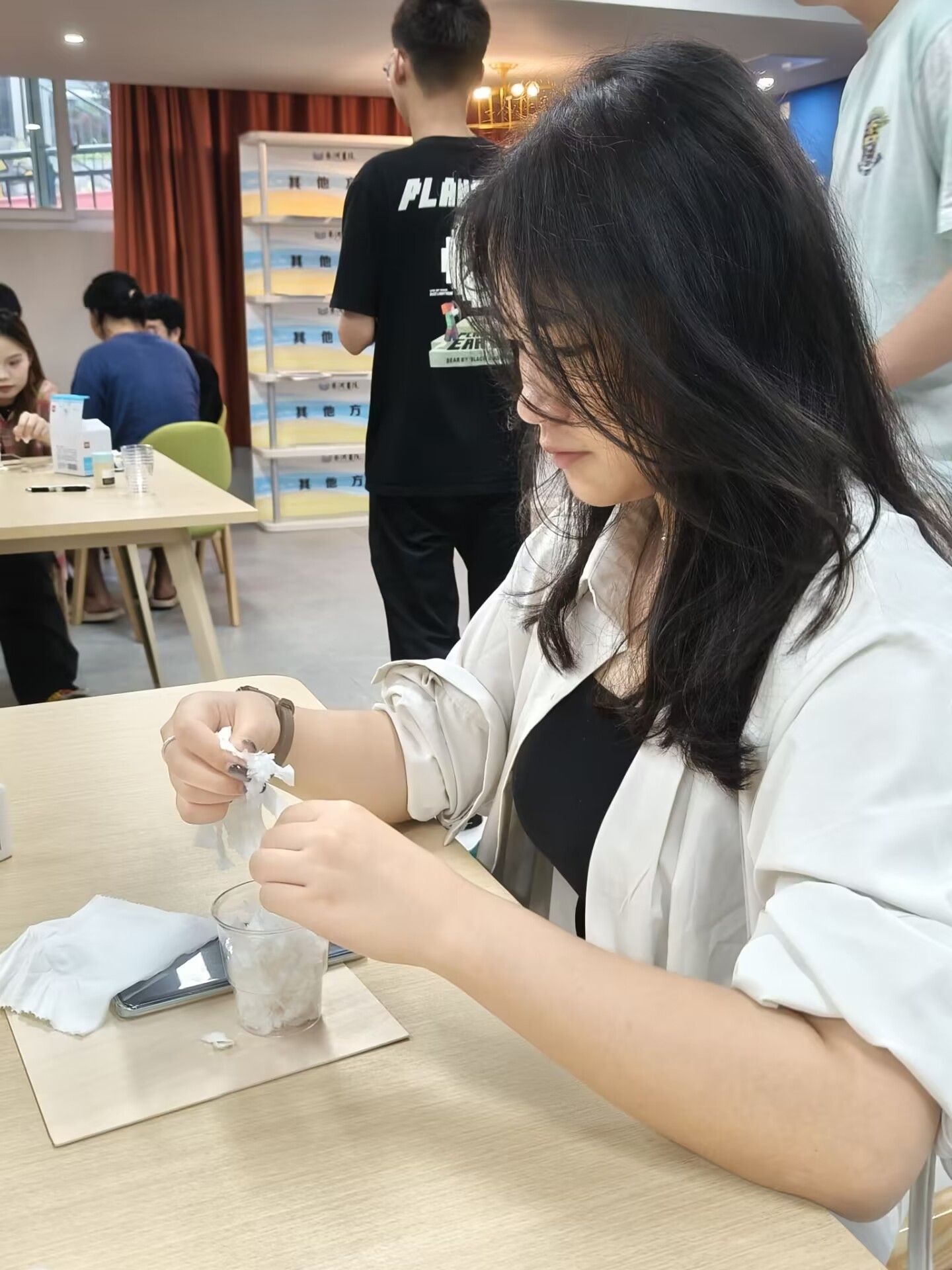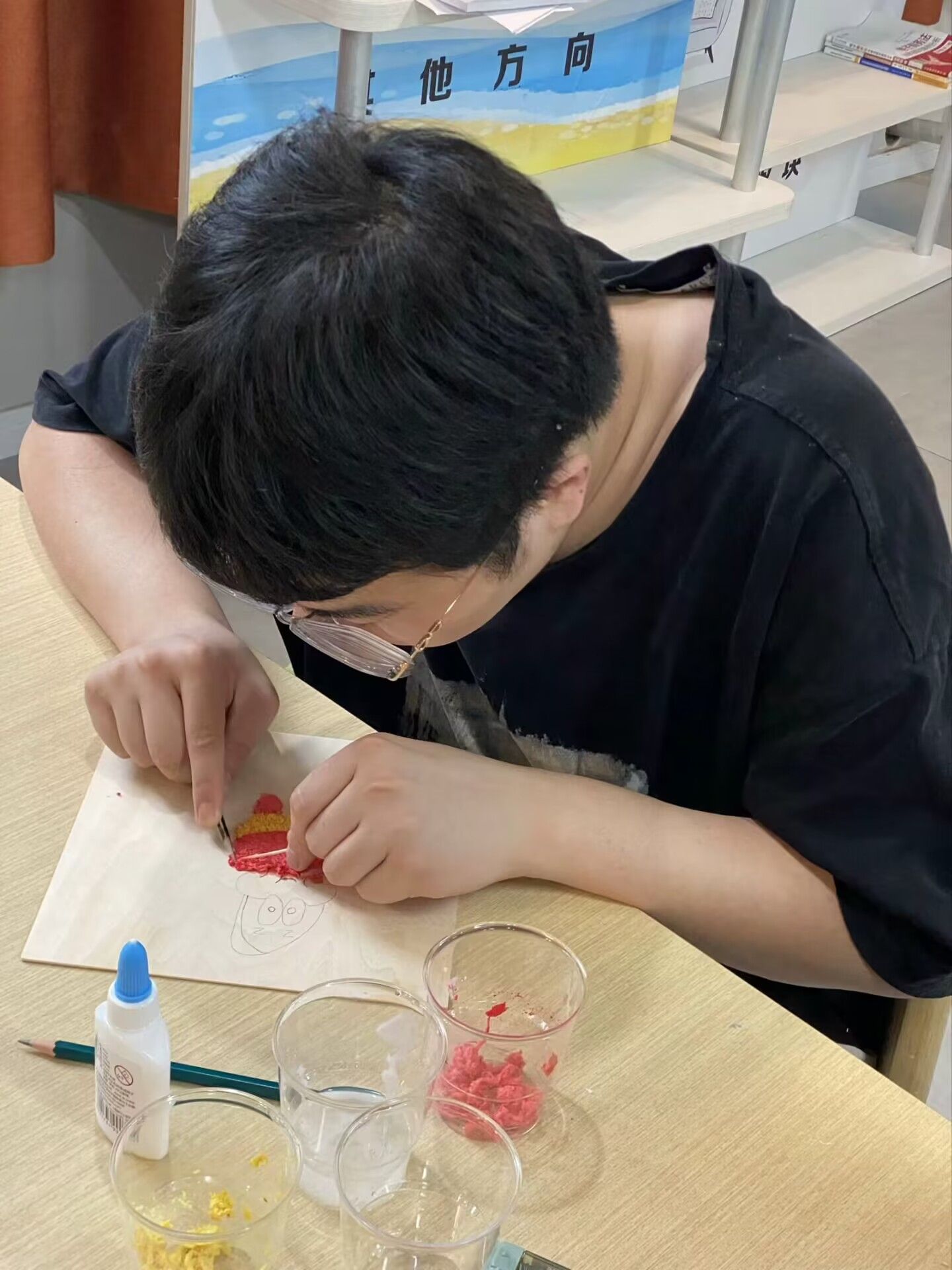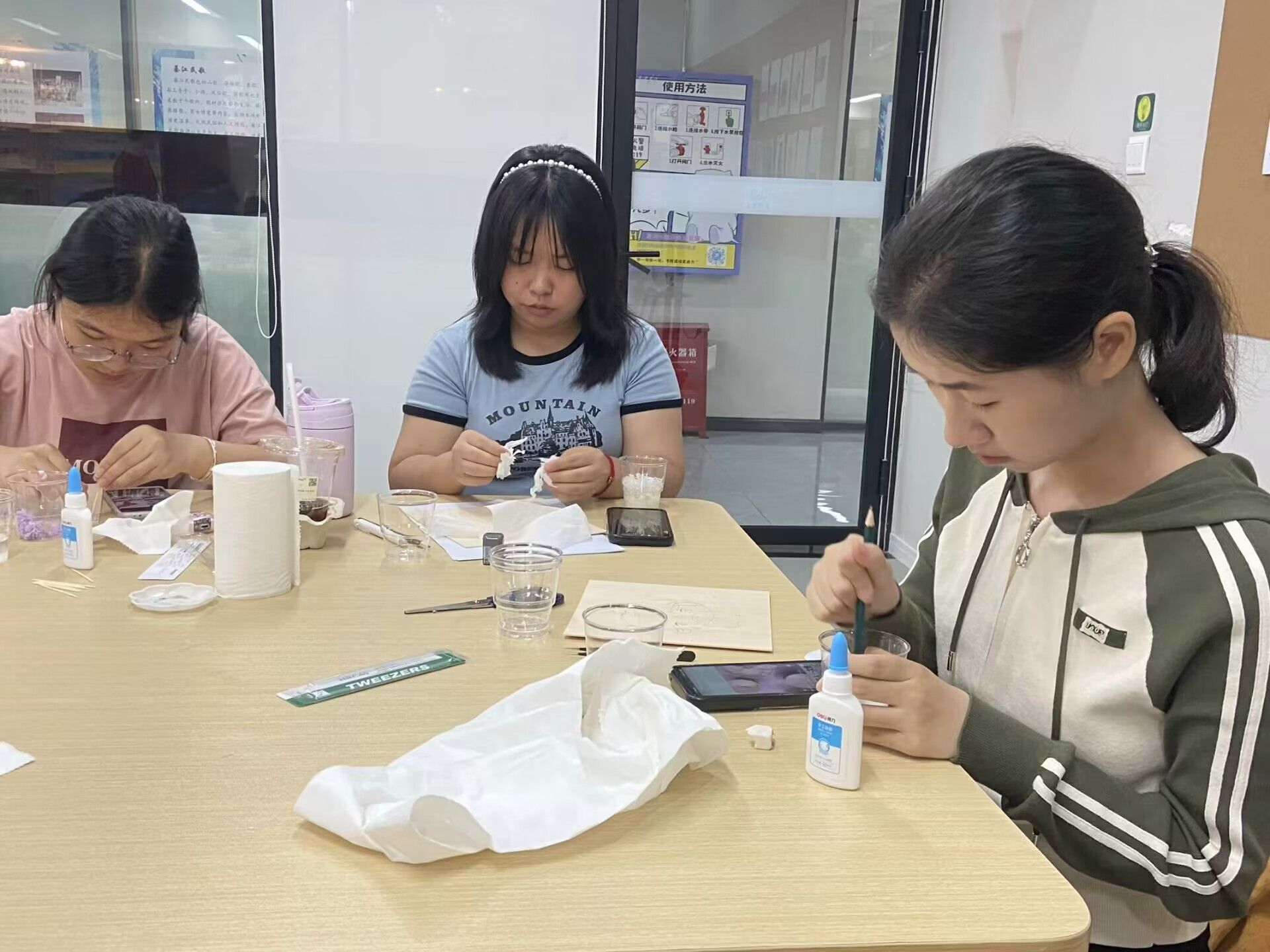 在活动现场的一角,一位工作人员正耐心地指导着一位同学。她轻轻拿起镊子,示范着如何勾勒线条,同时讲解着纸浆画的技巧与注意事项。同学认真地听着,不时点头表示理解。在工作人员的悉心指导下,同学的作品逐渐成形,展现出独特的魅力。