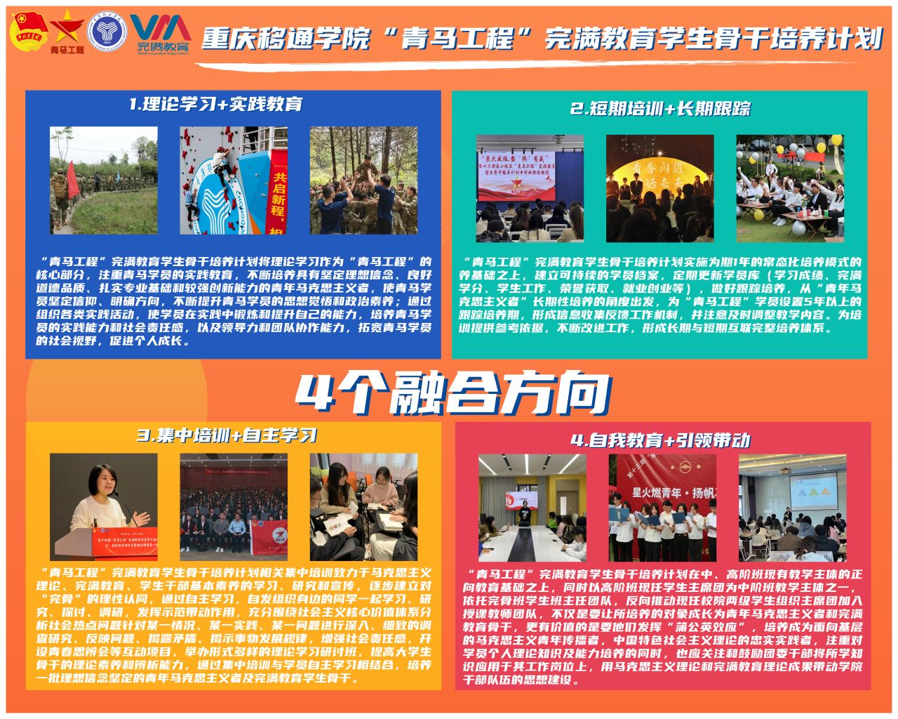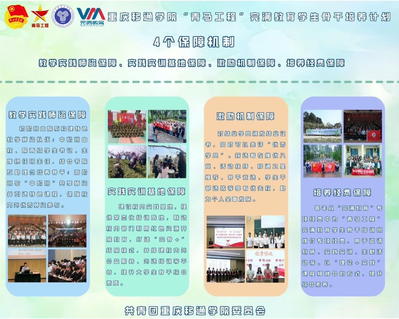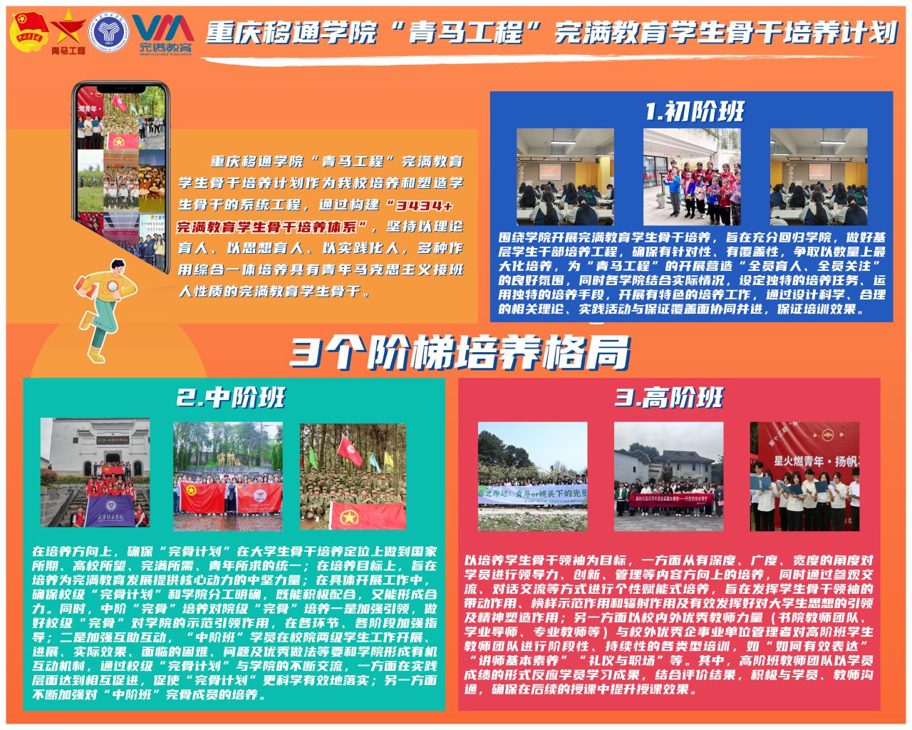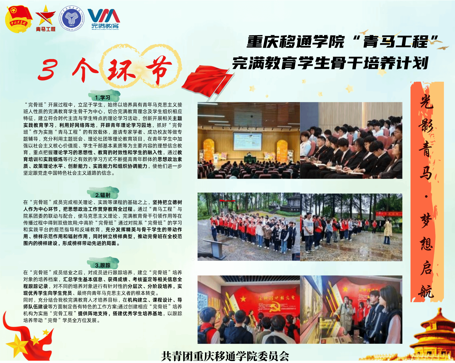 青马工程文化长廊以图文并茂的展板形式,将青马学员从稚嫩成熟的每一个阶段的精彩瞬间都一一呈现。长廊详细展示了不同层次青马班级的培养方式、成长历程、学习成果及各类活动的精彩瞬间。活动秉承“青马工程”完满教育学生骨干培养计划“3434+完满教育学生骨干培养体系”,坚持以理论育人,以思想育人、以实践育人,多种作用综合一体培养具有青年马克思主义接班人性质的完满教育学生骨干。它让每一个走进长廊的人都能感受到青马班级的独特魅力和精神风貌,也激励着更多的同学加入到青马工程中来,共同书写独属于自己的辉煌篇章。