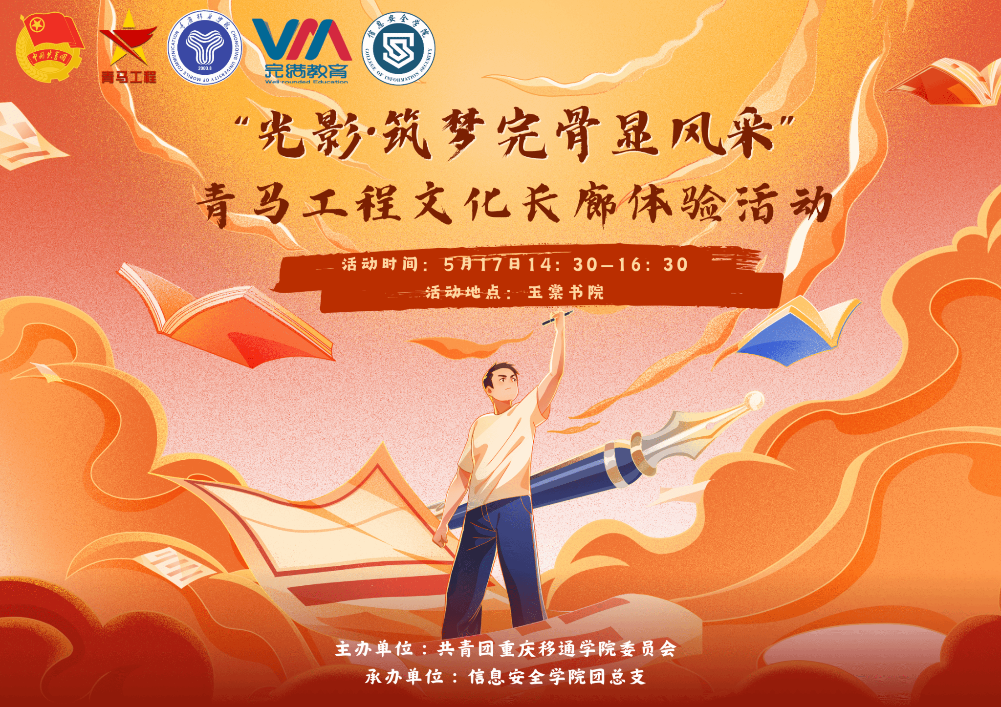 为展现“青马工程”完满教育学生骨干培养计划各班级文化风采和成果,传递青马声音,讲好青马故事,2024年5月17日14:30,由共青团重庆移通学院委员会主办、信息安全学院团总支组织部承办的“光影·筑梦完骨显风采”青马工程文化长廊体验活动在玉棠书院顺利开展,活动共计300余人参与。