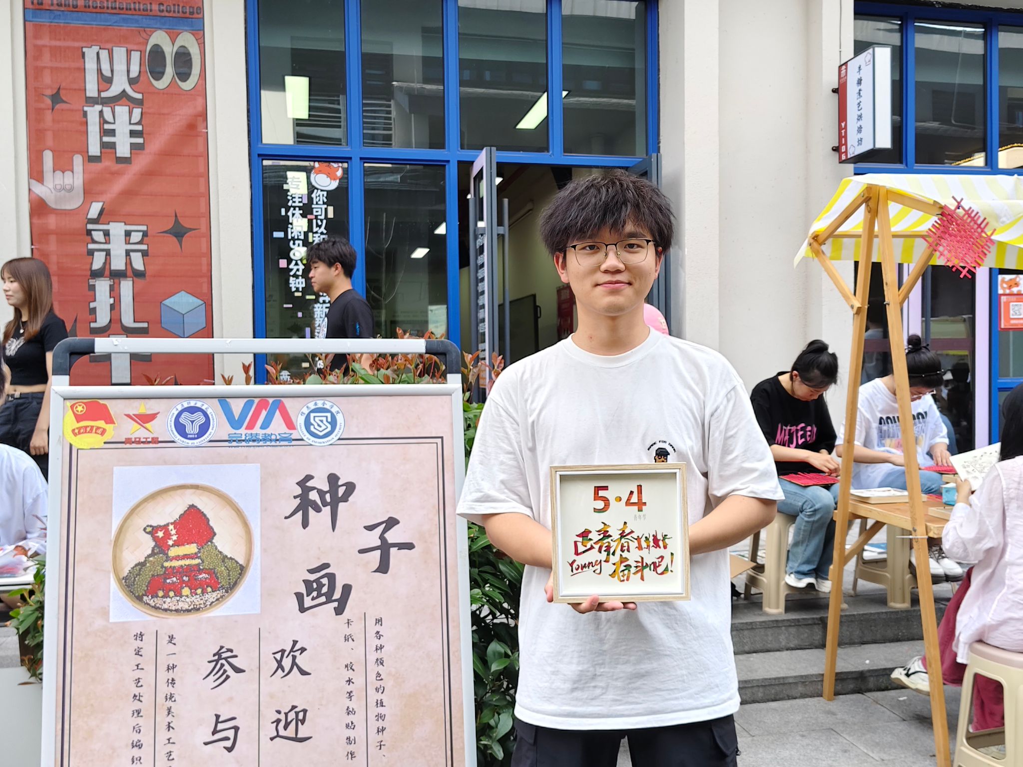 为增加互动性和趣味性,信息安全学院团总支组织部设置了竹编画与种子画红色主题DIY体验活动。工作人员对竹编画和种子画的历史渊源、技艺特点和技巧进行了讲解。同学们发挥创意,精心挑选竹条和种子,编织出了象征青年力量的火炬、象征自由与进步的旗帜,拼出了南湖红船等图案。在手工制作中,同学们深刻感受到了传统手工艺的魅力与乐趣,同时也表达了对五四精神的传承,展现出了新时代青年的风采。