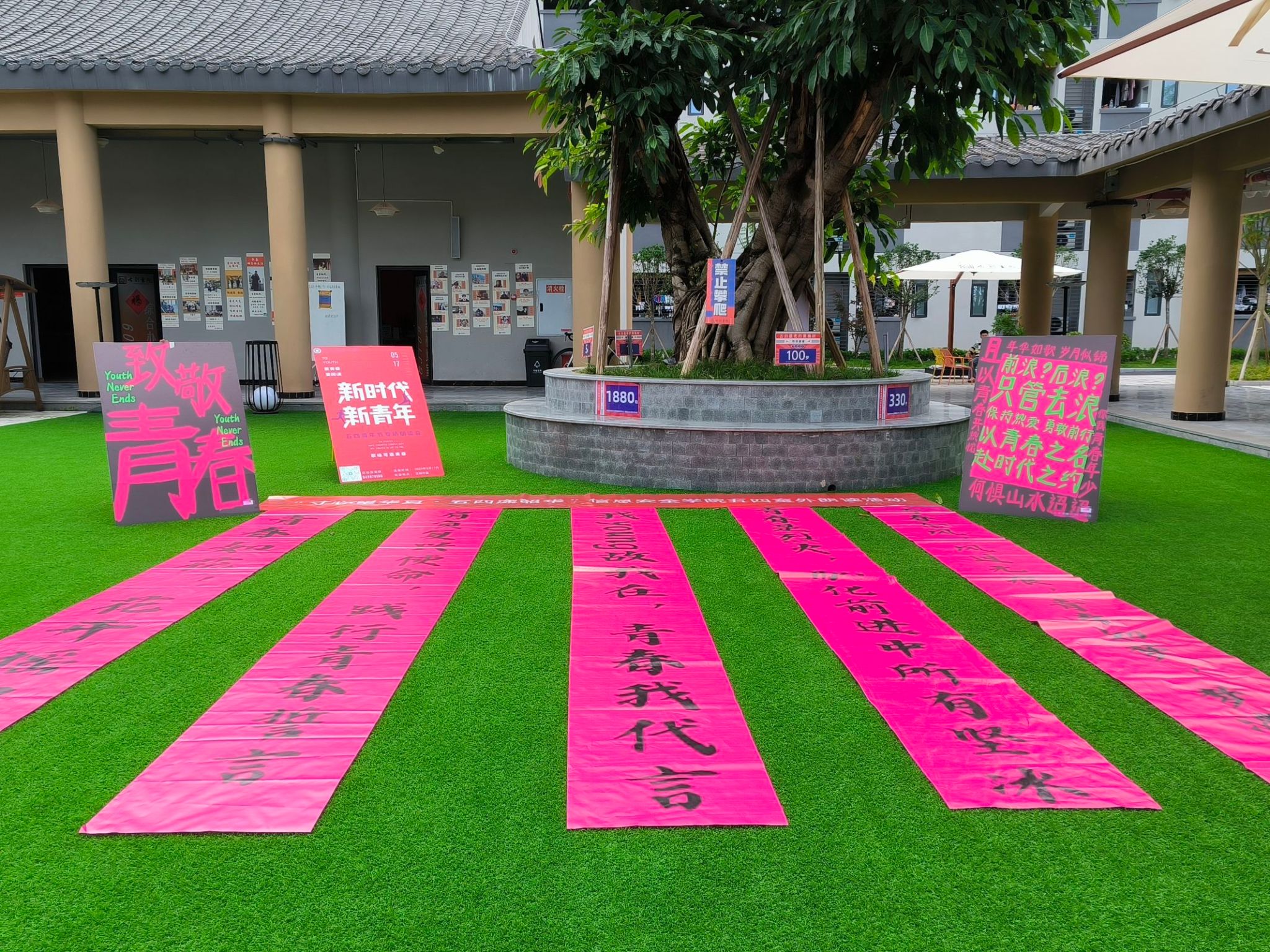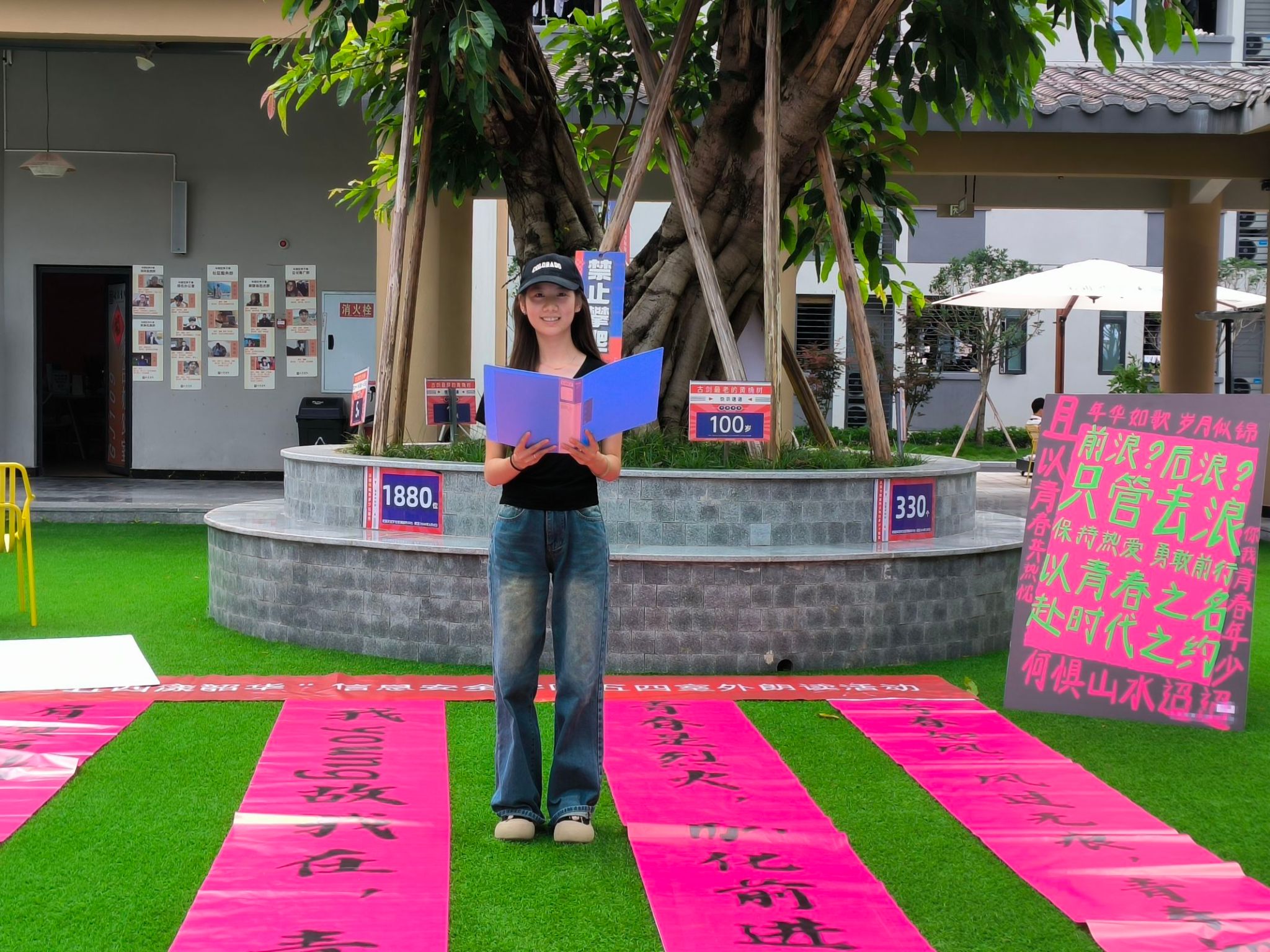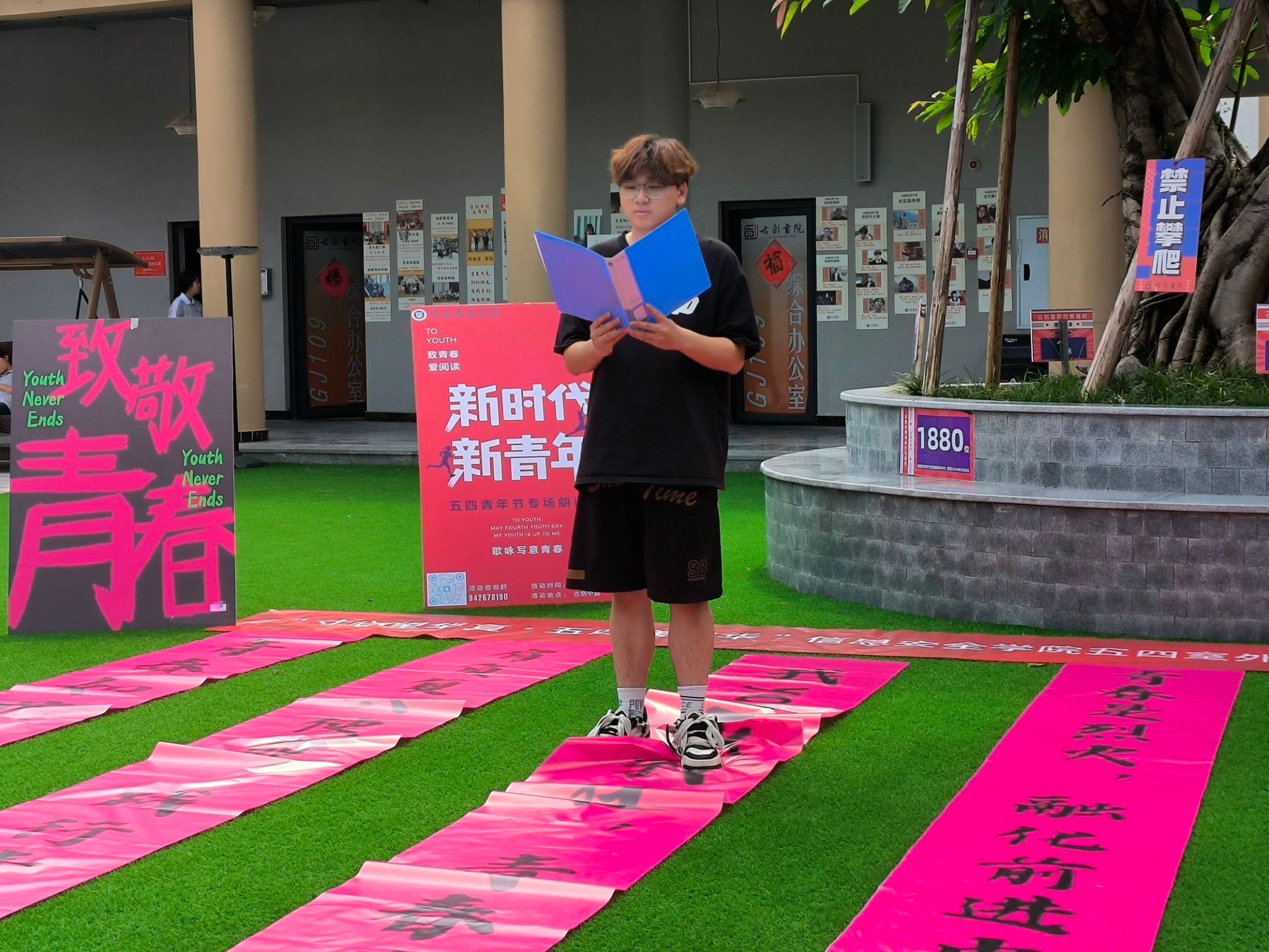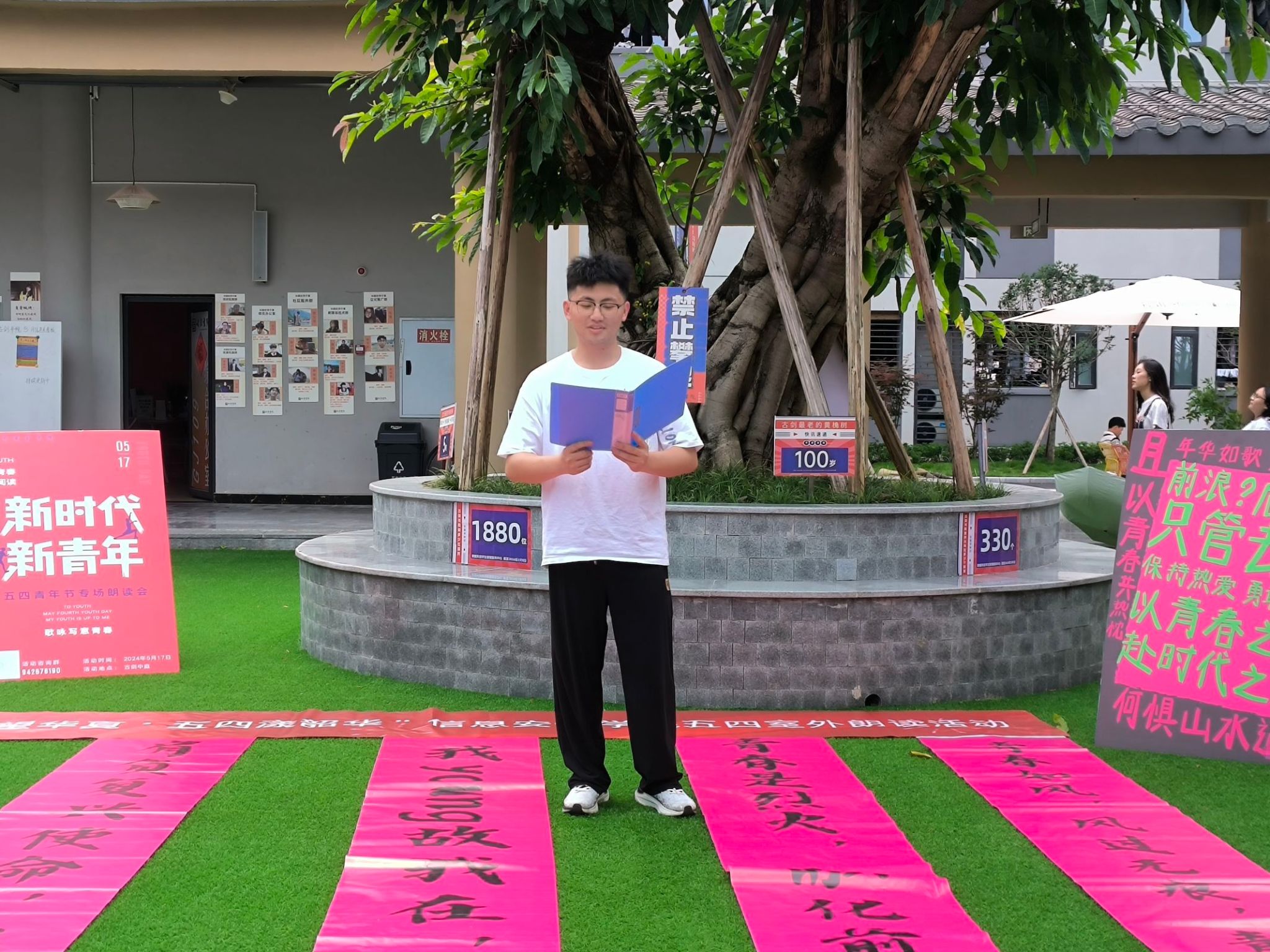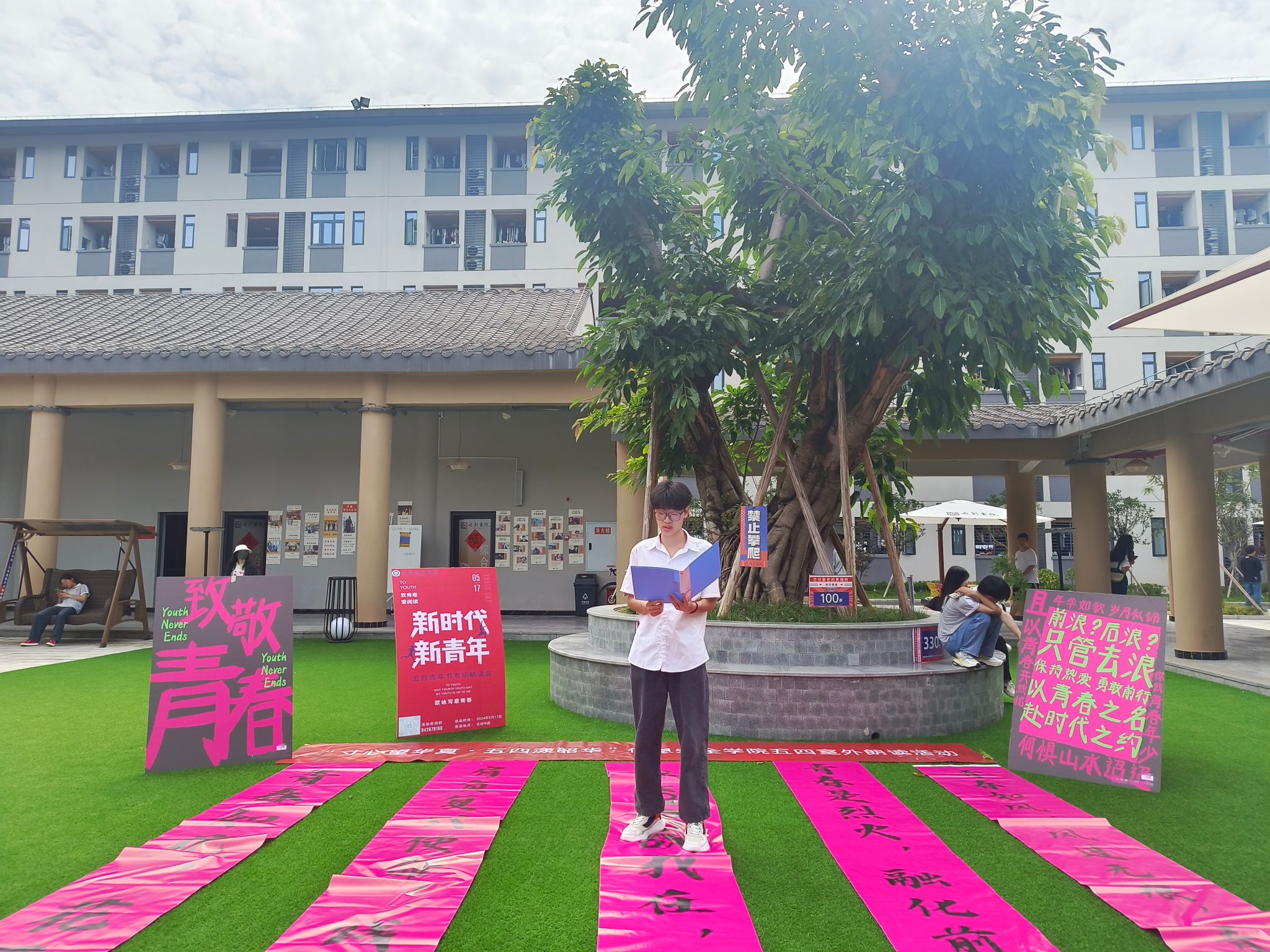 活动开始之前,工作人员们精心布置现场,营造了庄重的氛围,让同学们拥有一个沉浸式的朗读空间。国旗高高飘扬,横幅上写着“寸心望华夏·五四漾韶华”的标语,现场摆放着气球和道具,学生们也满怀激情地聚集在这里,用朗读的方式表达对五四精神的传承和发扬。