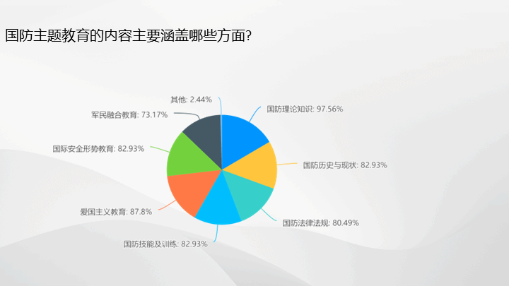 这表明了同学们接受的国防主题教育是较为全面的,也有意向主动去了解相关知识。因此同学们能够简要说明国防主题教育的内容主要涵盖了哪些方面,例如国防理论知识、国防历史与现状、国防法律法规等。