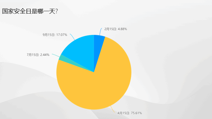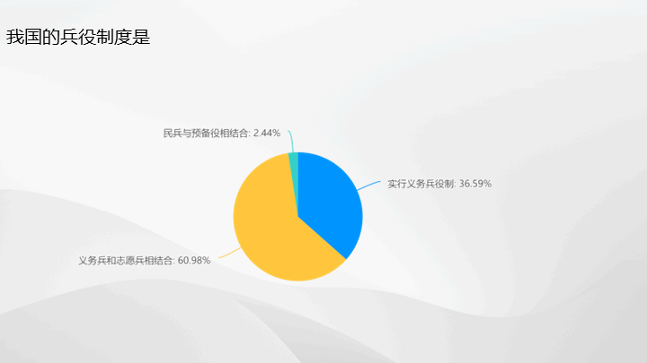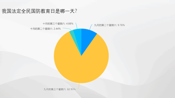 通过设置一些有关国防主题相关小问题,数据显示大数同学都能够正确回答出问题的答案。有82.93%的同学知道九月的第三个星期六是我国法定全民国防教育日,有75.61%的同学知道4月15日是国家安全日,在关于我国的兵役制度这个问题的调研中,回答正确的人数相对较少,只有60.98%的同学了解我国的兵役制度是义务兵和志愿兵相结合。