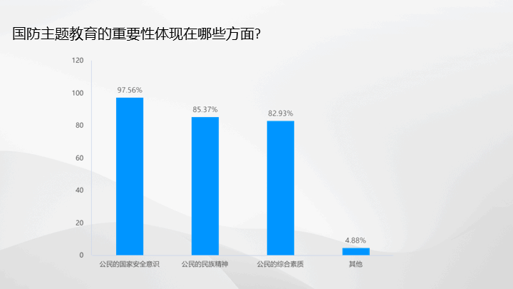 可以看出,同学通过参加不同的活动深入了解国防安全,对于国防主题教育的重要性有深刻的认识。97.5%的同学认为国防主题教育的重要性体现在公民的国家安全意识,另有85.37%和82.93%的同学认为国防主题教育的重要性体现在公民的民族精神与公民的综合素质。