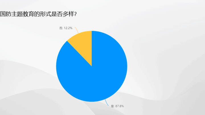 同时,此次调查数据显示,同学们在所接受的国防主题教育的形式是否多样这个问题上,87.8%的同学认为自己是通过讲座、实践活动、线上课程等相关形式进行国防主题教育。