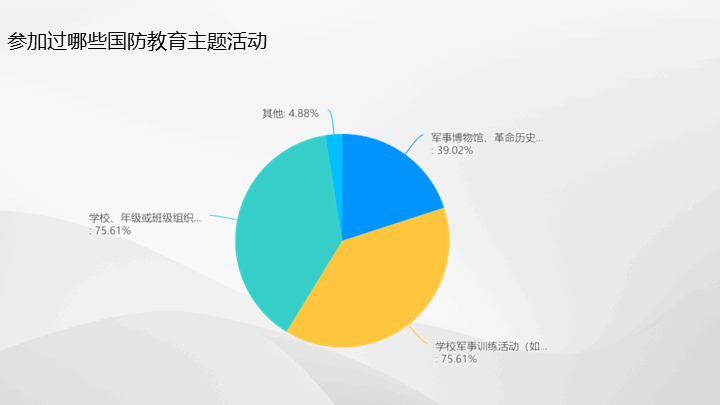 本次问卷调查在提及同学们参加过的国防教育中,过半数的同学表示自己参加过学校、年级或班级组织的国防教育讲座,以及学校军事训练活动,且39.02%的同学观摩过军事博物馆、革命历史纪念馆等国防教育基地。