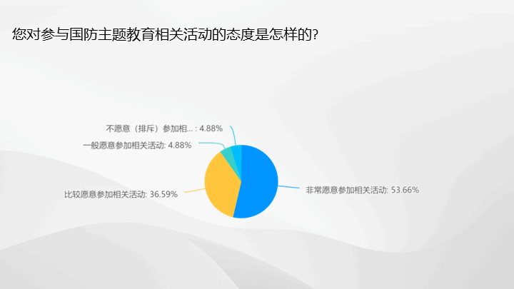 最后,在关于同学们对参与国防主题教育相关活动的态度中了解度,愿意参加相关活动的同学占到了95.12%。