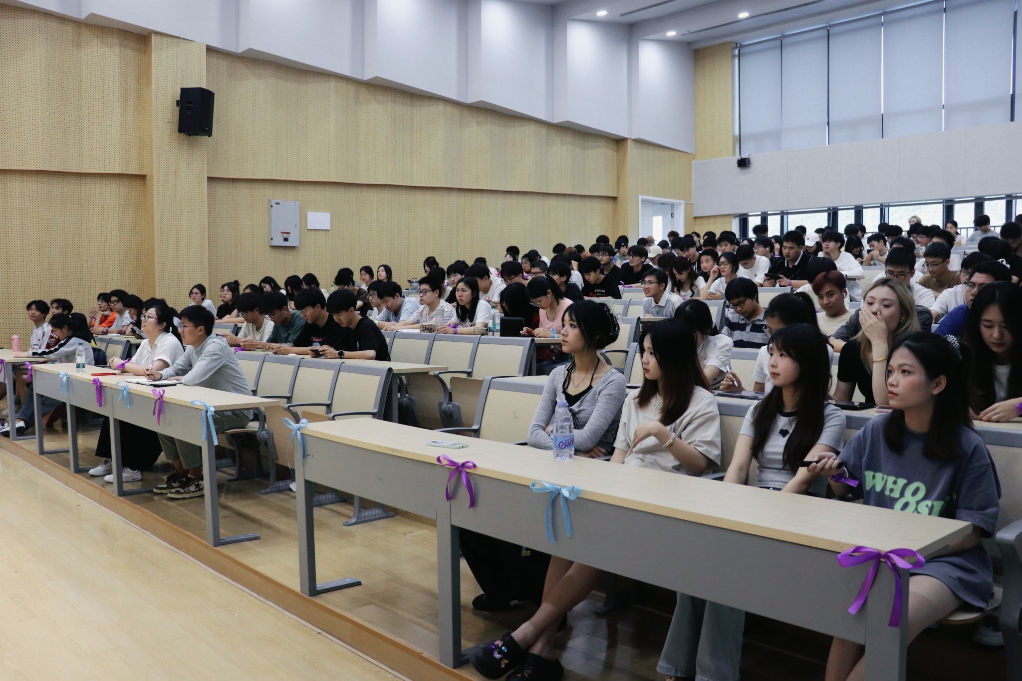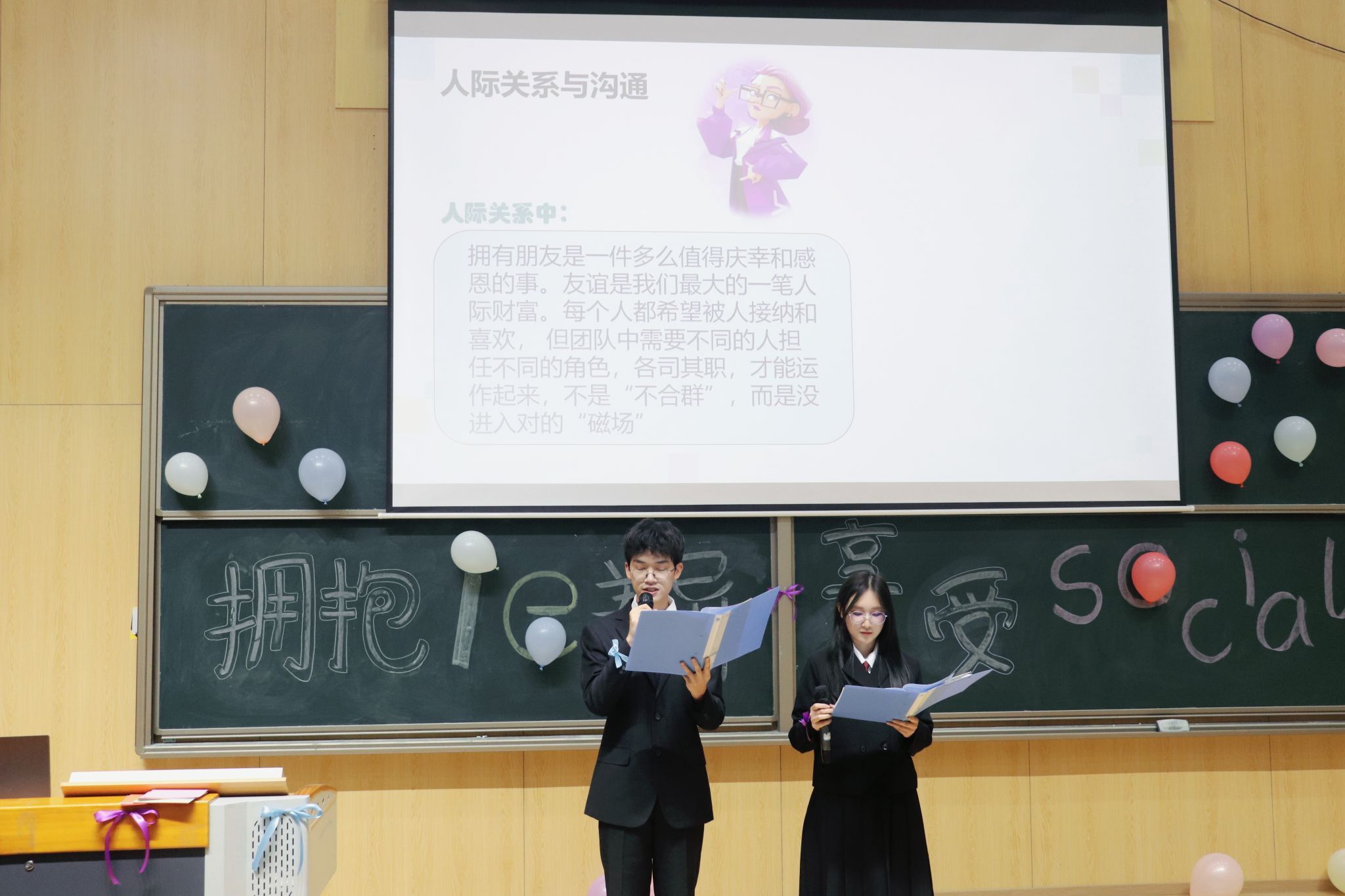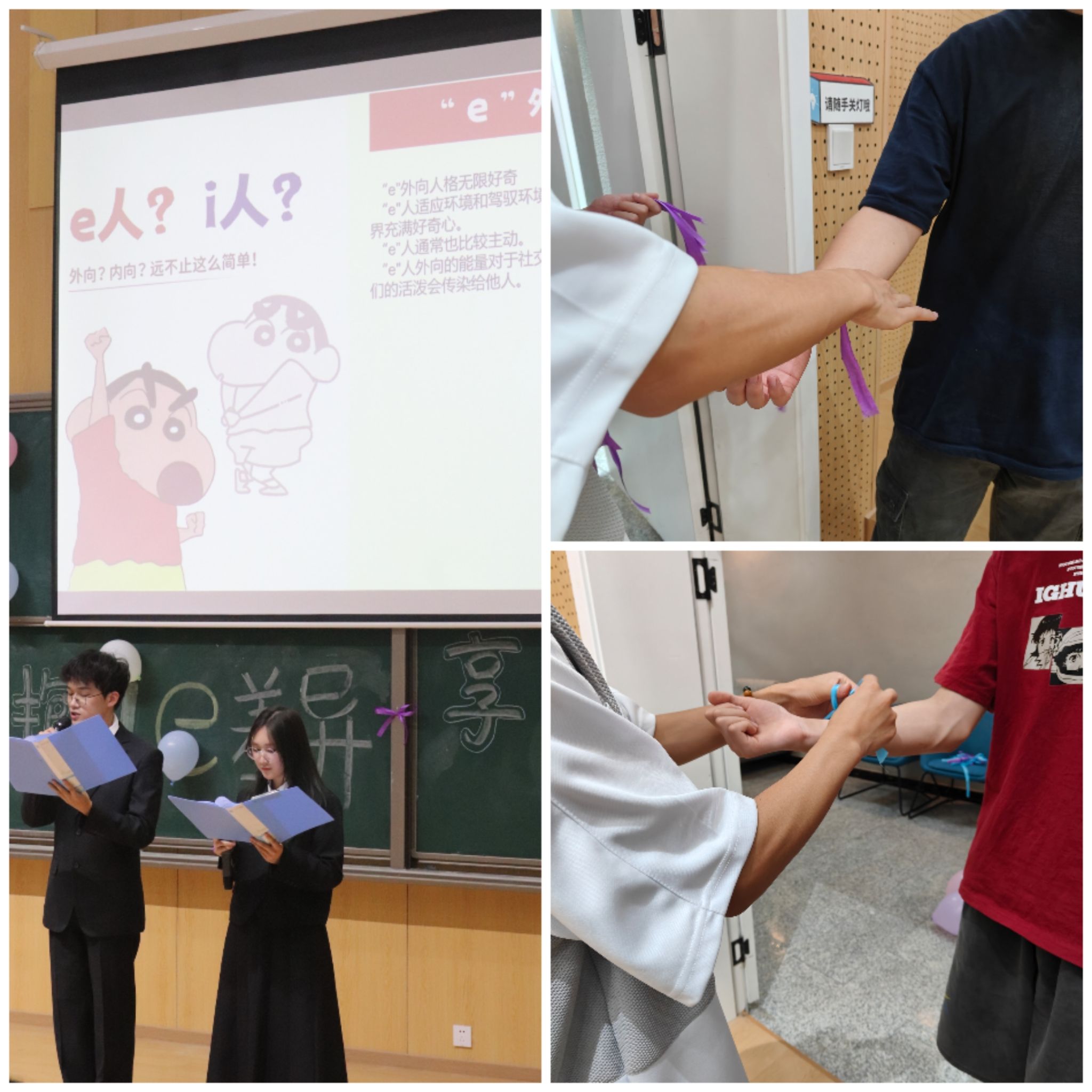 年级会伊始,主持人首先通过MBTI人格测试,帮助同学们了解自己的性格类型,工作人员根据测试结果分发彩带并系在手腕上,为后续的互动环节增添了趣味性。接着,主持人通过提问的方式进一步深入了解了同学们的性格特点,并通过鲜明的图片展示,让大家明白了i人(内向型)和e人(外向型)在人际交往中的不同交往方式,进而让大家打破自己的固步自封,在欢声笑语中交到志同道合的朋友。