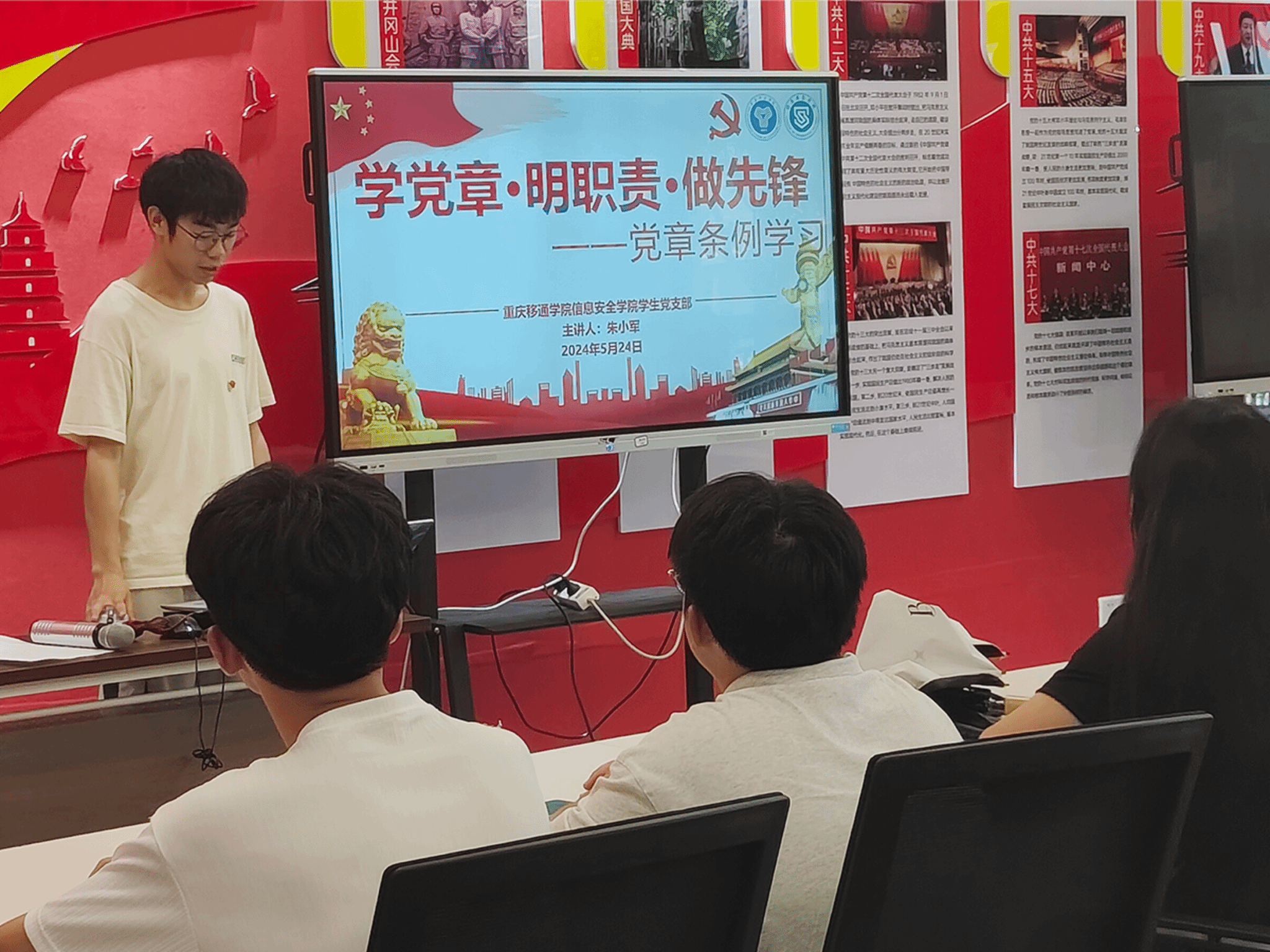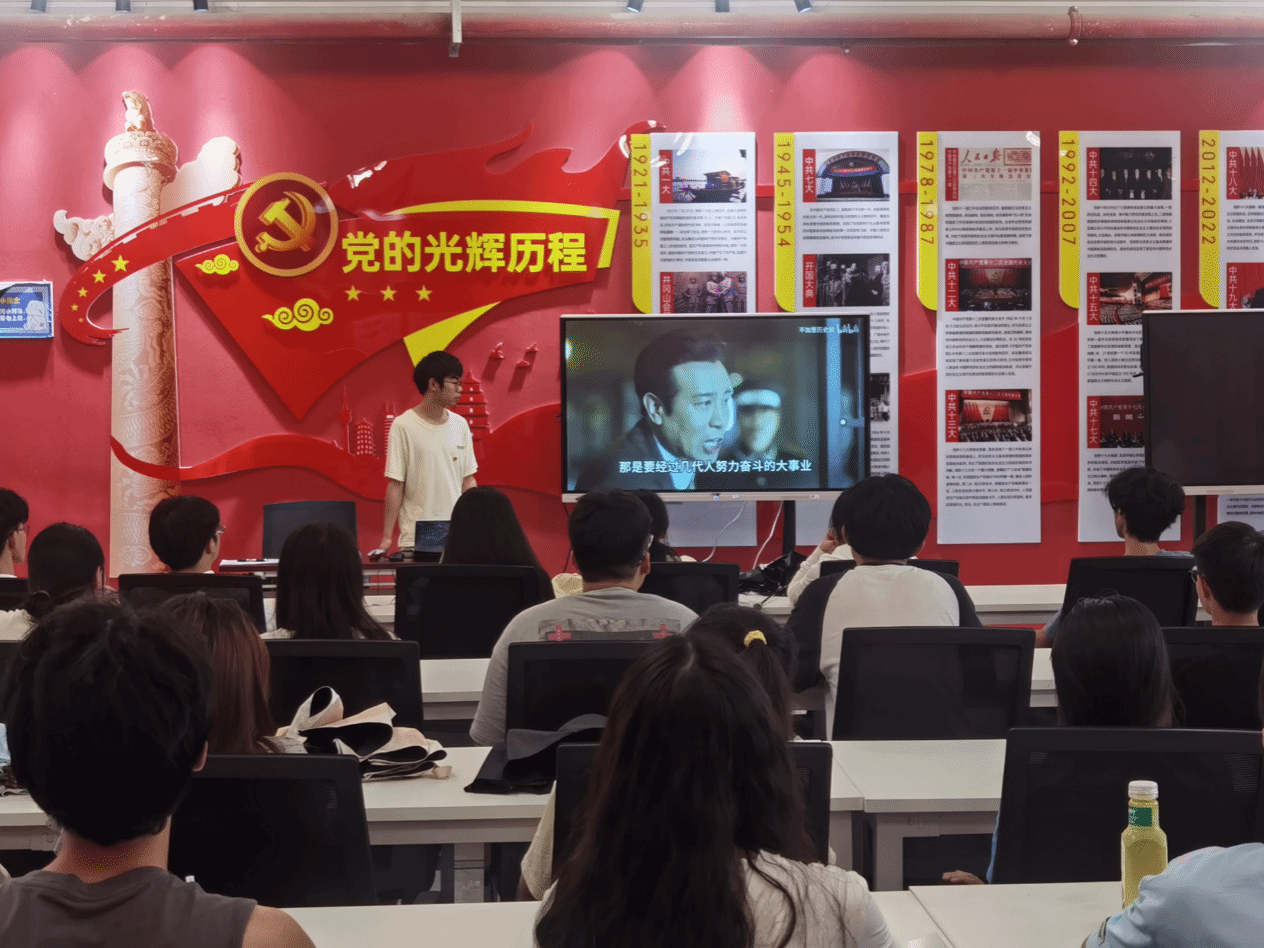 学生党员朱小军同志围绕活动主题,从党章的发展历程及其意义、党章的基本内容与框架、党章对入党积极分子的指导意义和要求等多方面进行讲解。同时,为了更直观呈现党章历程,增强学习效果,朱小军同志播放了一段名为 “百年党章”的视频。视频回顾了中国共产党章程的历史,特别提到了党的二大上通过的首部党章,标志着党有了自己的立党之本和政治行为规范。通过讲述张人亚等共产党员用生命捍卫党章和党员信念的故事,他们以实际行动践行了党章中的一个个关键词。