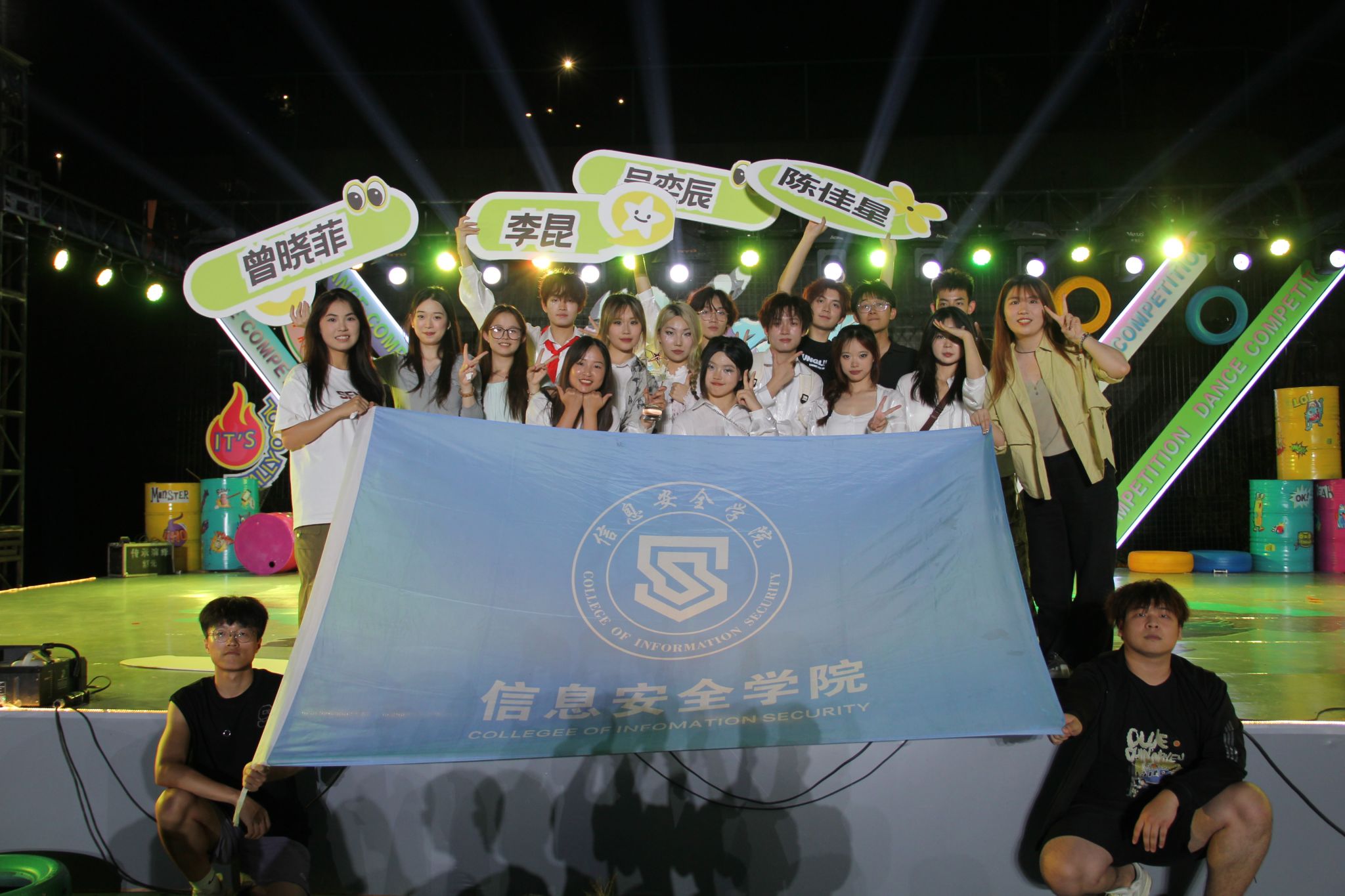 在颁奖仪式上,《是妈妈是女儿》与《Double Solo》以引人深思的主题、优美的舞姿以及饱满的情绪,赢得了三等奖。这一系列的荣誉不仅肯定了信息安全学院学子们的辛勤努力,更是对我们艺术造诣的认可,也凸显了信息安全学院在文化艺术领域的全面实力和显著成就。当天,学院领导、尊贵嘉宾以及师生们共同参与了这一盛典,共同分享这份喜悦。领导们对我院所取得的成绩表示祝贺,并对信息安全学院在文化艺术方面所取得的进步给予了高度赞赏。我院学生会干部轮流奋力挥举院旗,为我们的队伍摇旗呐喊,这份属于信安大家庭的浪漫在此刻拉到顶峰!