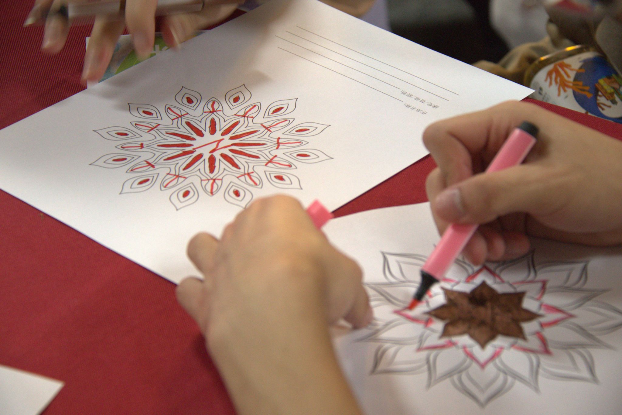 此外,我们还开展彩绘曼陀罗特色DIY活动,通过绘画时颜色的选择可以帮助参与者将自己的内心的压力和情绪外化出来,从而更好的理解和处理它们,而每一件完成的曼陀罗都是情感状态真实的反映,是内心世界独特的写照。希望能够在忙碌的生活节奏中,彩绘曼陀罗为同学们提供了一片宁静的避风港。
