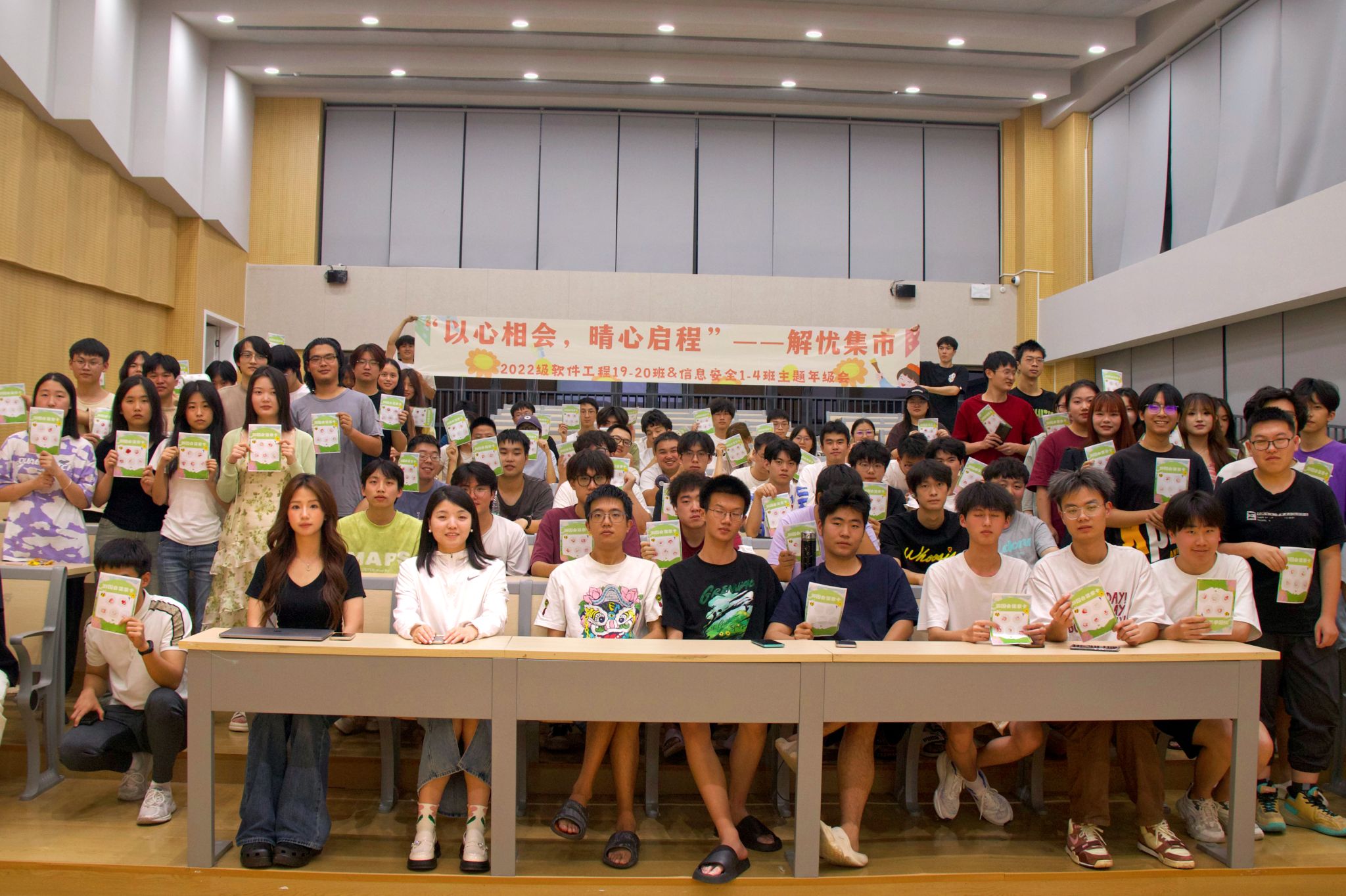 随着年龄和身体地不断增长,平日里不被重视的心理问题正在逐步成为大家学习和生活里挥之不去的阴霾。为推动 《“十四五”国民健康规划》,并落实响应自2024年确立的“全国学生心理健康宣传教育月”,进一步推动校园里的身心健康,关切同学们心灵,营造更加阳光开朗的校园生活环境。2022级信息安全1-4班、软件工程中本19-20班于5月24日在玉堂阶梯教室举办了“以心相会,晴心启程”主题年级会,以解忧集市摊点吸引同学们的目光,共赴一场“放飞心灵”的邀约。