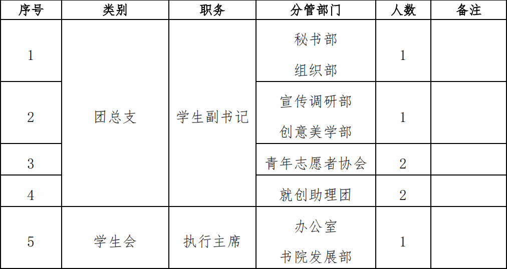 3.面试方式:干部招聘在新一届(任)学生组织学生副书记/执行主席候选人产生之后,领导小组根据报名情况,经过面试考核综合确定学生干部候选人名单并公示。包含演讲和答辩等程序。演讲包括简短的自我介绍、工作想法、部门发展,干部干事培养等方面;领导小组提问面试者进行回答,最终根据演讲和答辩的情况进行评分。