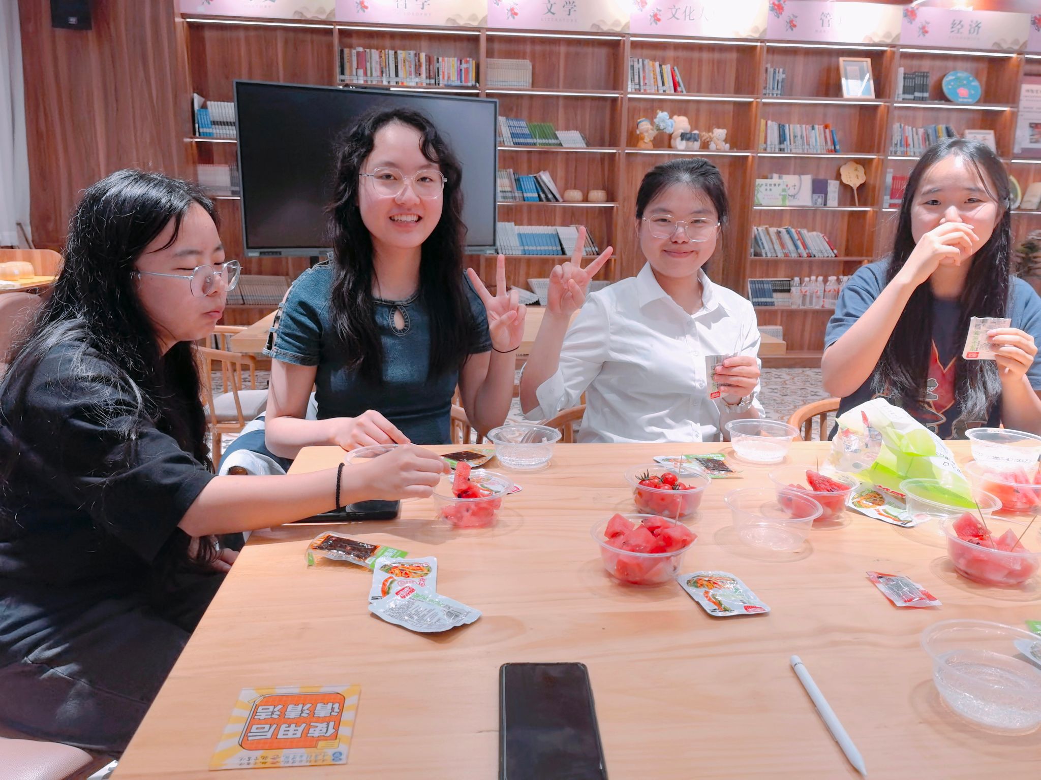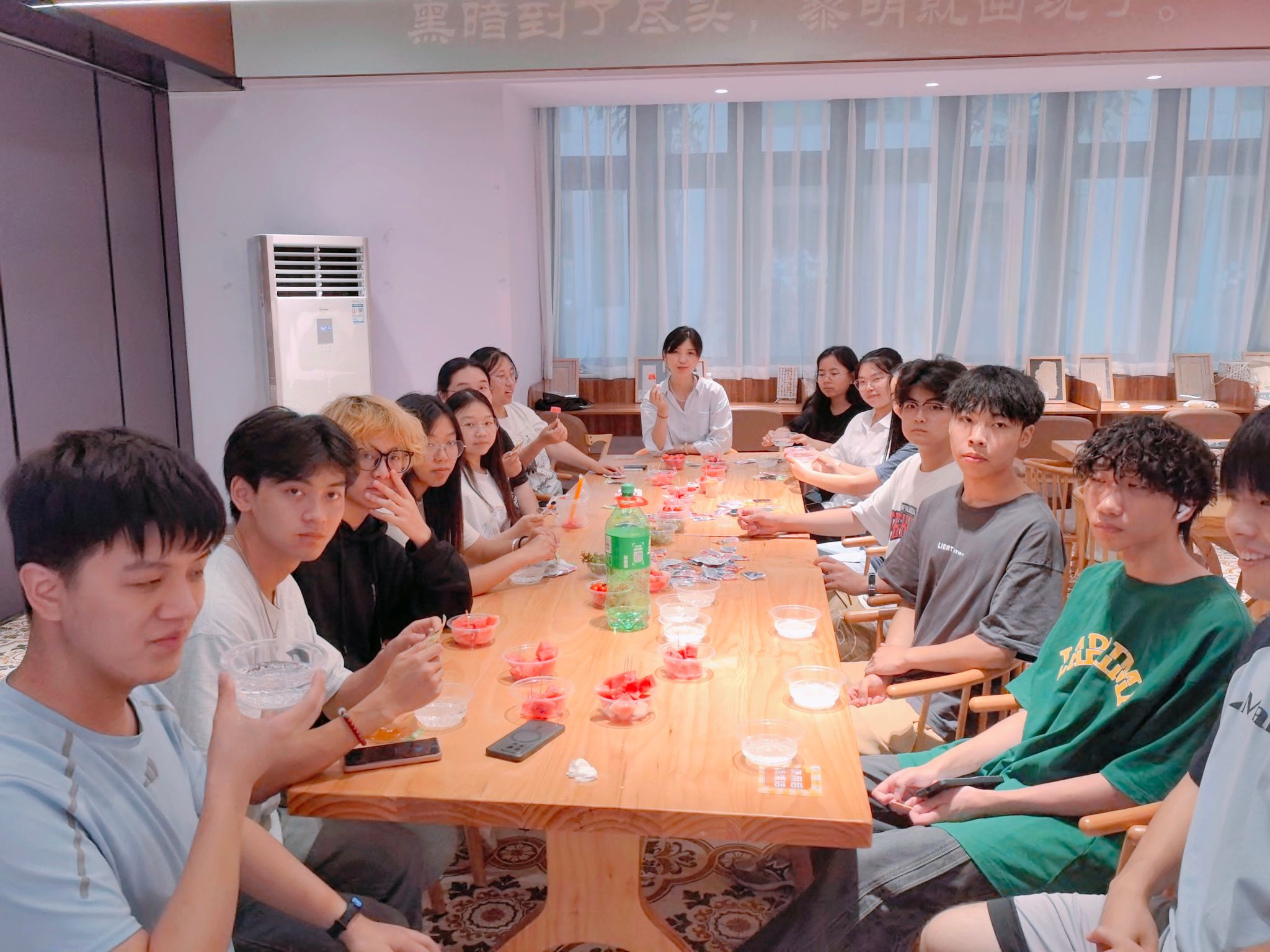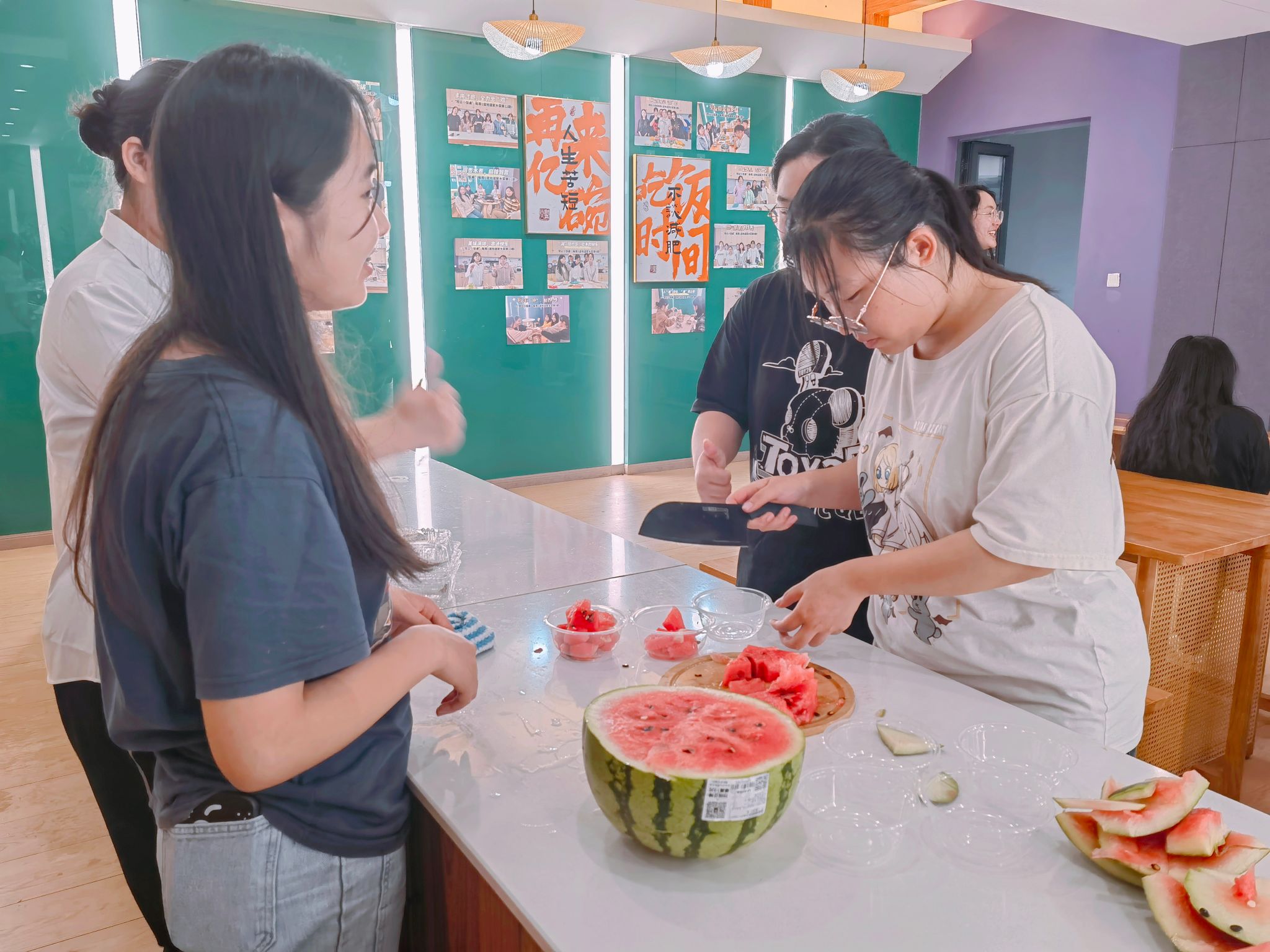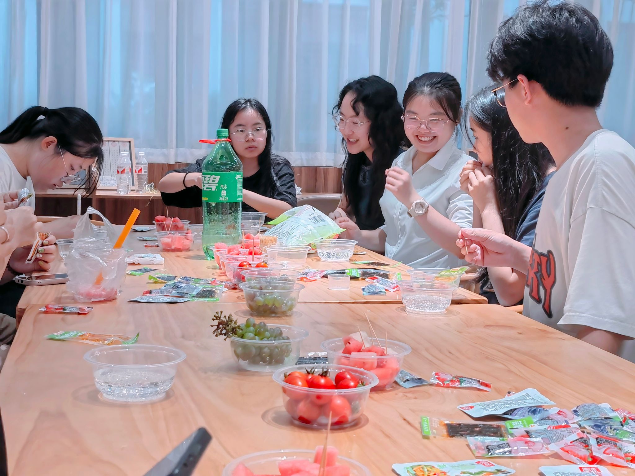 下一环节的期末见面会,异科导师彭丽珺老师给同学们带来了许多水果和零食,她和同学们一起清洗、装盘水果,在切西瓜的过程中,师生们不时地交流着,分享着彼此的生活趣事。笑声、谈话声此起彼伏,整个室内充满了温馨和欢乐的气氛。