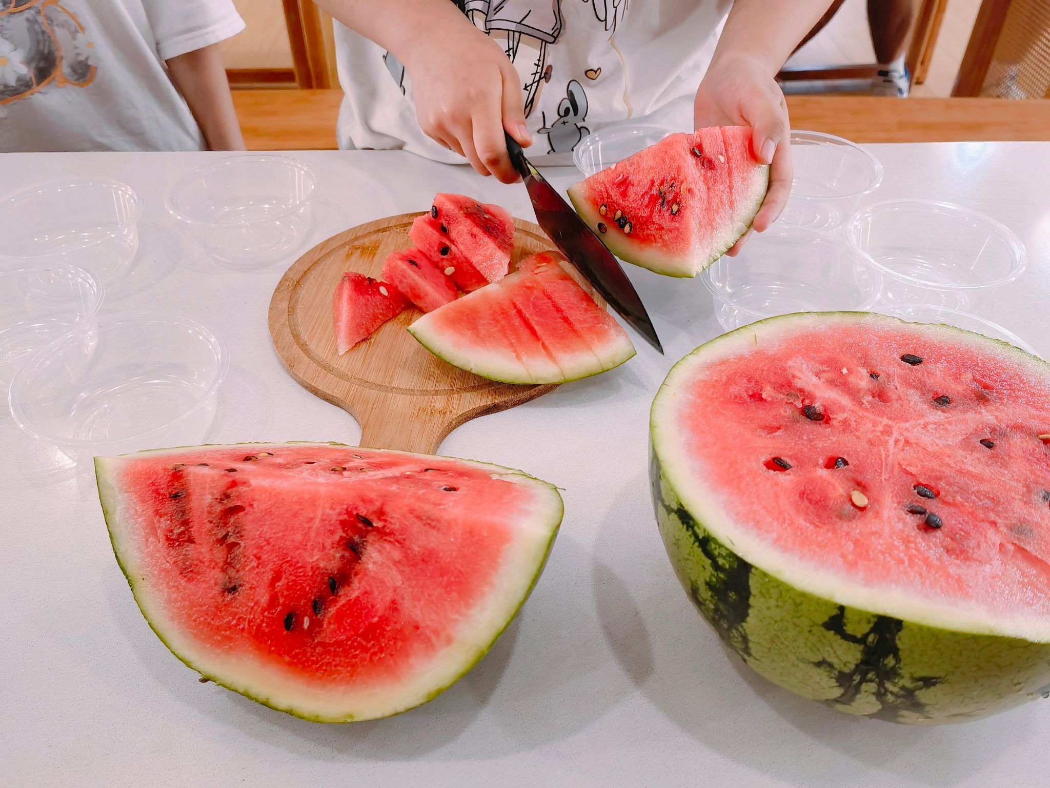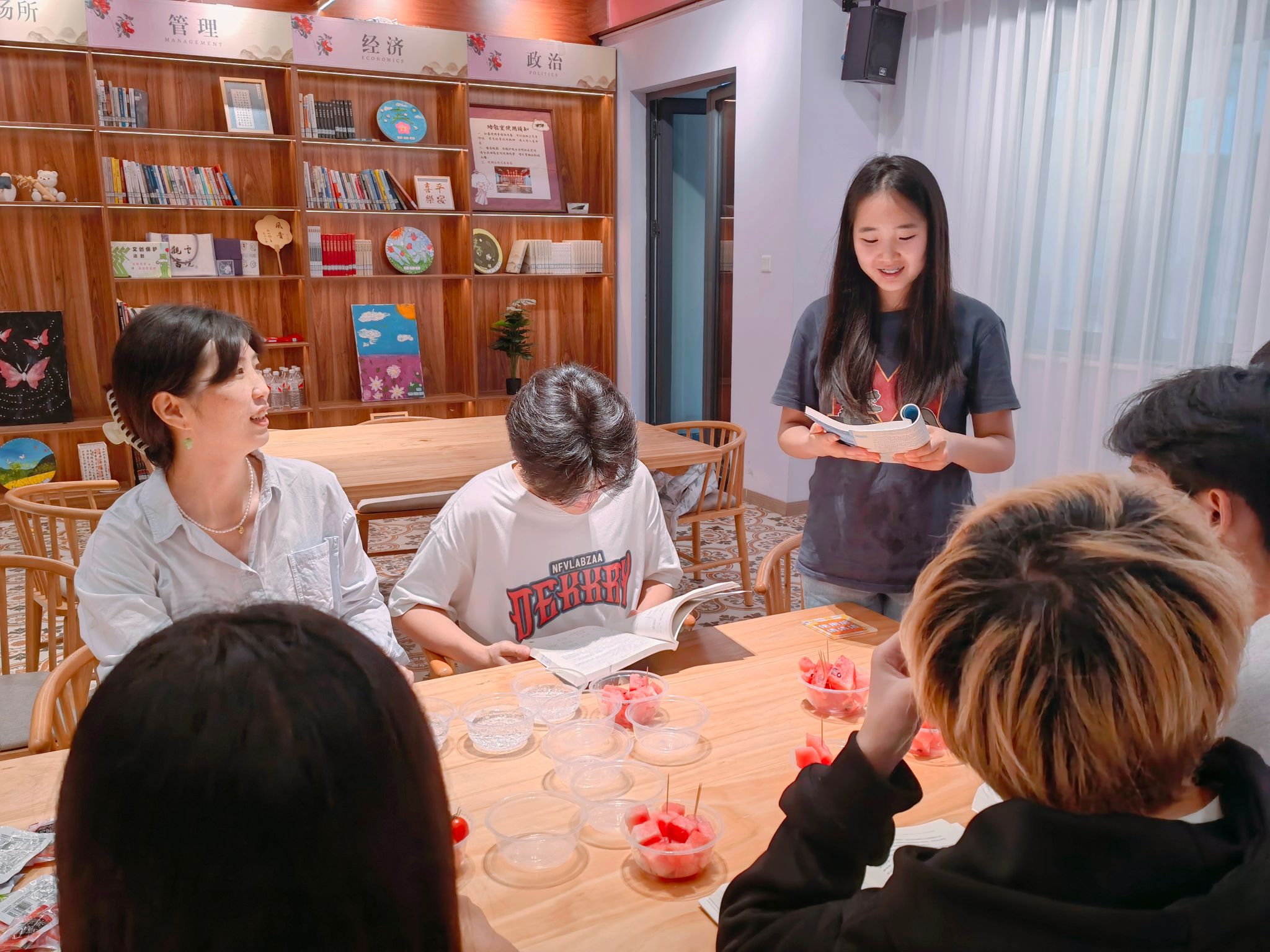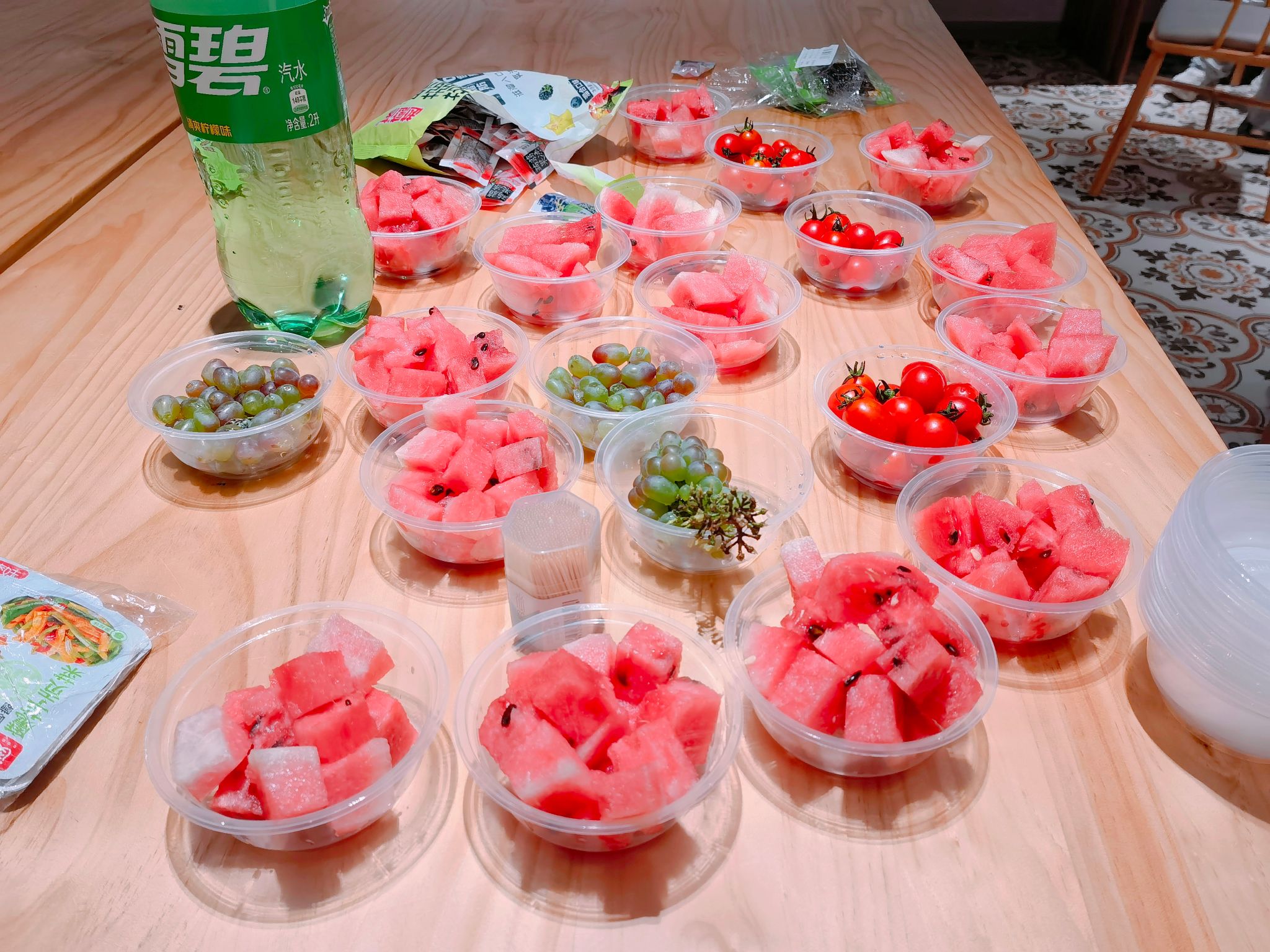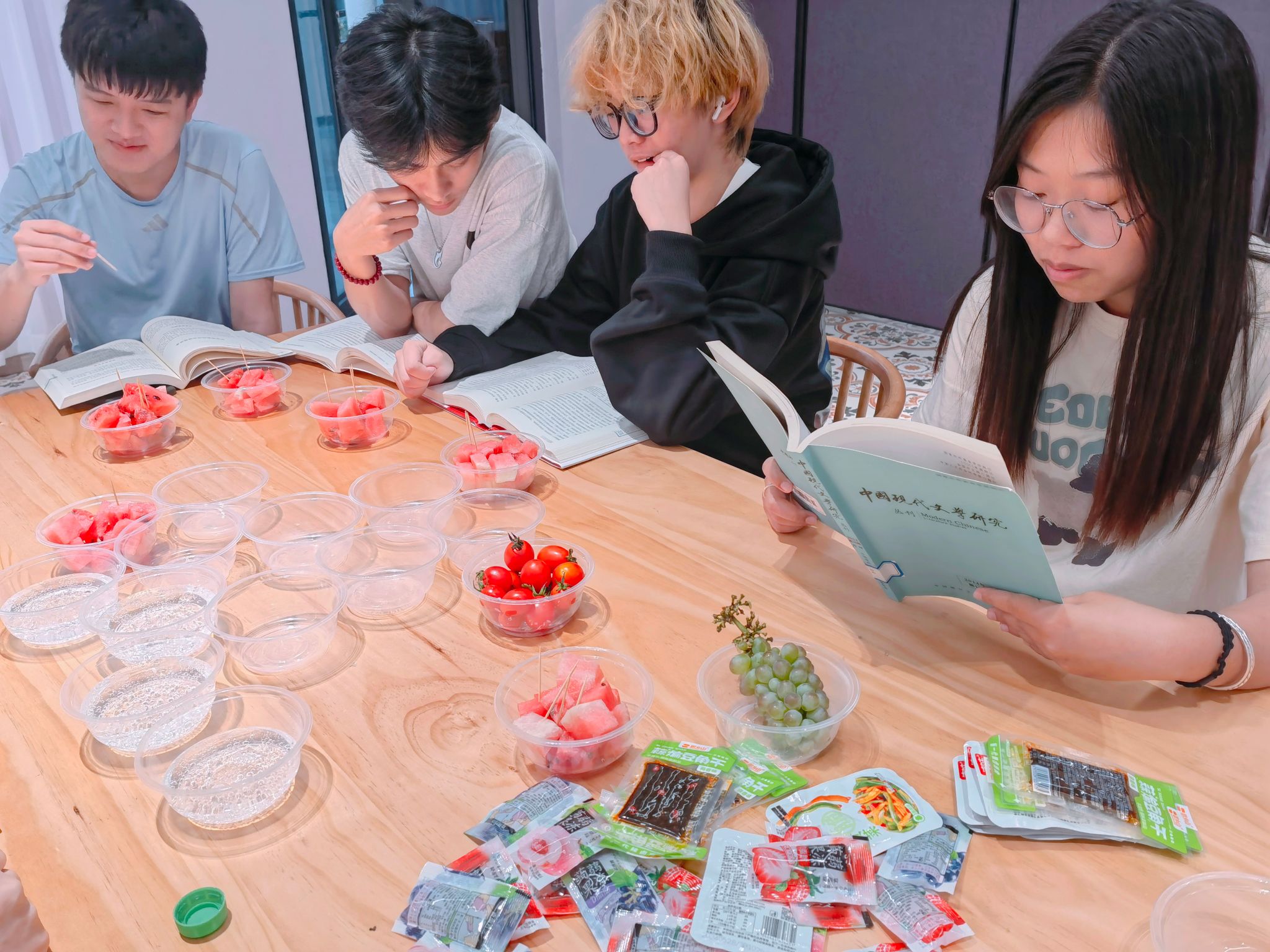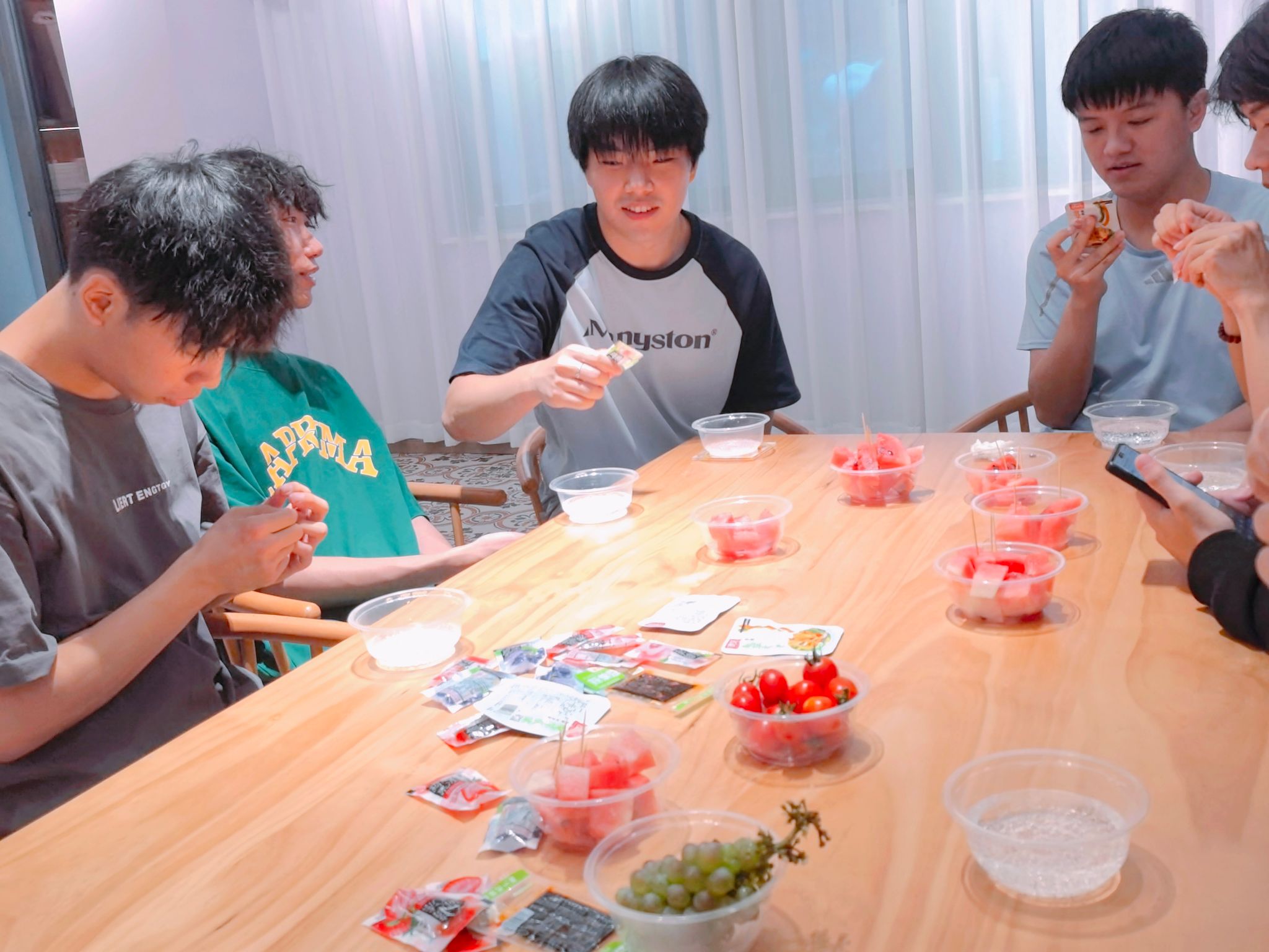 下一环节的期末见面会,异科导师彭丽珺老师给同学们带来了许多水果和零食,她和同学们一起清洗、装盘水果,在切西瓜的过程中,师生们不时地交流着,分享着彼此的生活趣事。笑声、谈话声此起彼伏,整个室内充满了温馨和欢乐的气氛。