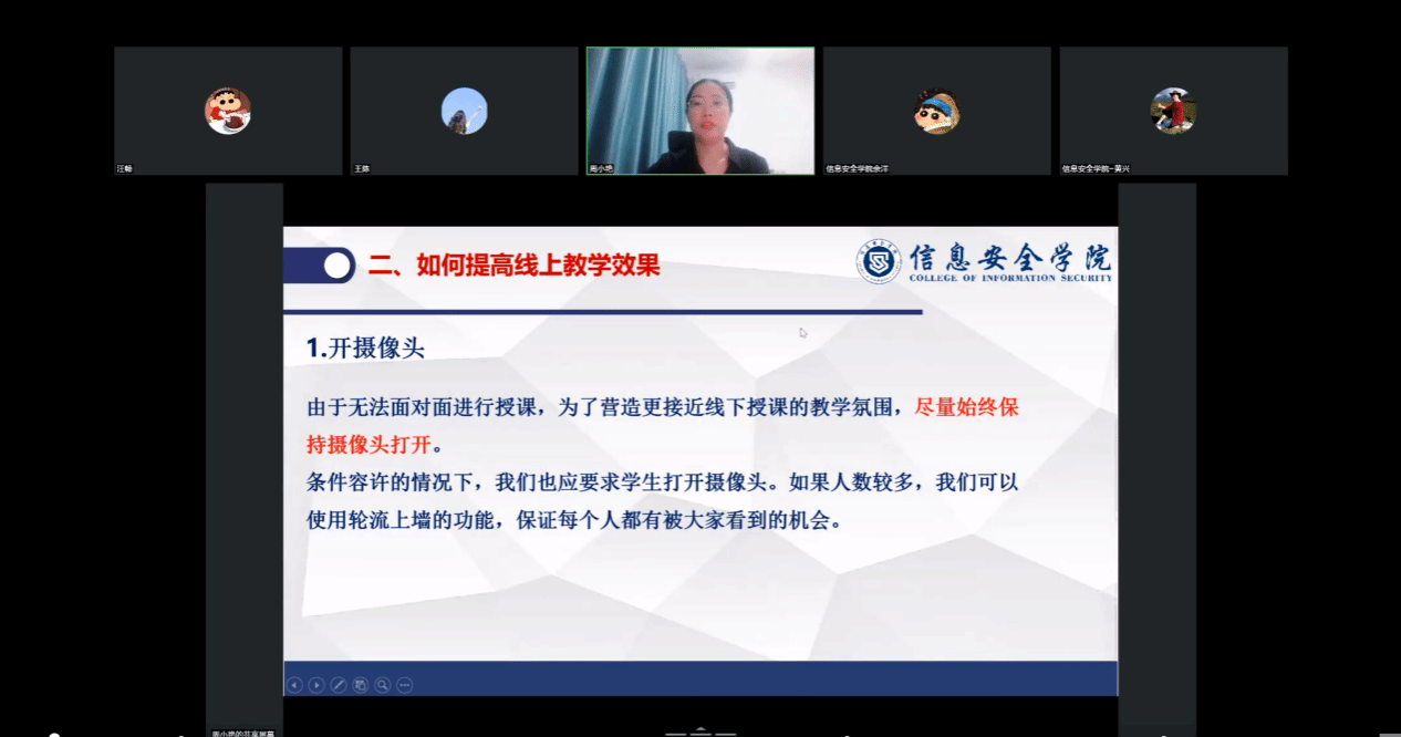 会上,周小艳院长对新学期教学工作进行了全面细致的部署,详细阐述了线上教学前的各项准备工作,从平台选择、资料准备到资源整合,每一步都力求精益求精,确保每位教师都能顺利适应并高效利用线上教学环境。同时,她还分享了提升线上教学效果的宝贵经验,并利用雨课堂和点名神器等智慧工具为大家演示了如何增加互动的有效性和趣味性,最后进一步强调了线上教学评价与反馈的重要意义。她谈到,线上教学作为应对近期高温天气之策,相比线下课堂教学,学生的学习效果受网络和环境的影响更大,因此对教师也提出了更高的要求,她鼓励全体教师投入更多心思,从课程设计、互动方式、学习评估等多个维度进行思考,以克服线上教学的局限性,保证教学效果。