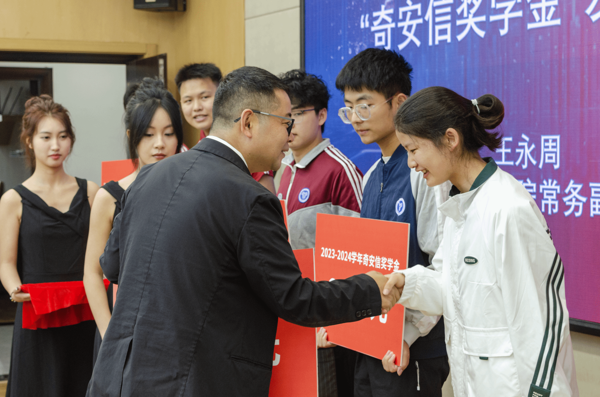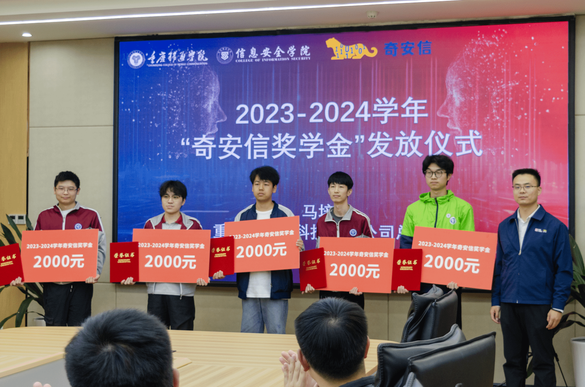 紧接着,激动人心的助学金颁发环节上演,一众杰出学子逐一登台,从学院领导和奇安信领导手中接过助学金,并在镜头前留下了珍贵的合影,这份荣誉不仅是对他们过往努力的认可,更是对未来潜力的无限期许。