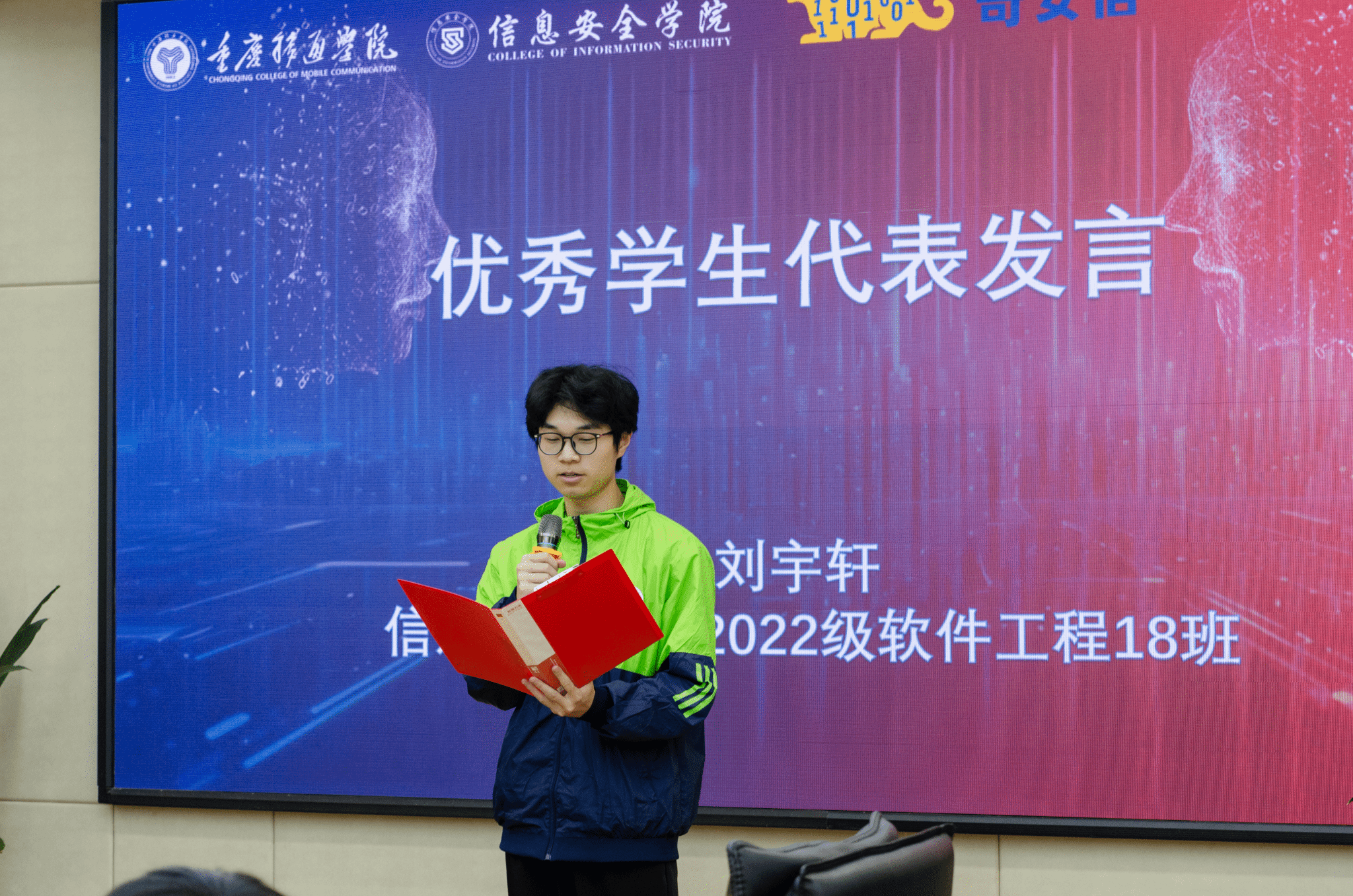 颁奖后,优秀学生代表刘宇轩上台致辞,他首先对奇安信公司的慷慨资助表达了诚挚的谢意,随后分享了自己的学习心得与未来规划,其清晰的职业规划与昂扬的学习态度赢得了在场师生的广泛赞誉。