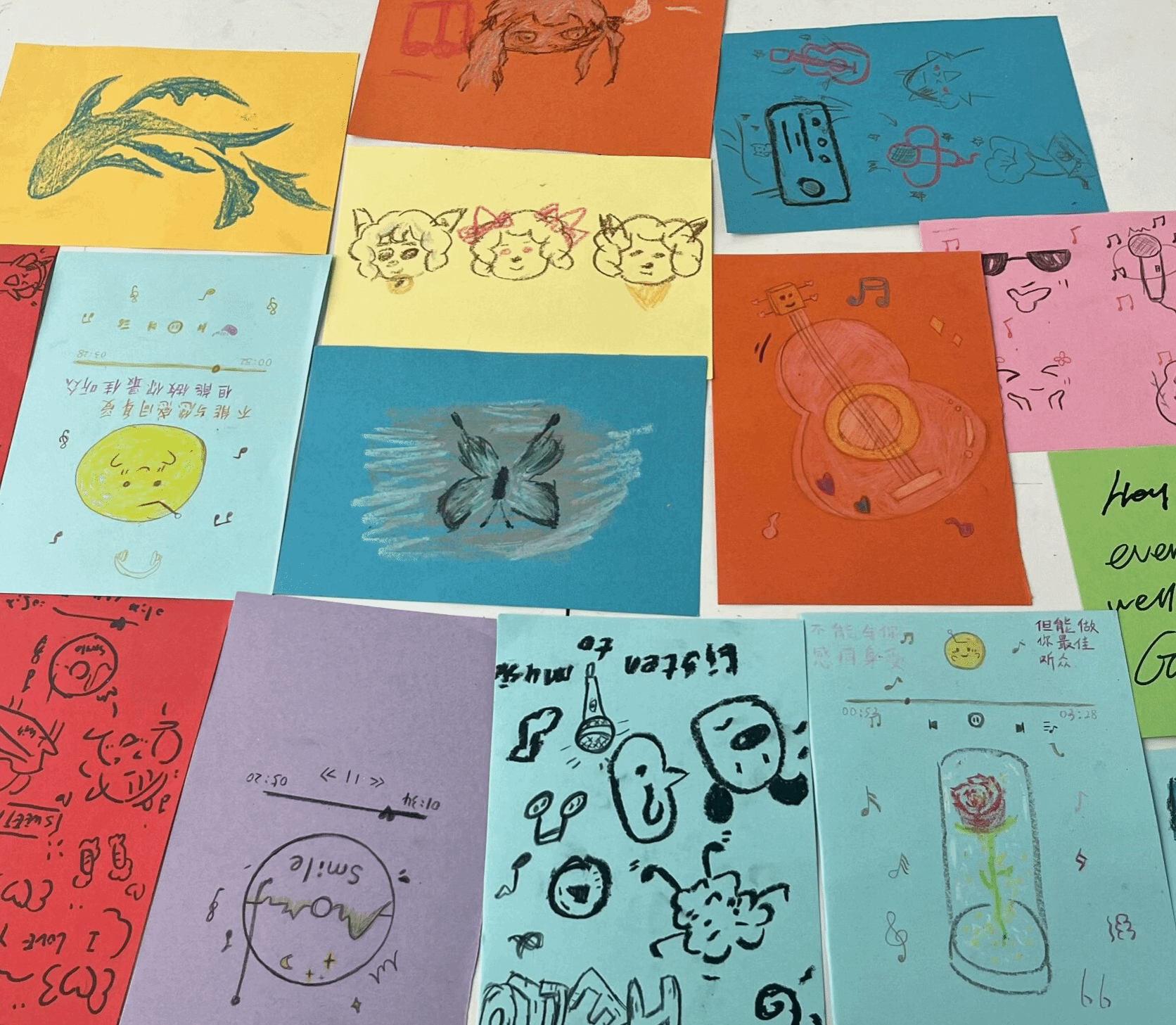 活动场地内,各式充满创意的画作映入眼帘,这些作品以圆形、半圆形等多样的音符形态为主角,有的用鲜艳色彩热烈勾勒,充满活力;有的则以柔和的色调,温柔而抒情。这些大小不一、布局错落有致的音符作品,超越了单纯装饰的功能,它们成为了无声的语言,引导着每位观众走进一个充满奇妙的音乐世界。漫步其中,每个人的目光都不由自主地被这些灵动的音符所吸引,触动着每个人心底的音乐情怀。