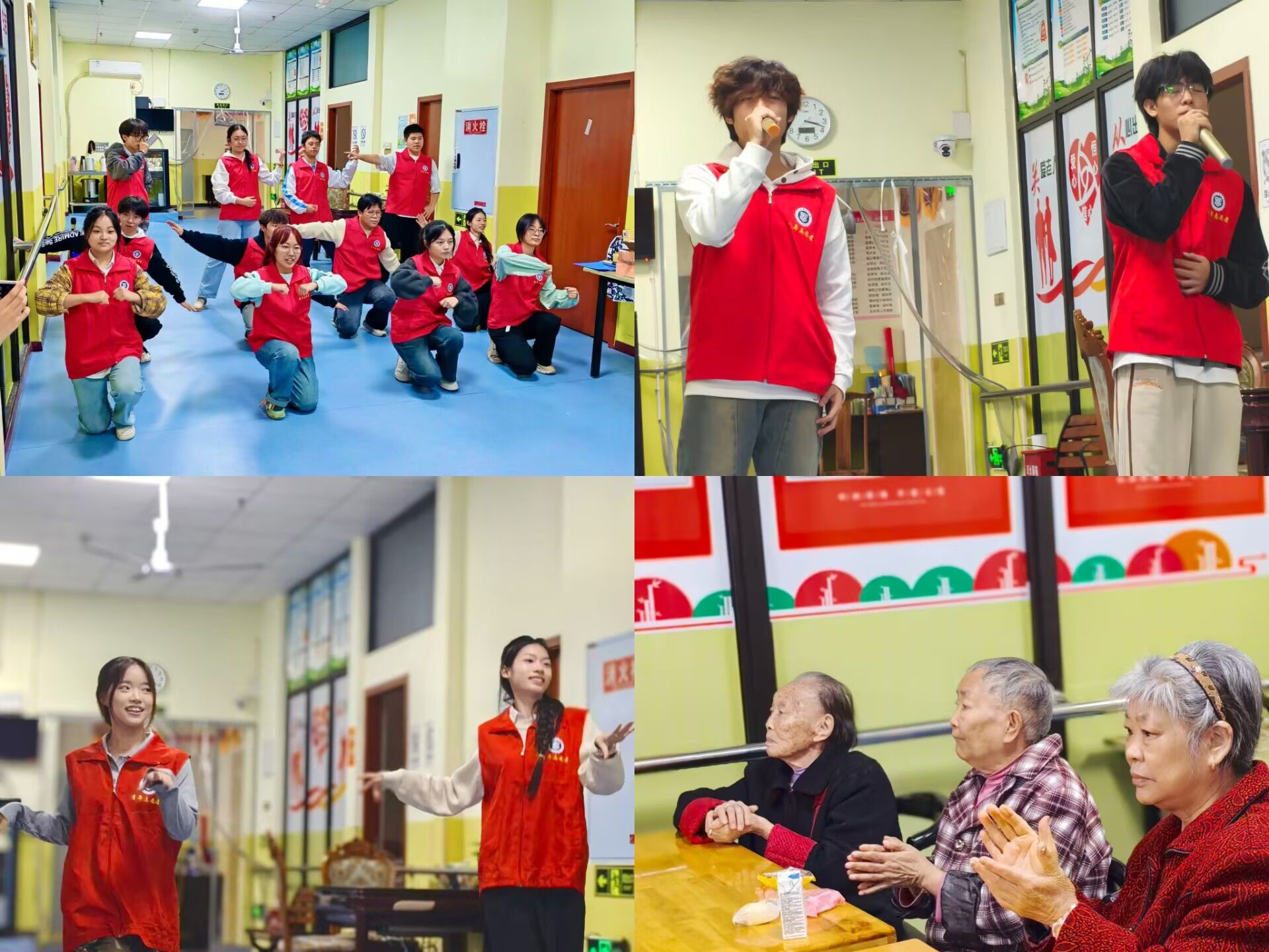 活动伊始,志愿者身着红色志愿服在负责人的带领下乘坐公交车前往千家福敬老院,红色志愿服承载着志愿者的热情与无私奉献的精神。当志愿者抵达千家福敬老院,在负责人与敬老院工作人员交接后,志愿者就开始布置表演现场并引领老人们到达指定位置观看志愿者的节目表演。