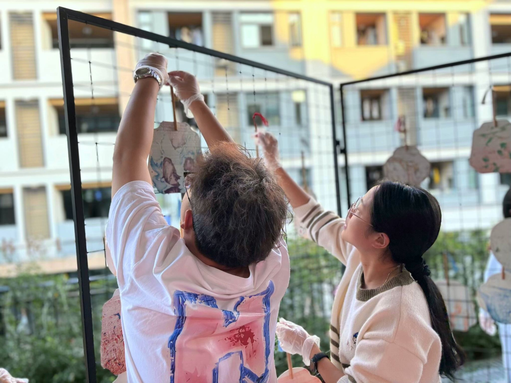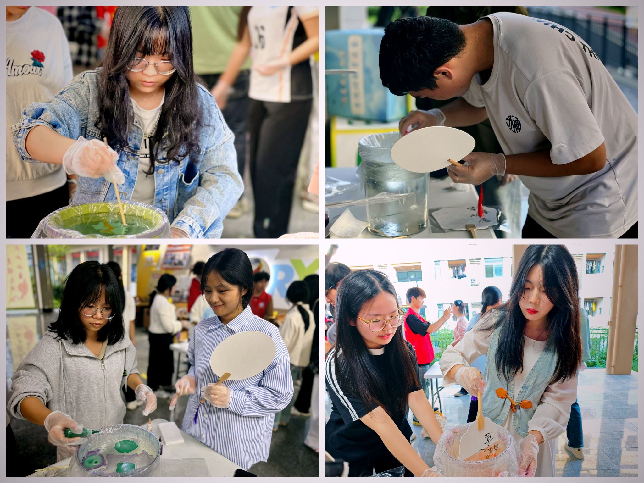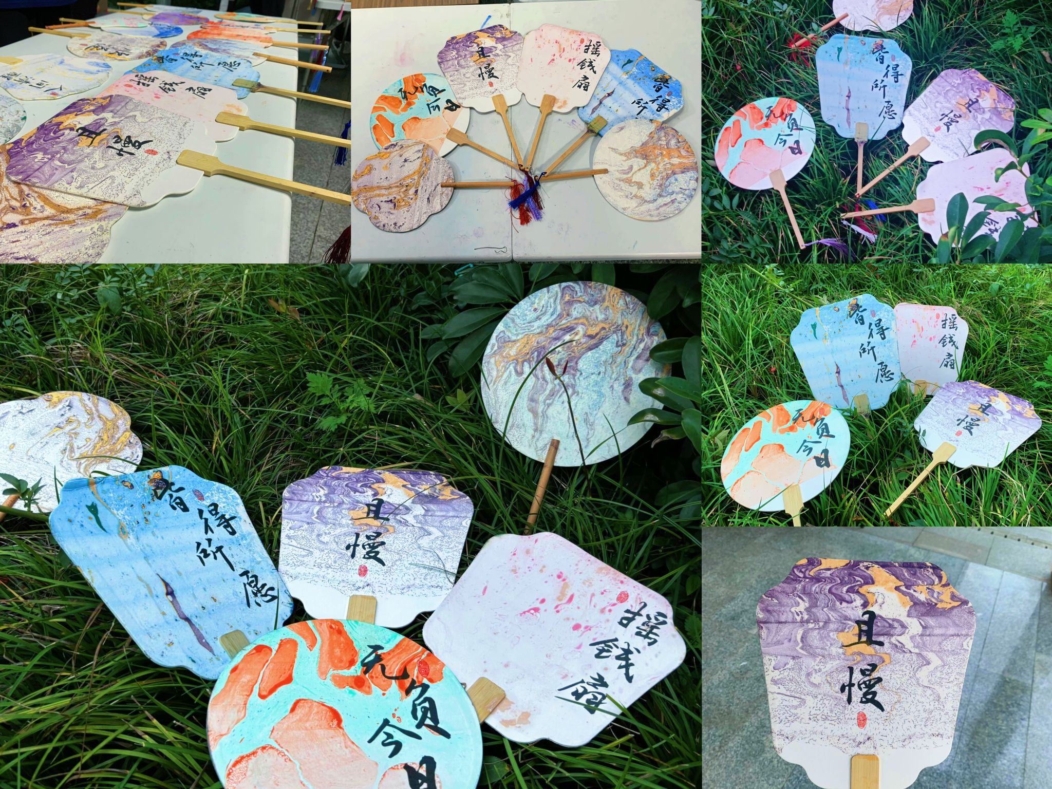 参与者亲自动手之际,一张张面容难掩兴奋之情,一颗颗心脏紧张而又激动。在主持人和志愿者的悉心指导下,参与者将颜料缓缓倒入水中,用筷子轻轻搅拌,直致相互交融。一把把漆扇从水中取出,古典雅致的气息瞬间扑面而来。每一把漆扇皆独具特色,参与者将对传统非遗文化的深刻理解与感悟融入每一抹色彩之中,展现出中国传统文化的意境之美。
