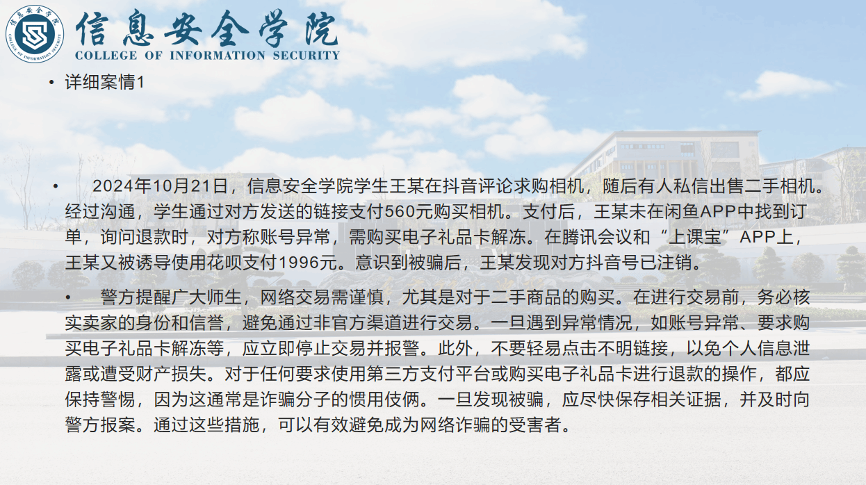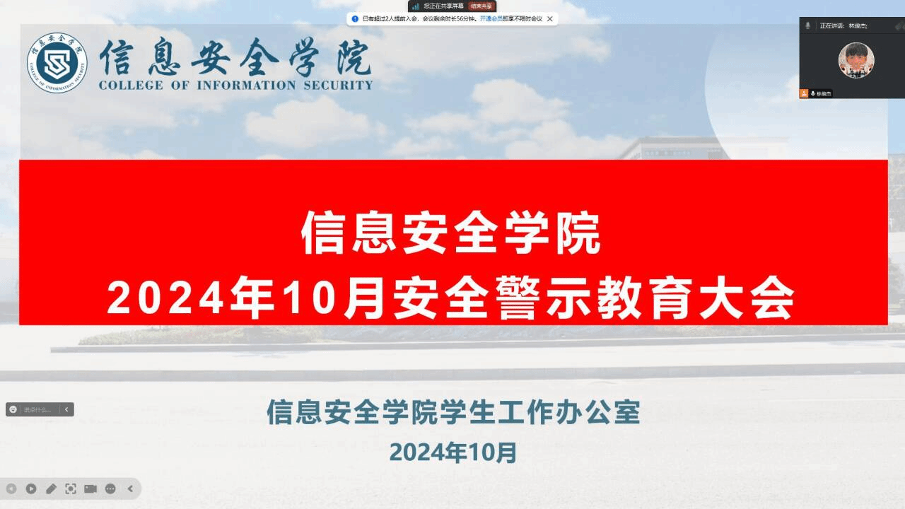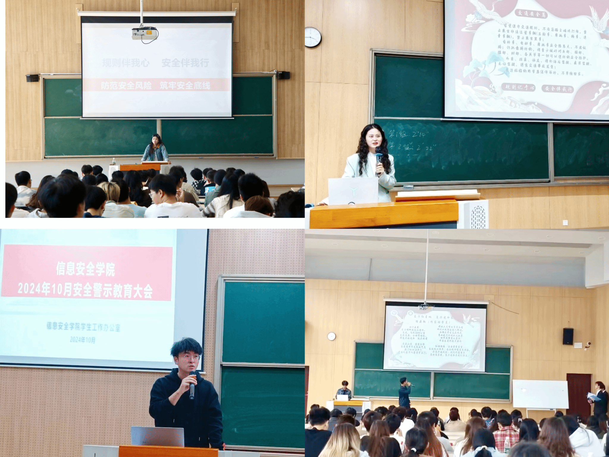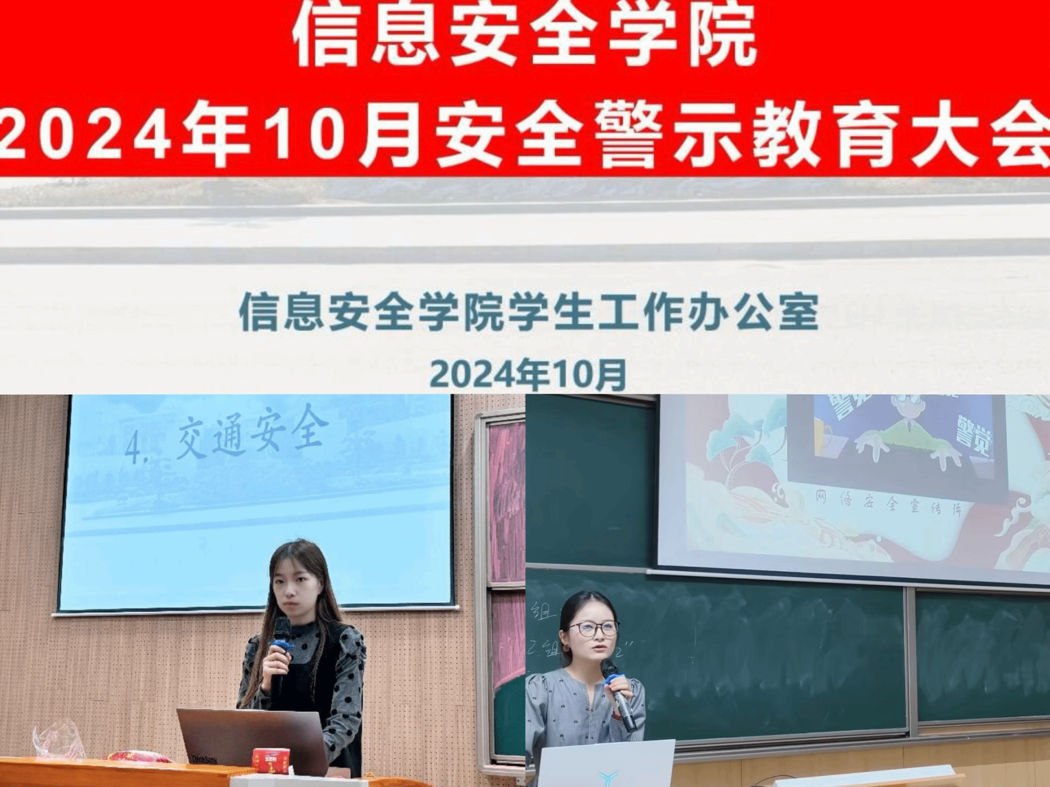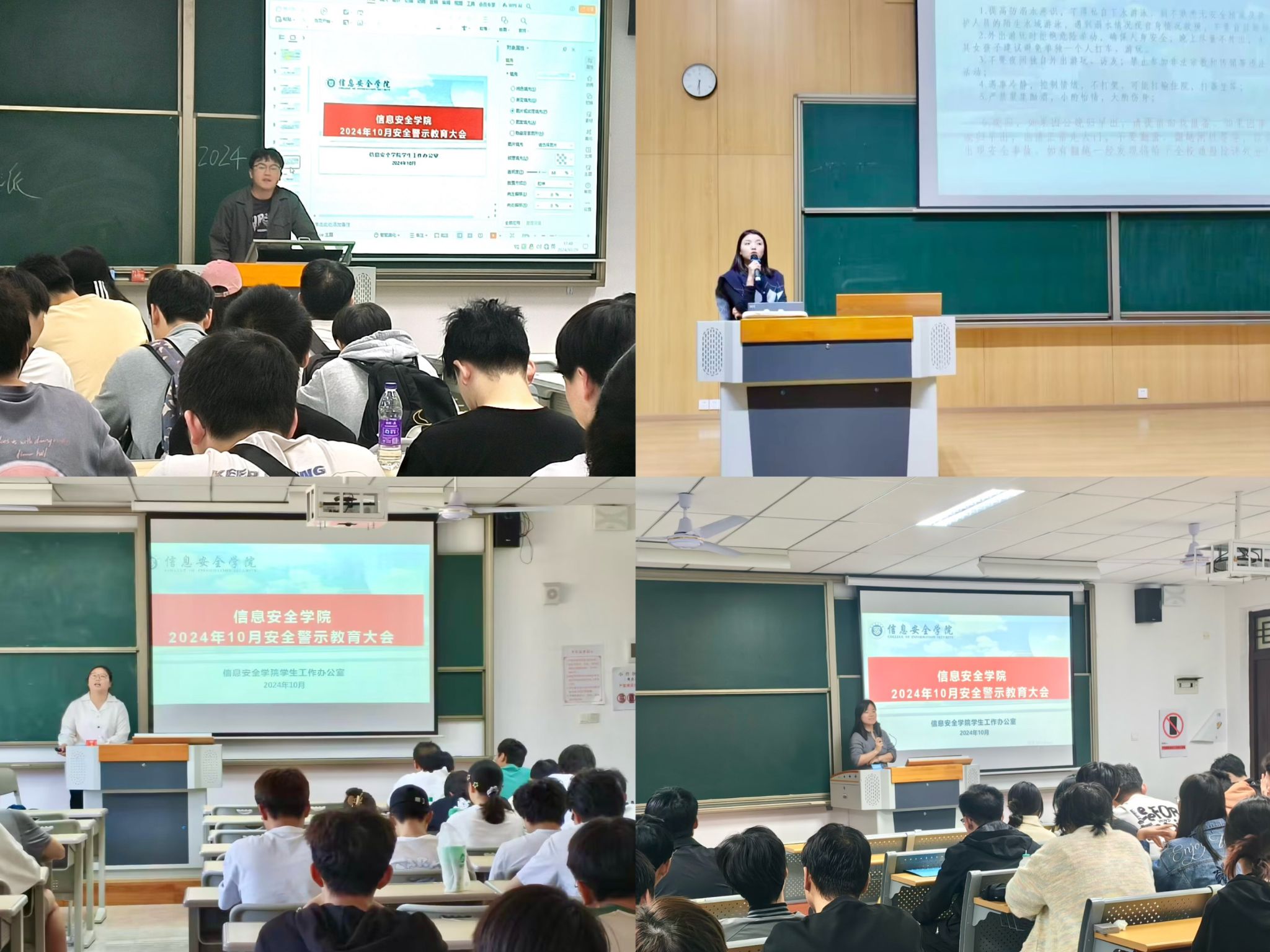 “安全重于泰山,警钟长鸣心间”,为进一步加强学生信息安全意识,提升防诈骗能力,信息安全学院全体老师积极响应学校号召,于10月份利用线下线上相结合的方式,组织开展安全警示教育大会。此次活动旨在通过多渠道、多形式的警示教育活动,师生共同构筑坚实的校园反诈防线,营造更加安全、和谐的校园生活。