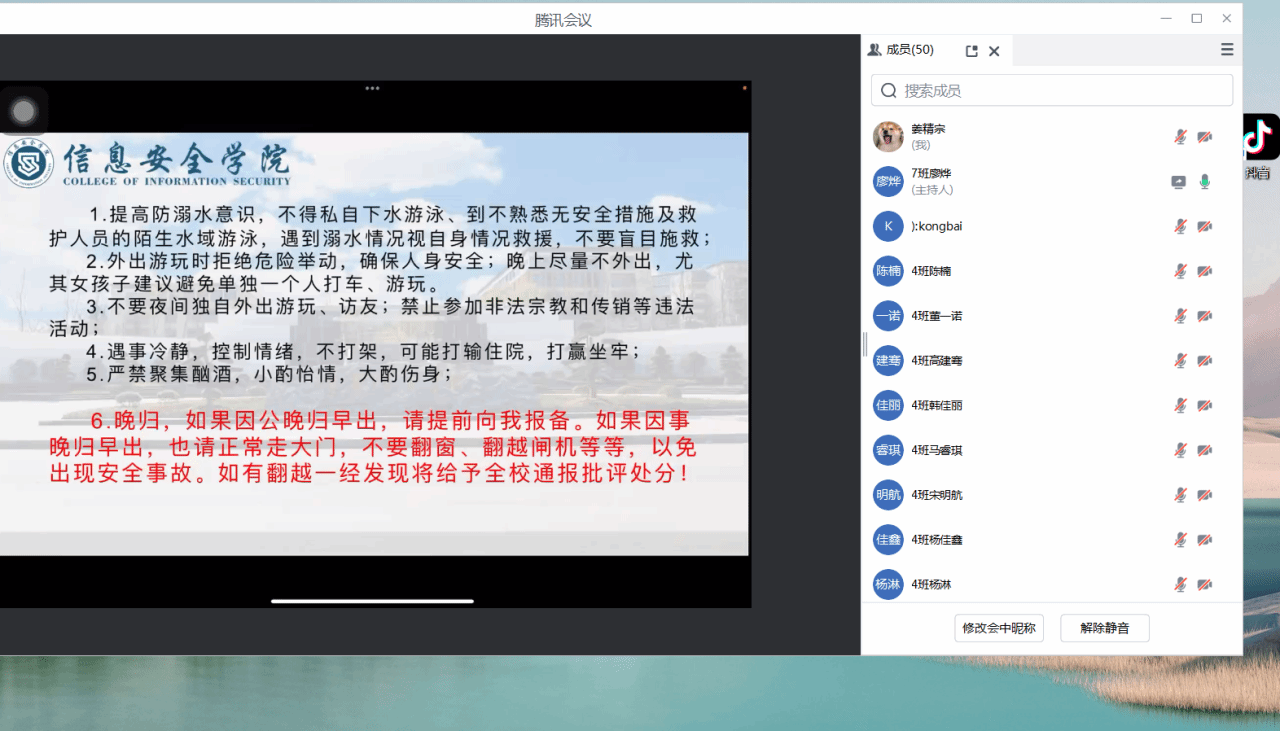 学生们线上集合,准时观看辅导员讲解信安反诈课程。这次课程是围绕“财产安全、交通安全、消防安全、网络安全及反贷防诈”等多个方面,向同学们普及安全知识,提高学生们的防范意识。在整个过程中,同学们表现出极高的专注度和学习热情。他们认真听讲,不时记录重点,甚至有些同学还主动提问,与辅导员进行互动交流。