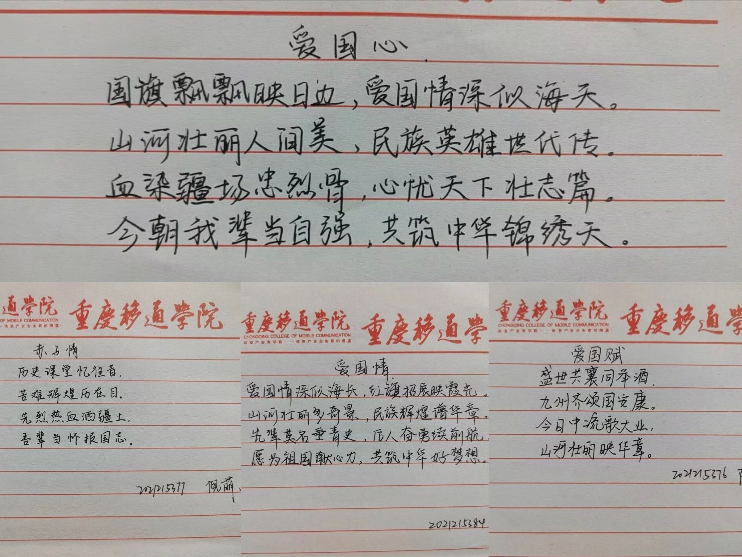 15日至17日,2022级软件工程13-18班与2021级网络工程1-2班&物联网工程1-4班共430余名同学被邀请提交一份以“爱国教育”为主题的诗词。大家纷纷挥毫泼墨,用文字表达者对祖国的深情厚谊。这些诗词有的慷慨激昂,抒发着对祖国的无限热爱;有的温婉细腻,从细微之处诉说着对祖国的绵绵情意。