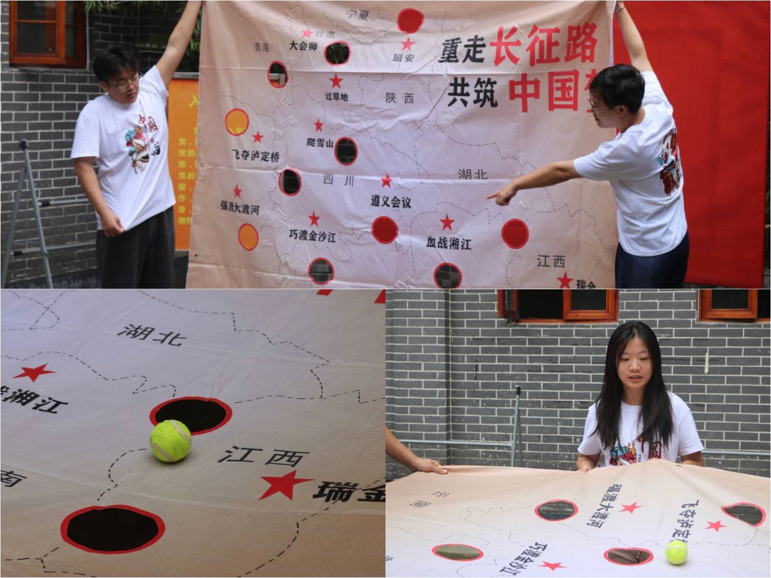 参观结束后,同学们积极参与到“重走长征路”与“共绘中国地图”两个团队协作游戏中。在“重走长征路”游戏中,大家齐心协力,让小球在长征路线图上从江西瑞金启程,沿途经过各个重要历史事件发生地,最终抵达陕西延安。这一过程中,同学们不仅重温了长征的艰辛与伟大,更深刻体会到了团队协作的不可或缺。而在“共绘中国地图”游戏中,面对被打乱的中国地图拼图,蒙眼的同学依靠队友的指引,共同完成拼图任务。这一挑战不仅检验了同学们之间的默契与协作能力,也让大家对中国疆域的辽阔和祖国的伟大有了更加直观而深刻的认识。