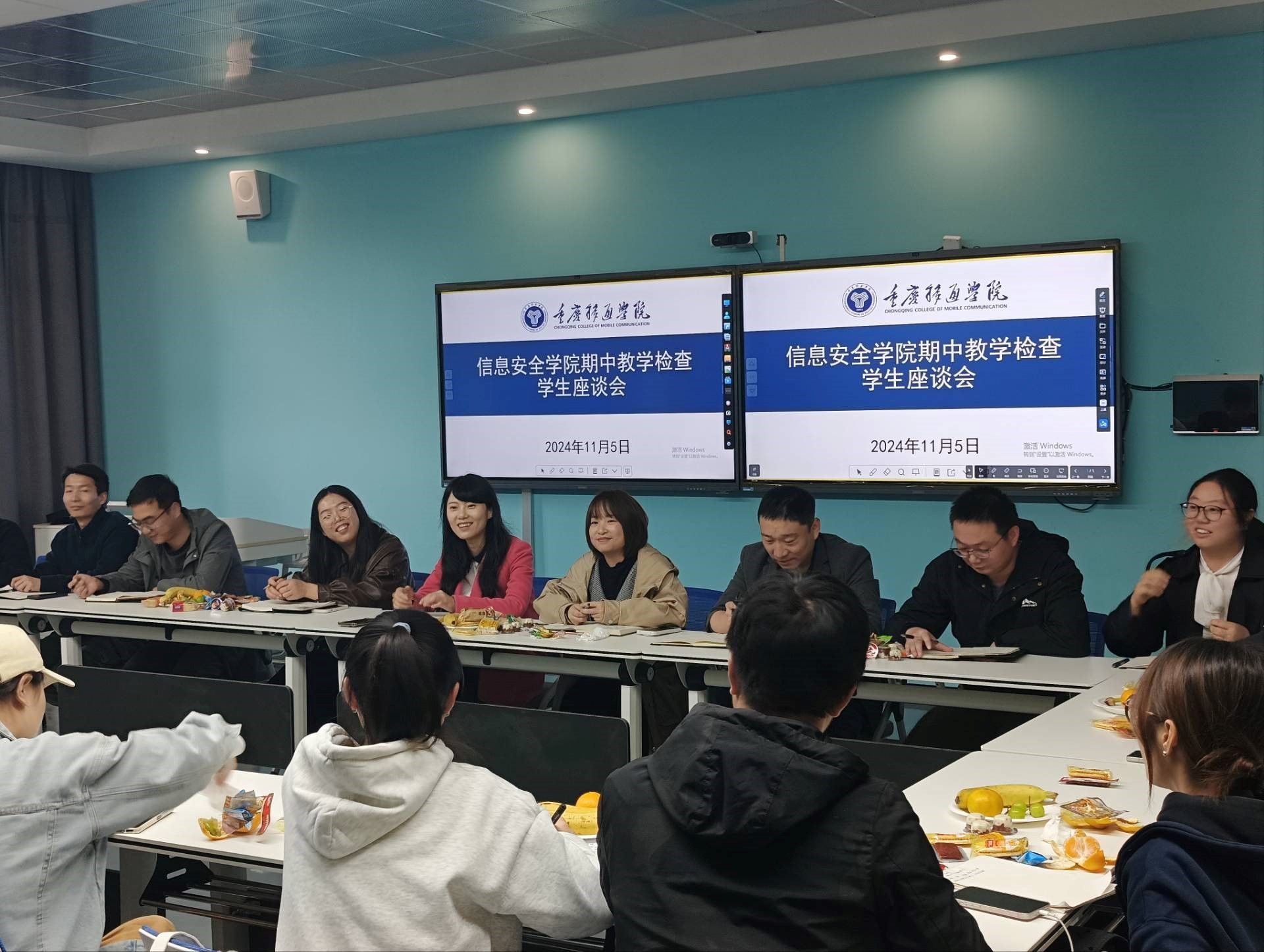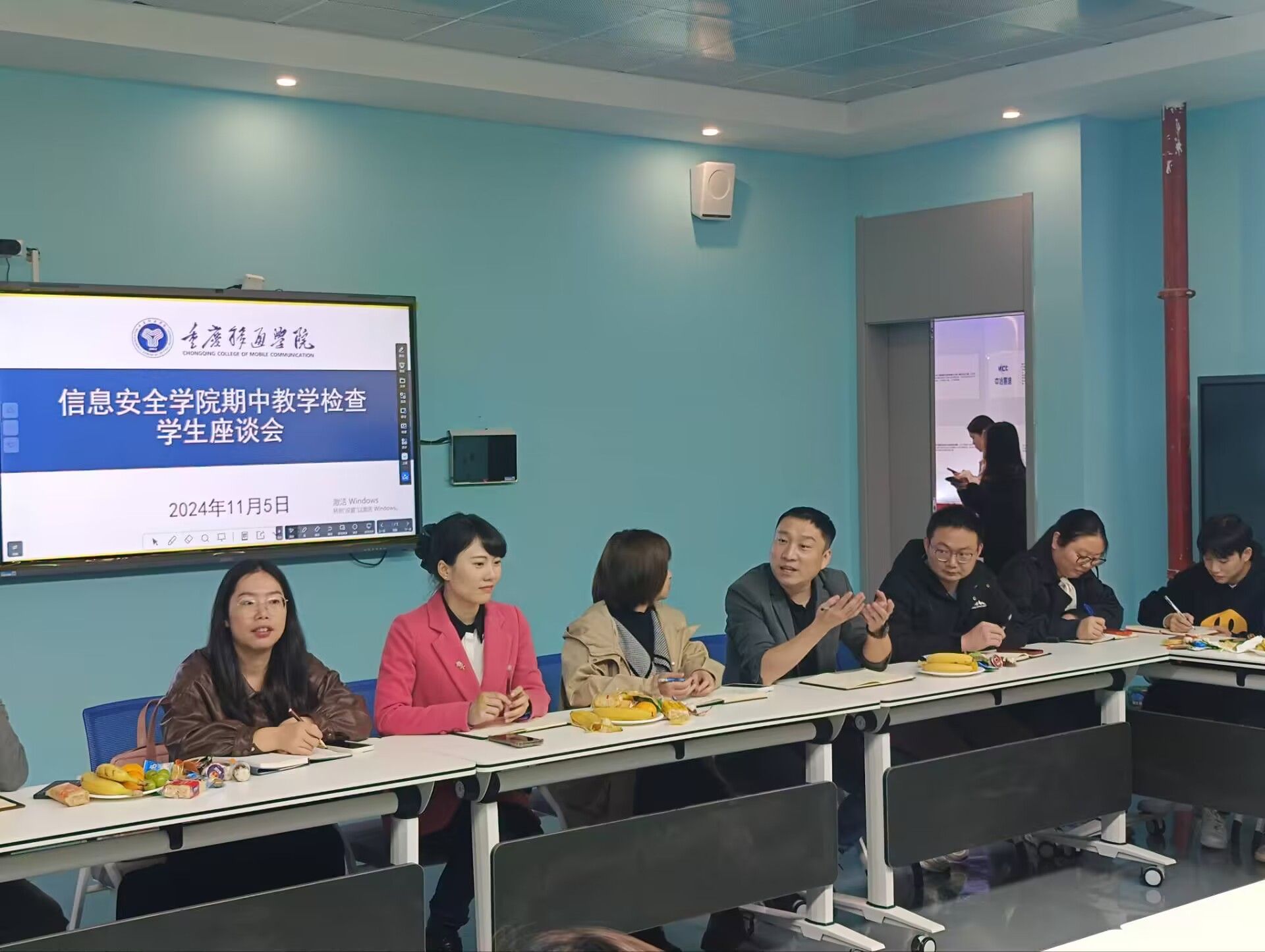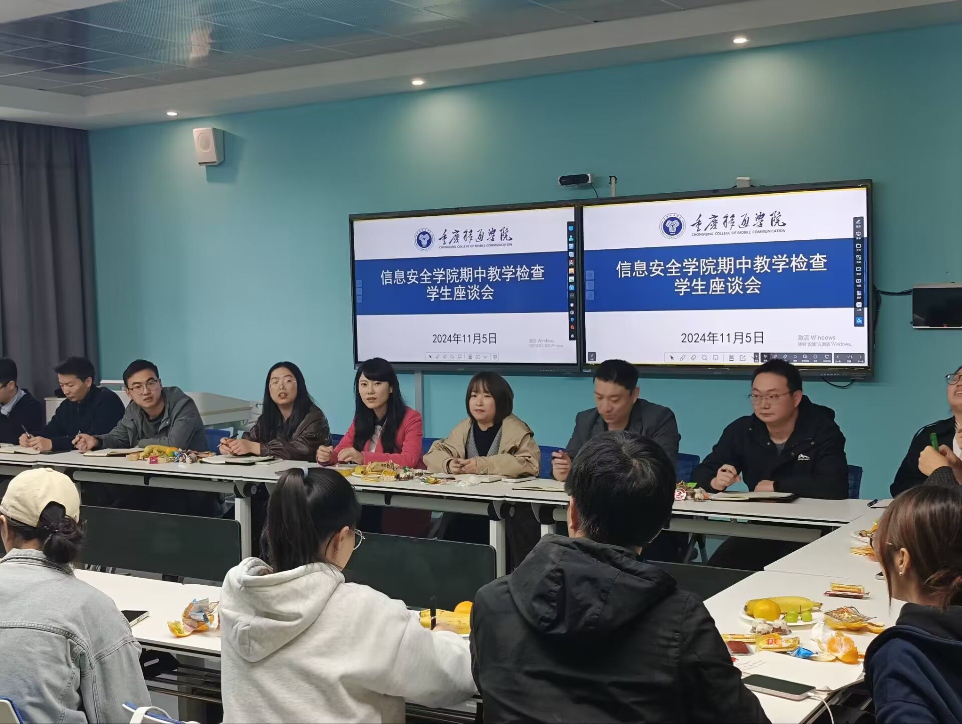 为进一步规范教学行为,强化教学管理,保证教学质量,营造良好的教风、学风,根据重庆移通学院《教学检查制度》文件要求及学校工作安排,信息安全学院于2024年11月5日12:30,在贤者楼217组织召开期中教学检查学生座谈会。信息安全学院院长王宁,学工副院长尹金维,代理教学副院长周小艳及各教研室主任、教师代表、各专业学生代表出席,会议由学院学工办主任邹健主持。