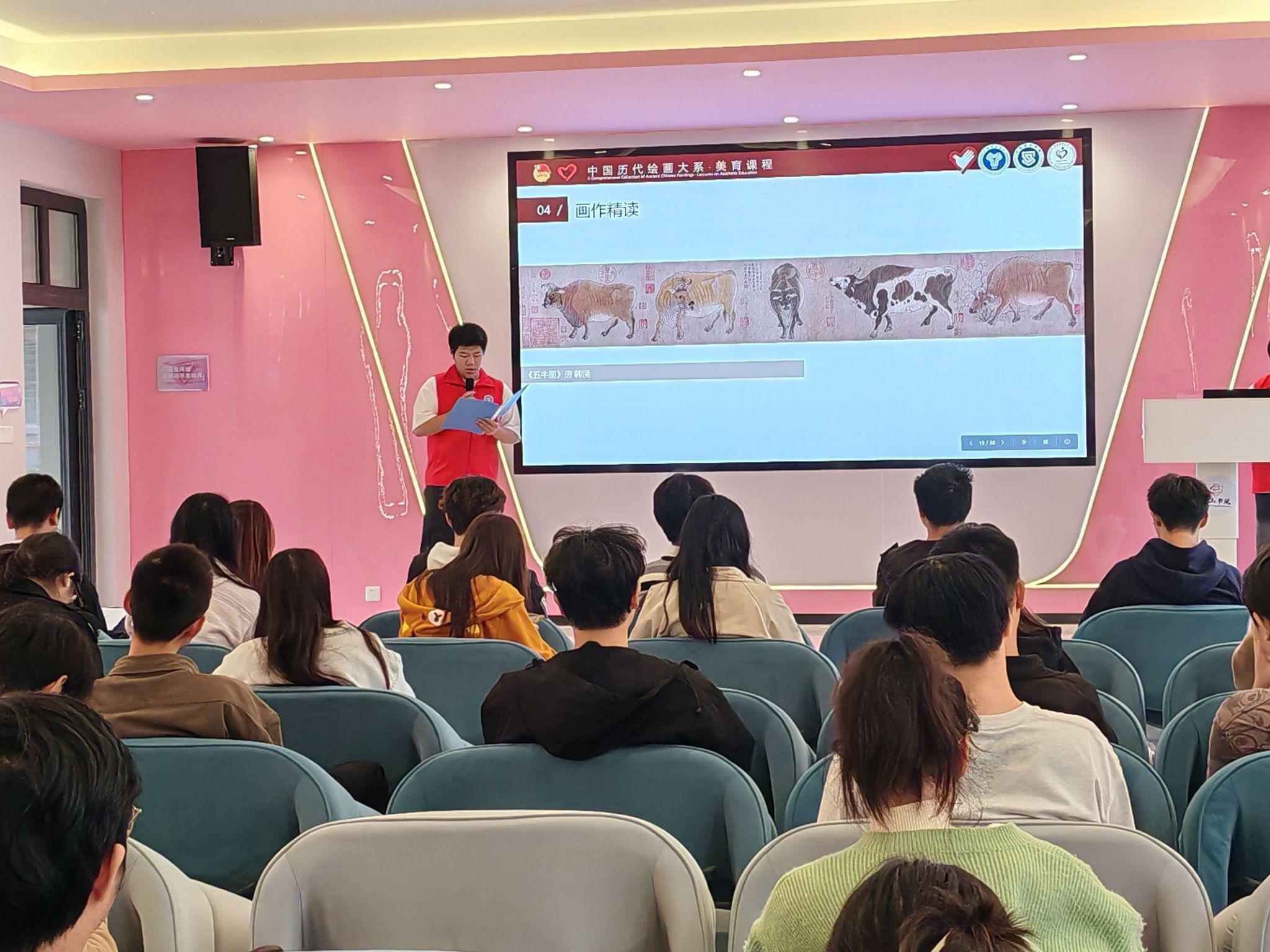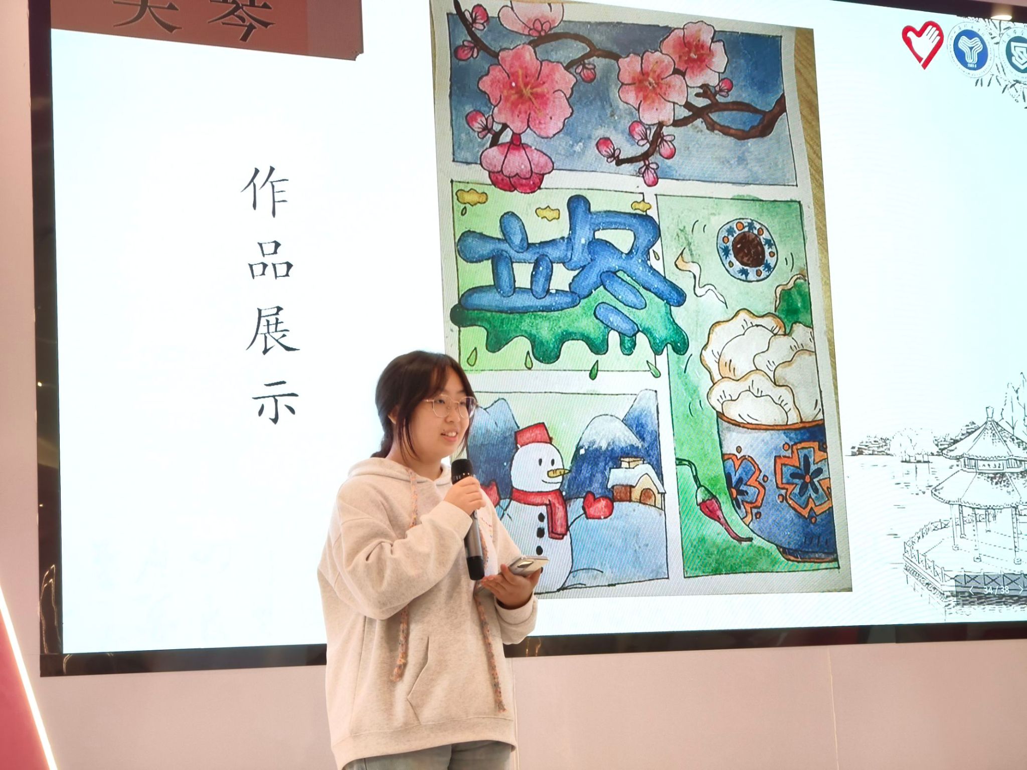 凉意来袭,冬日气息越发浓厚。本次活动的线下分享环节也如约而至,同学们带着自己精心绘制的作品前往活动现场。首先,主持人通过PPT为大家讲解了我国优秀的传统绘画以及温馨的传统节日,将参与者们引入独属冬季的雪色墨香之中,深入体会中华传统绘画给季节赋予的浪漫。