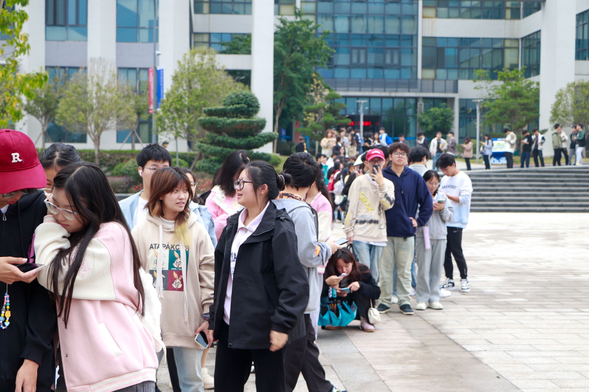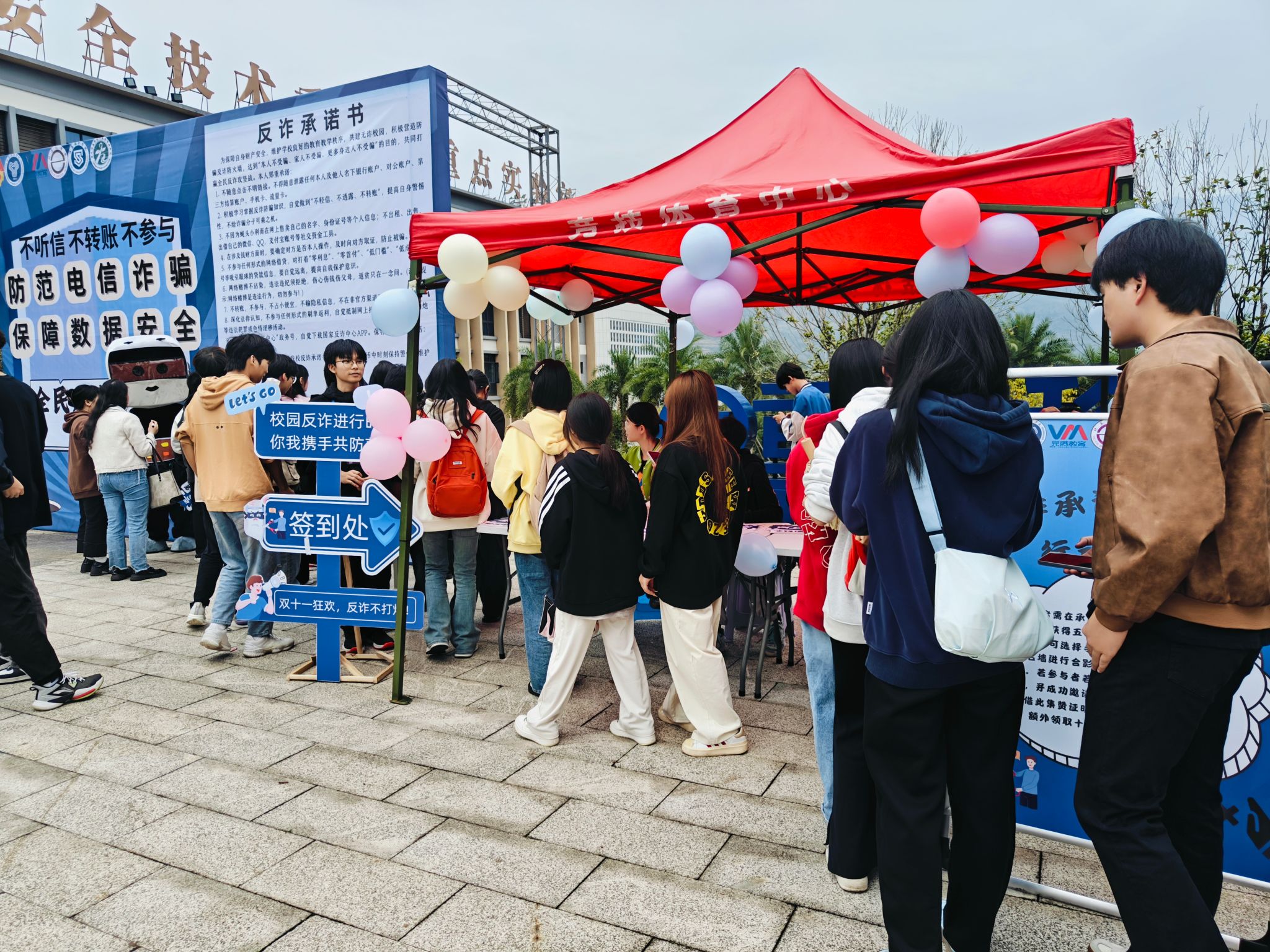 在瀛山图书馆前广场,一场结合“潮流文化”“宣教互促”“游戏互动”“反诈手势舞教学”等元素的反诈集市活动吸引了众多学生参与。通过创新“集市+反诈”的工作模式,全方位、多角度开展预防网络诈骗宣传工作。随着吉祥物的闪亮登场,活动被拉开序幕,在工作人员的引导下同学们有序的签下反诈承诺书并分享到朋友圈进行签到。
