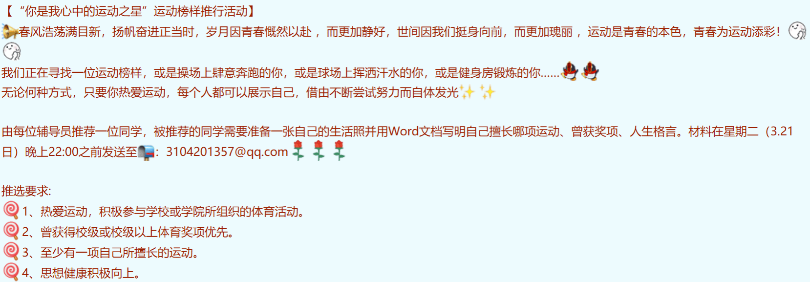我们通过每位辅导员的推选,通过对比优秀青年学子曾获得校级或校级以上体育奖项作为参考,并推出线上投票,以公平、公正、公开的方式推选出第一期体育榜样优秀人物。