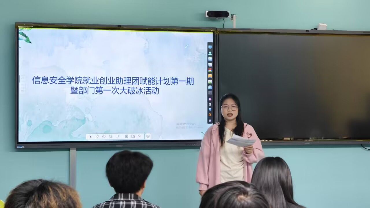 为进一步加强团队成员之间的相互了解,提升团队协作能力,并熟悉部门运作体系。2024年11月14日17:30,信息安全学院团总支就业创业助理团在贤者楼217举办了“聚首齐心·合力奋进”信息安全学院团总支就业创业助理团赋能计划第一期暨部门第一次大破冰活动。此次活动有幸邀请到学工办主任邹健老师,就业创业工作办公室主任袁君老师和焦梦玲老师作为特邀嘉宾出席,由刘佳书记主持。