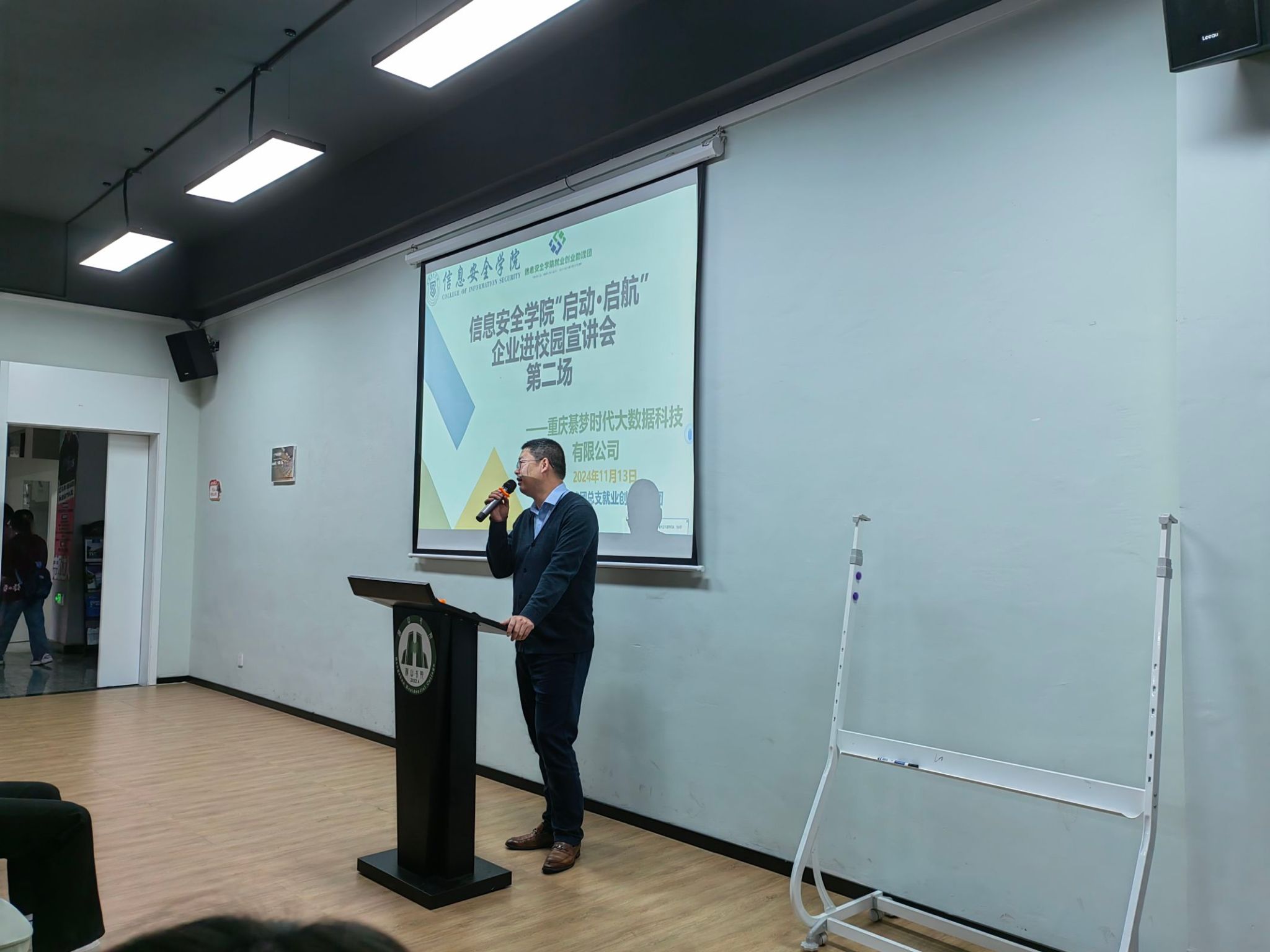 为帮助即将毕业的同学深入了解当前就业形势和企业需求,从而更好地规划自己的职业道路。2024年11月13日16:00—17:00,信息安全学院团总支就业创业助理团在横山书院知物·多功能活动室举办了信息安全学院“启动•启航”企业进校园宣讲会第二场——重庆綦梦时代大数据科技有限公司。本次活动特别邀请了重庆綦梦时代大数据科技有限公司的孙总——孙国文,活动共计50余人参与,由左浩岚同学主持。