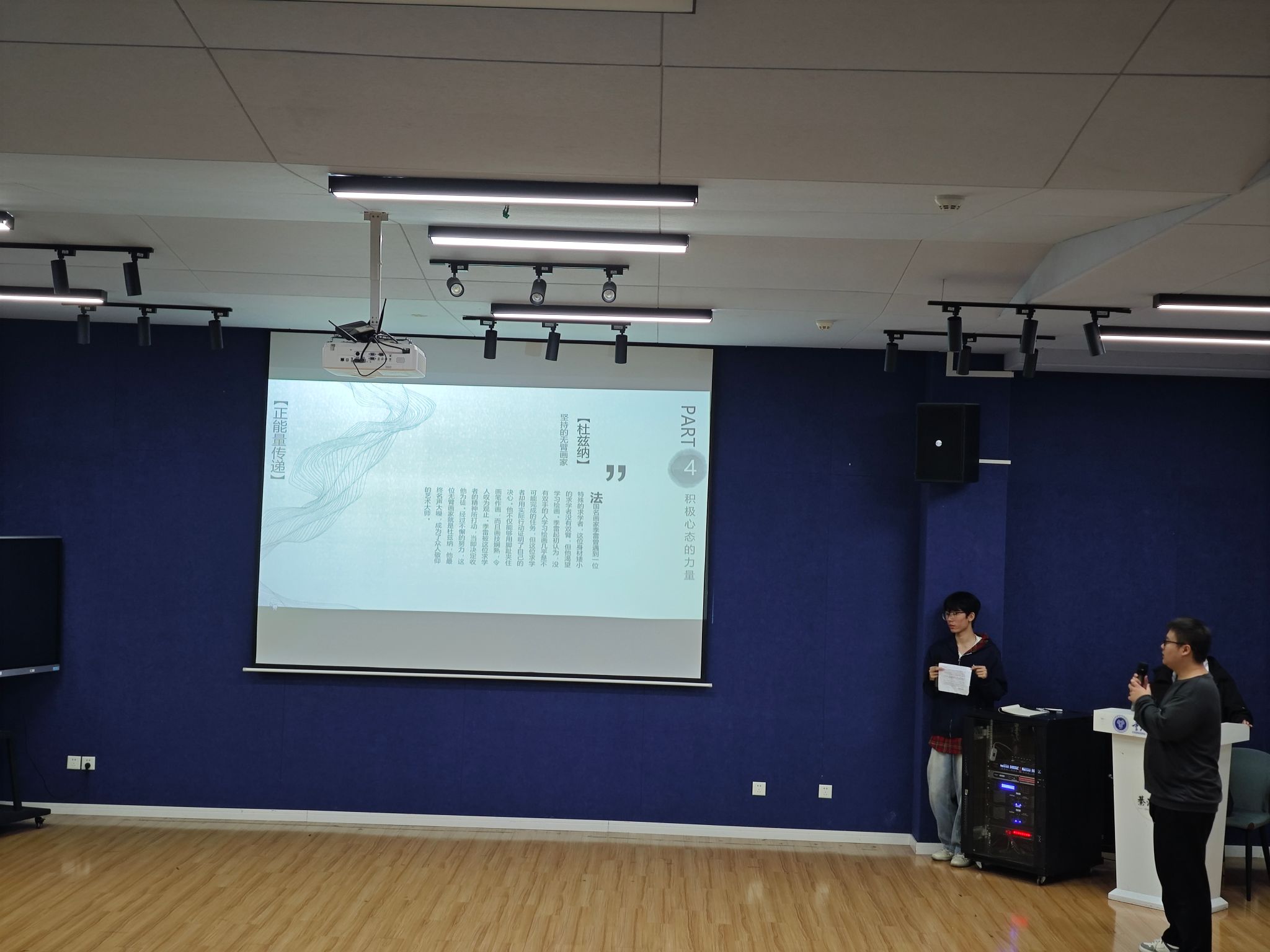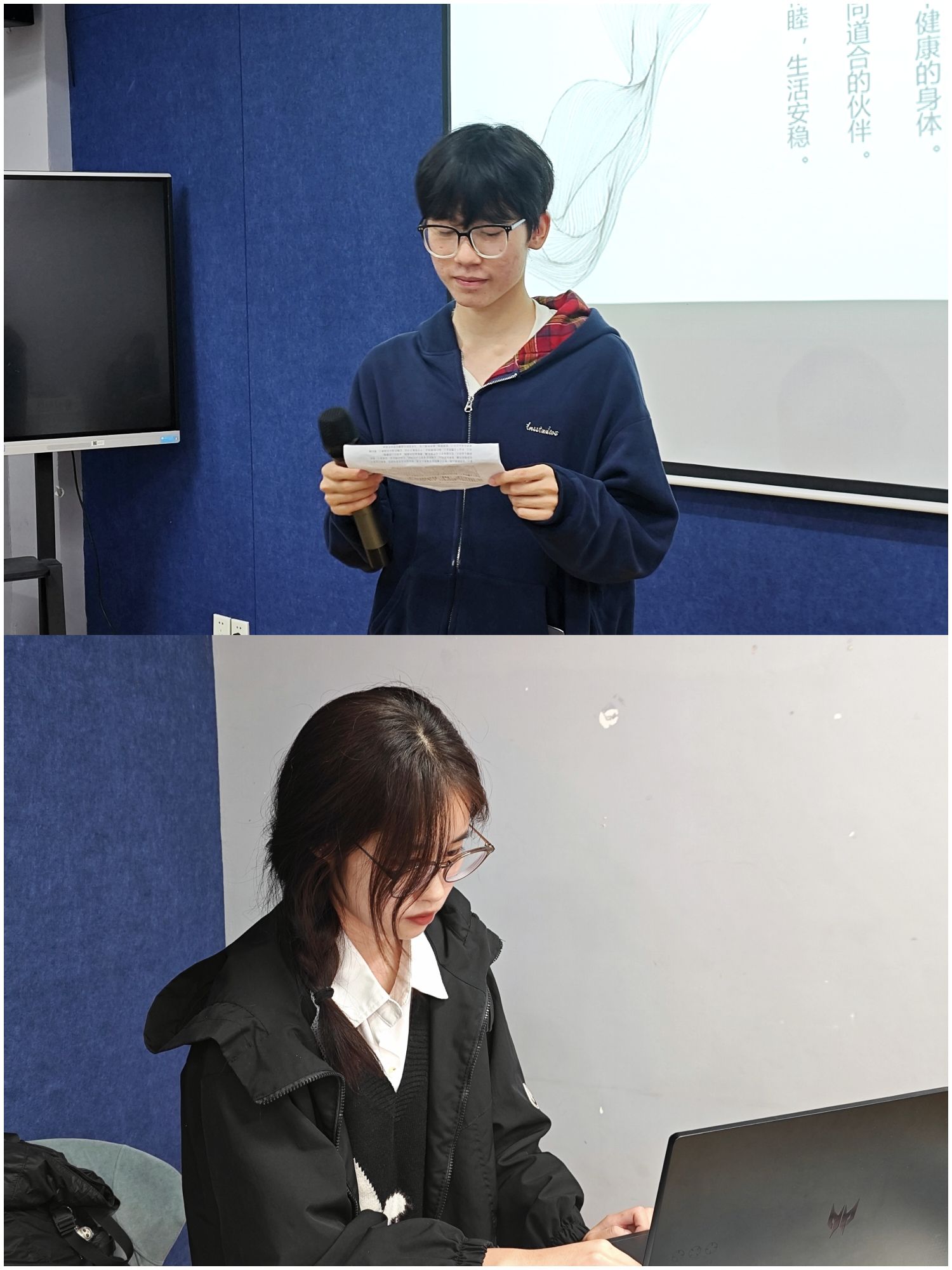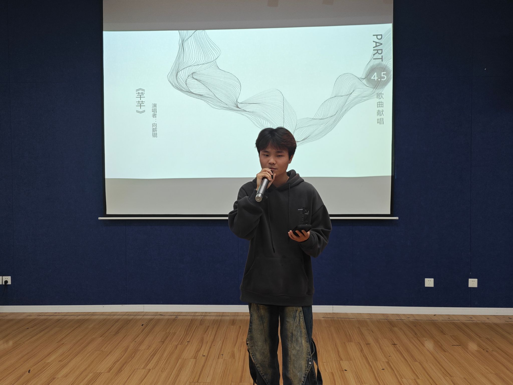 临近尾声,向薪锟同学上台献唱了《芊芊》这首歌,为本已欢快的氛围增添了音乐的韵律。演唱结束后,辅导员郭福禄老师进行了总结发言。他强调,健康积极的心态对于大学生应对学习压力、人际交往及职业规划等方面具有不可替代的重要作用,是推动我们生活和学业不断前进的强大动力。因此,我们应该树立“健康第一,每个人都是自己心理健康的第一责任人”的积极理念,做到“心中有阳光,脚下有力量”,从而拥有一个心态阳光、心情舒畅、充满幸福感的大学生活。