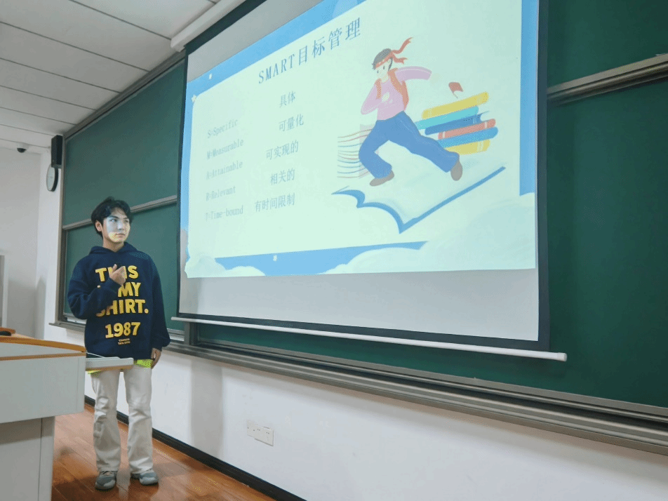 在撰写个人信息的过程中,文老师向学生着重强调了未来的规划问题,详细地为学生介绍了SMART目标管理原则,结合实际因素,文老师让学生运用刚才所学的目标管理原则把2024至2025学年的目标也写于纸上,之后邀请学生谈论自己对于目标管理的感悟。