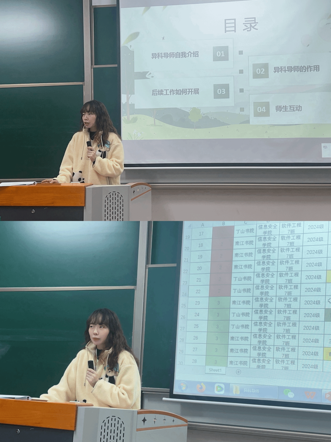2024年11月13日,一场以“共绘未来,初见时”为主题的2024级信息安全学院软件工程6班和软件工程7班异科导师与学生见面会在行者楼106教室举行。