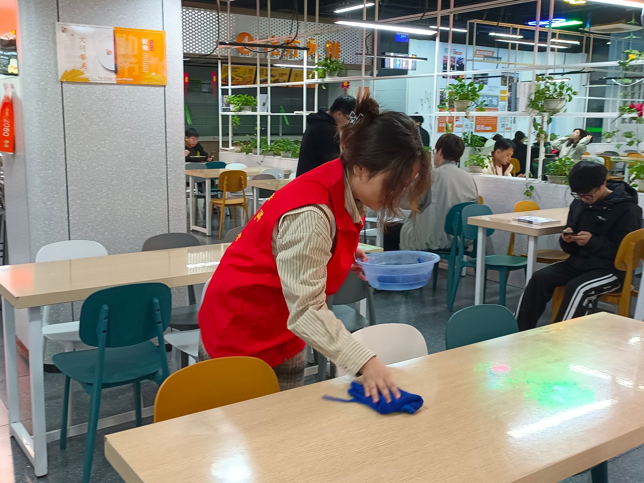 活动伊始,负责人为大家讲解了志愿活动中的注意事项,并为志愿者发放志愿者服装,进行了分工,本次活动人员分为两组,分别负责一楼二楼饭堂,擦桌子,将饭桌上的饭粒、残渣回收到饭堂,为下一位吃饭的同学提供干净的桌椅,再将饭堂里的桌椅摆放整齐并用扫把打扫地面上的饭粒、残渣与垃圾,回收餐具。