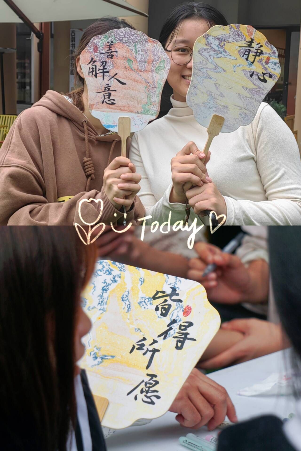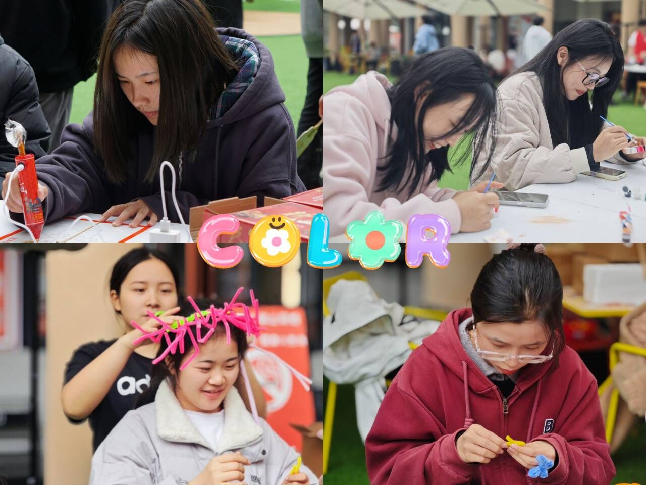 夕阳的余晖洒落在古剑书院的中庭,为活动拉开了温暖的帷幕。下午4点,活动准时启动,现场布置了多个手工艺术体验区,宛如一幅幅生动的画卷,吸引了众多学生的热情参与。本次活动设置了漆染扇子、石膏娃娃制作、手绘和扭扭棒等趣味项目,参与者在动手实践中尽情感受色彩的魅力,共同探索色彩世界的无限可能。