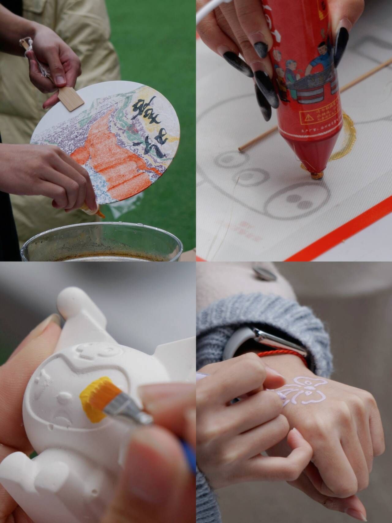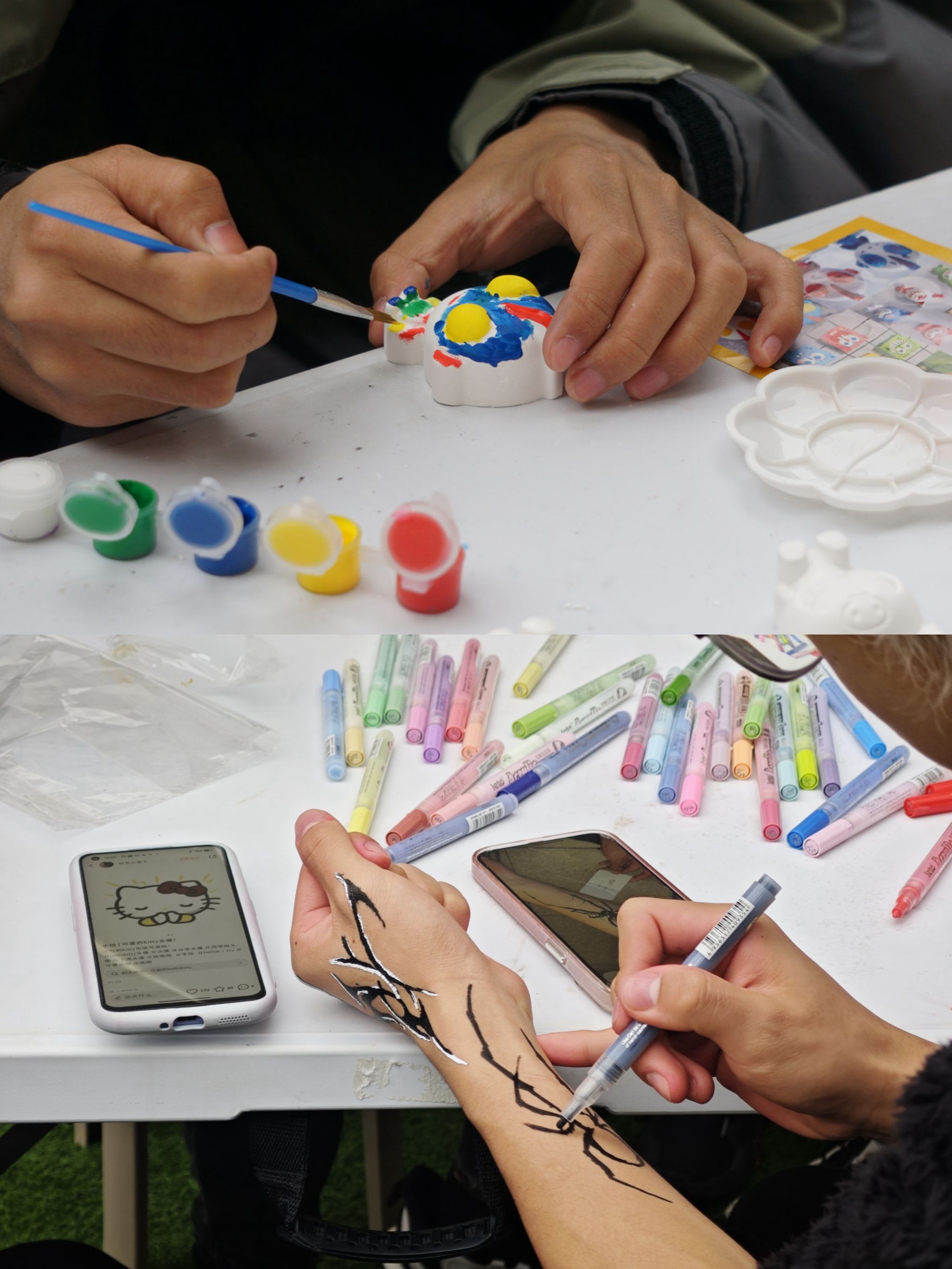 在漆染扇子的摊位,参与者们现场动手,用漆料在洁白的扇面上挥洒色彩,宛如在画布上创作,尽情发挥创意,打造独一无二的扇子作品。这不仅是一场艺术体验,更是一场自我表达的旅程。另一边,参与者们领取颜料和专属的石膏娃娃,亲手设计并为自己的娃娃填色,赋予它们独特的个性,充分展现天马行空的想象力。