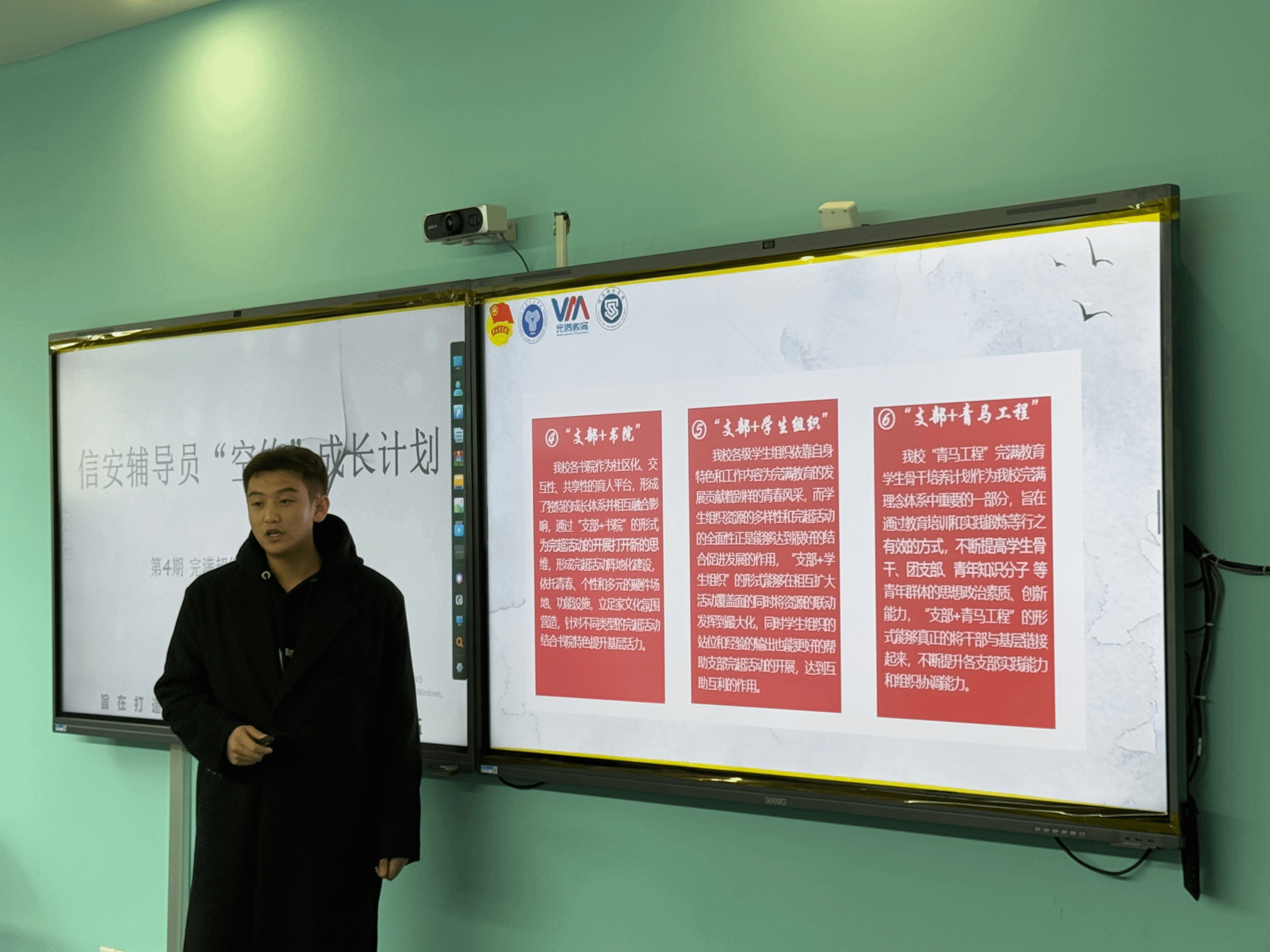会议伊始,信息安全学院组织部干事为各位辅导员解读完满超级团支部活动方案。指出完满超级团支部活动的总体目标,“一站式”对完满超级团支部活动全过程进行流程梳理,并从六个团支部评选方向以及六项示范创建三个阶段分别简明扼要的点明了完超活动的主体与形式。详细而又精练的解读简明扼要、恰到好处。