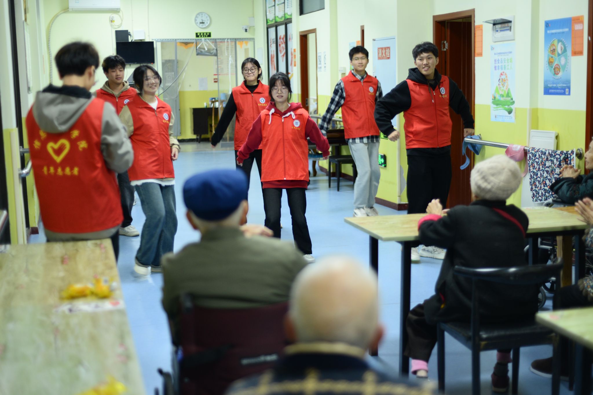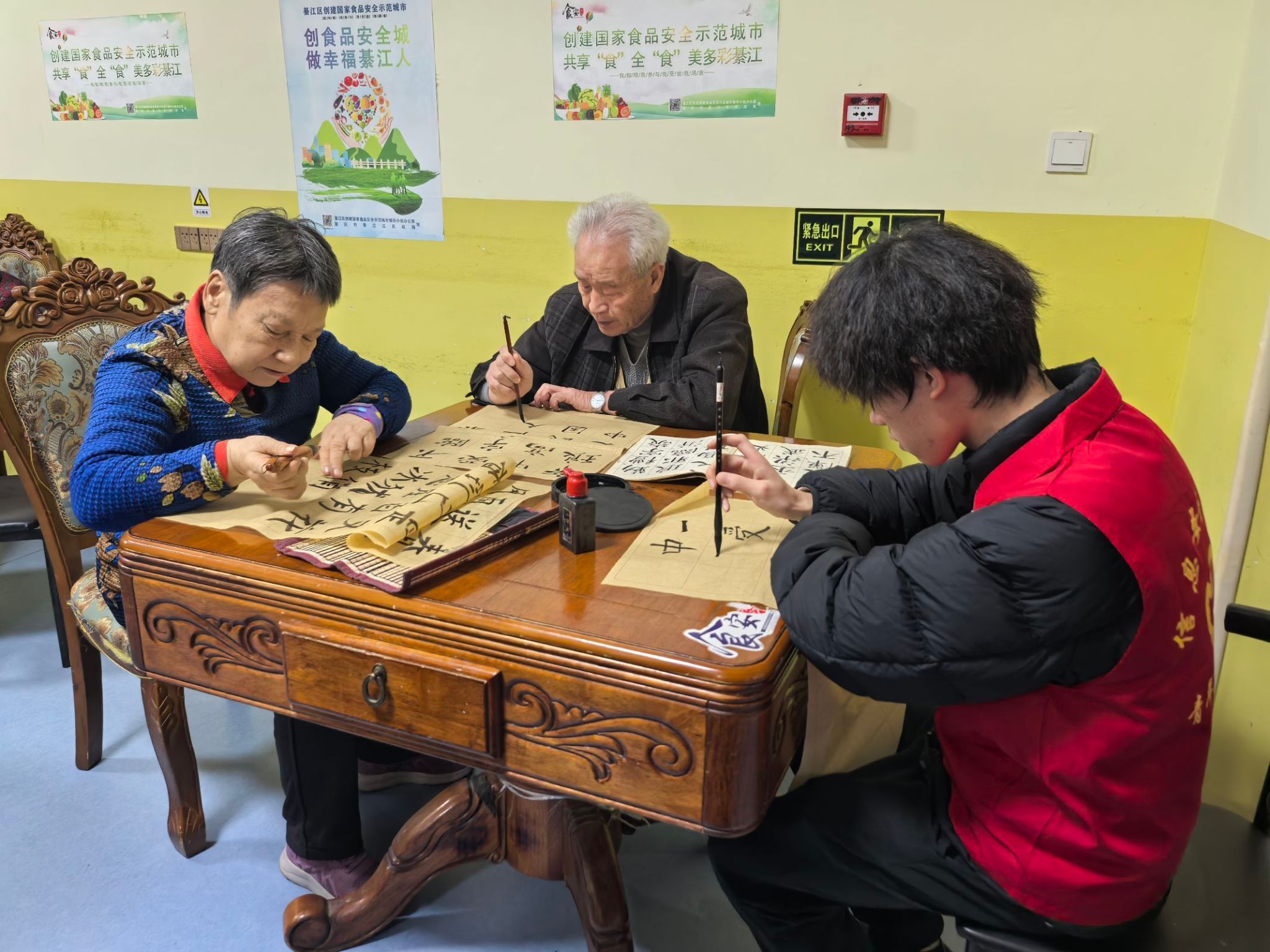 讲座结束后,现场响起欢快的歌声,温馨愉悦的氛围迅速弥漫整个场地。真情陪伴,“志”和“愿”都有一颗“心”,志愿者怀揣一颗热忱的心陪老人们散步,互动,了解老人们的生活,听他们倾诉着多彩的人生。在志愿者的陪伴下,老人们脸上洋溢幸福的笑容。活动中,志愿者还表演了精彩的舞蹈,欢快的节奏感染了老人们,现场充满了欢声笑语。最后,志愿者用毛笔书写祝福语,其中志愿者熊子懿为老人们书写了“福禄寿喜”的字帖,作为纪念品赠予老人。这不仅表达了志愿者的关心与祝福,也为活动增添了一份温情。