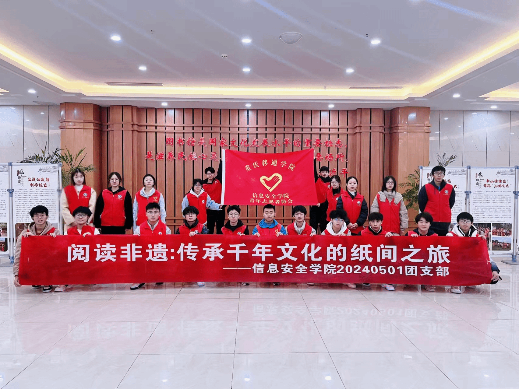 品阅非遗韵,共传文化魂。2024年11月21日上午9:30,于綦江区图书馆通惠馆这片知识的沃土上,一场关于非遗文化的传承悄然绽放。信息安全学院团总支青年志愿者协会与2024级区块链工程1班学生共同举办“阅读非遗:传承千年的文化纸尖之旅”弘扬非遗传统文化活动。此次活动旨在让每位参与者在阅读与实地体验中感悟非遗文化的独特之美,在实践中增强文化自信,将千年传承的文化精髓传播下去,成为非遗保护与传承的推动者。