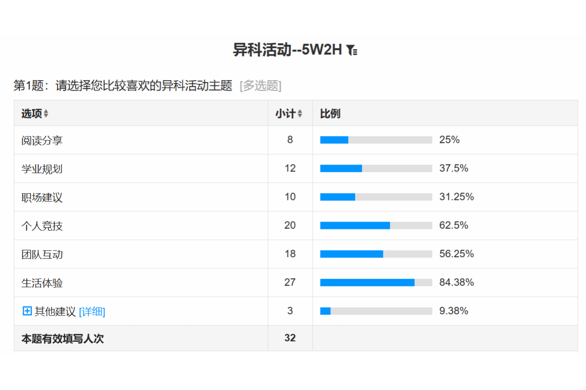 从调查结果来看,全员32名同学积极参阅调查,总人次达78。