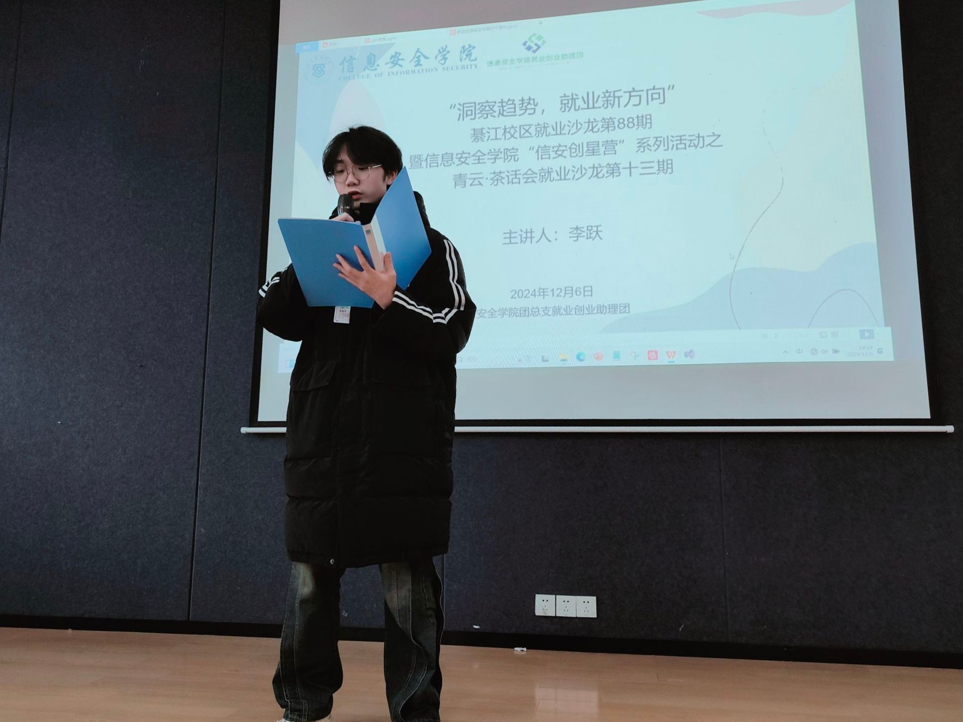 在科技迅猛发展与社会加速转型的当下,就业格局正经历深刻变革。为帮助求职者勾勒前沿就业蓝图,2024年12月6日14:00—16:00,信息安全学院团总支就业创业助理团在瀛溪书院回声报告厅开展“洞察趋势·就业新方向”信息安全学院“信安创星营”系列活动之青云·茶话会就业沙龙第13期,本次活动邀请到李跃老师,共计60人参与,由高俊杰同学主持。