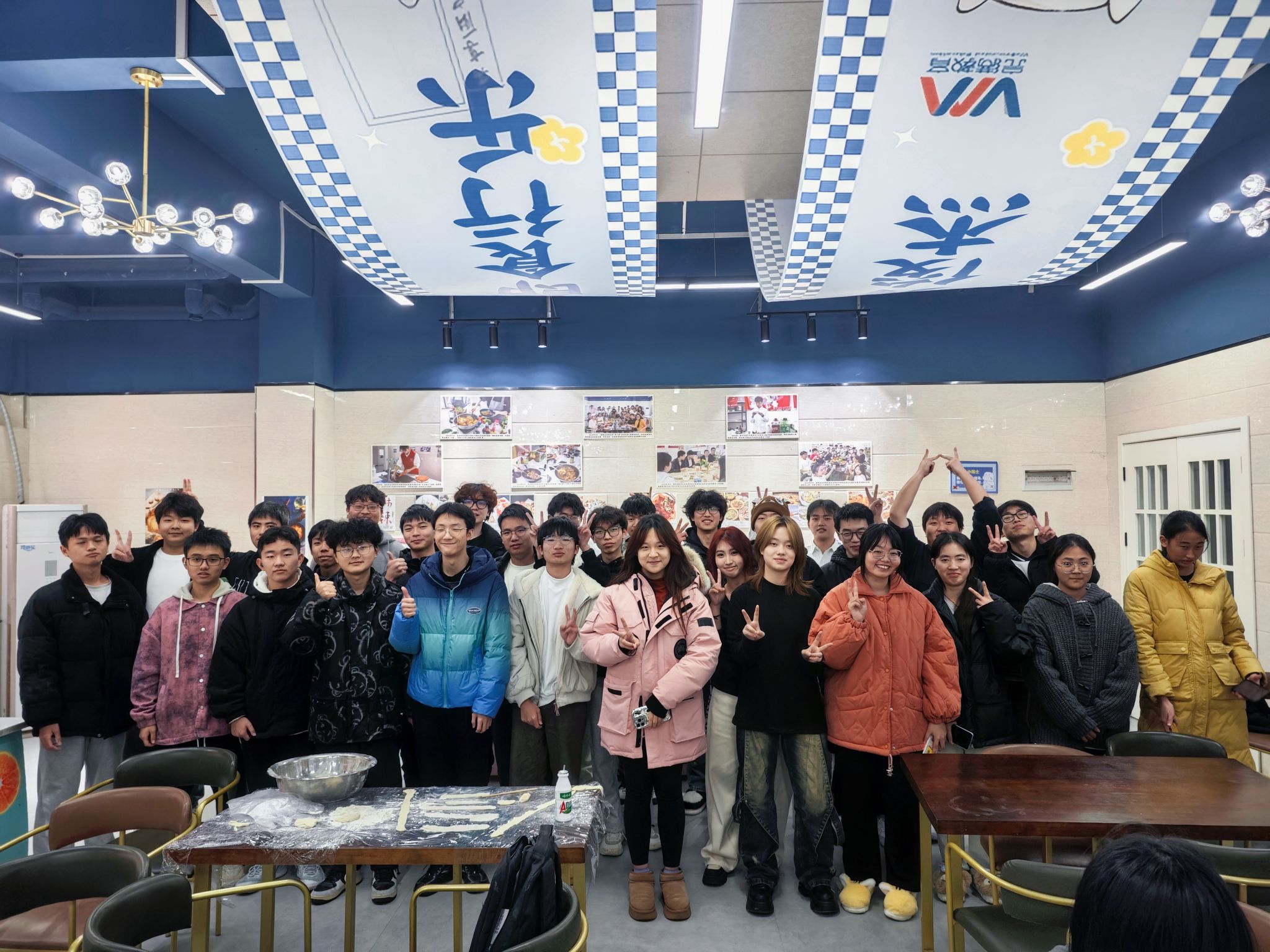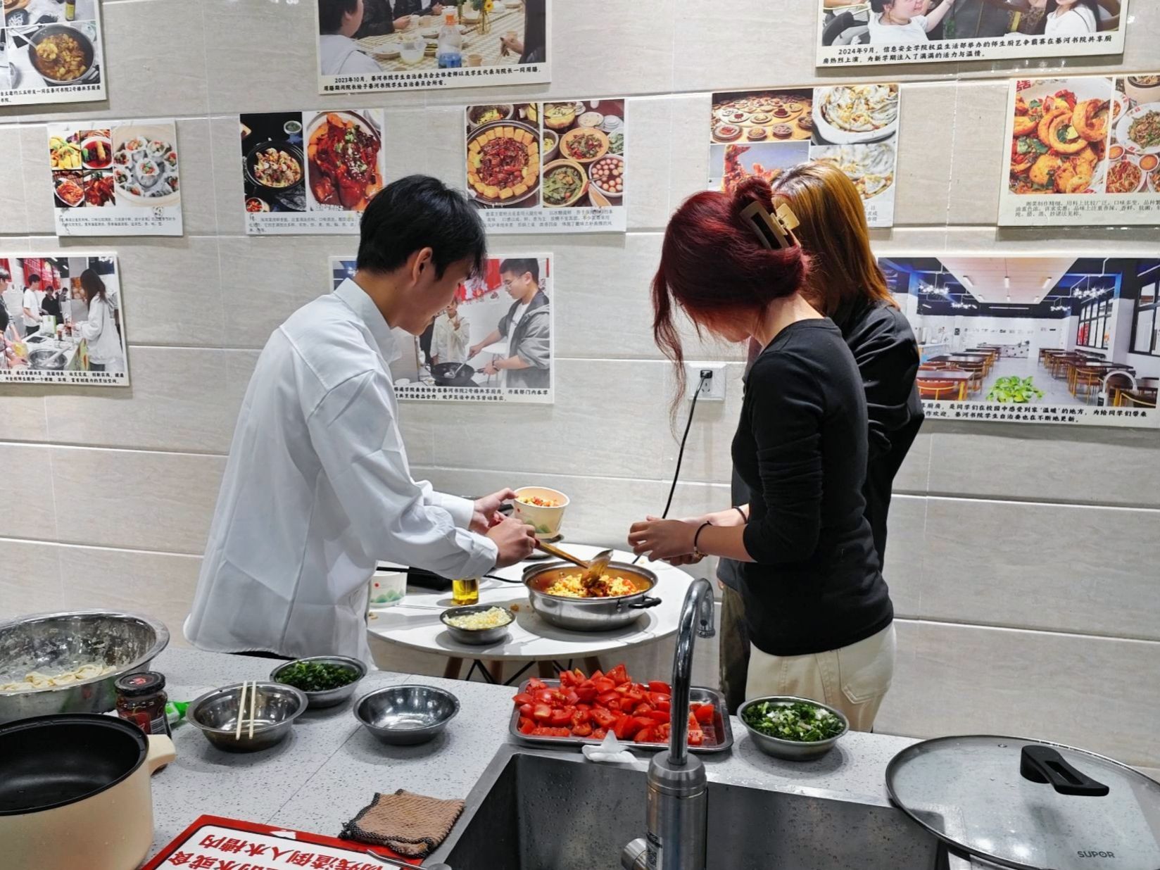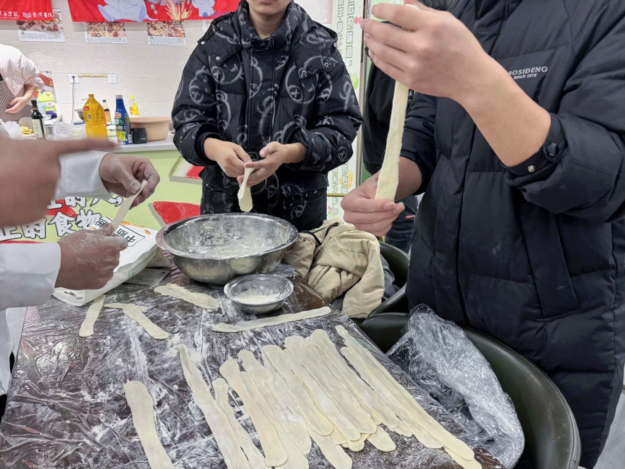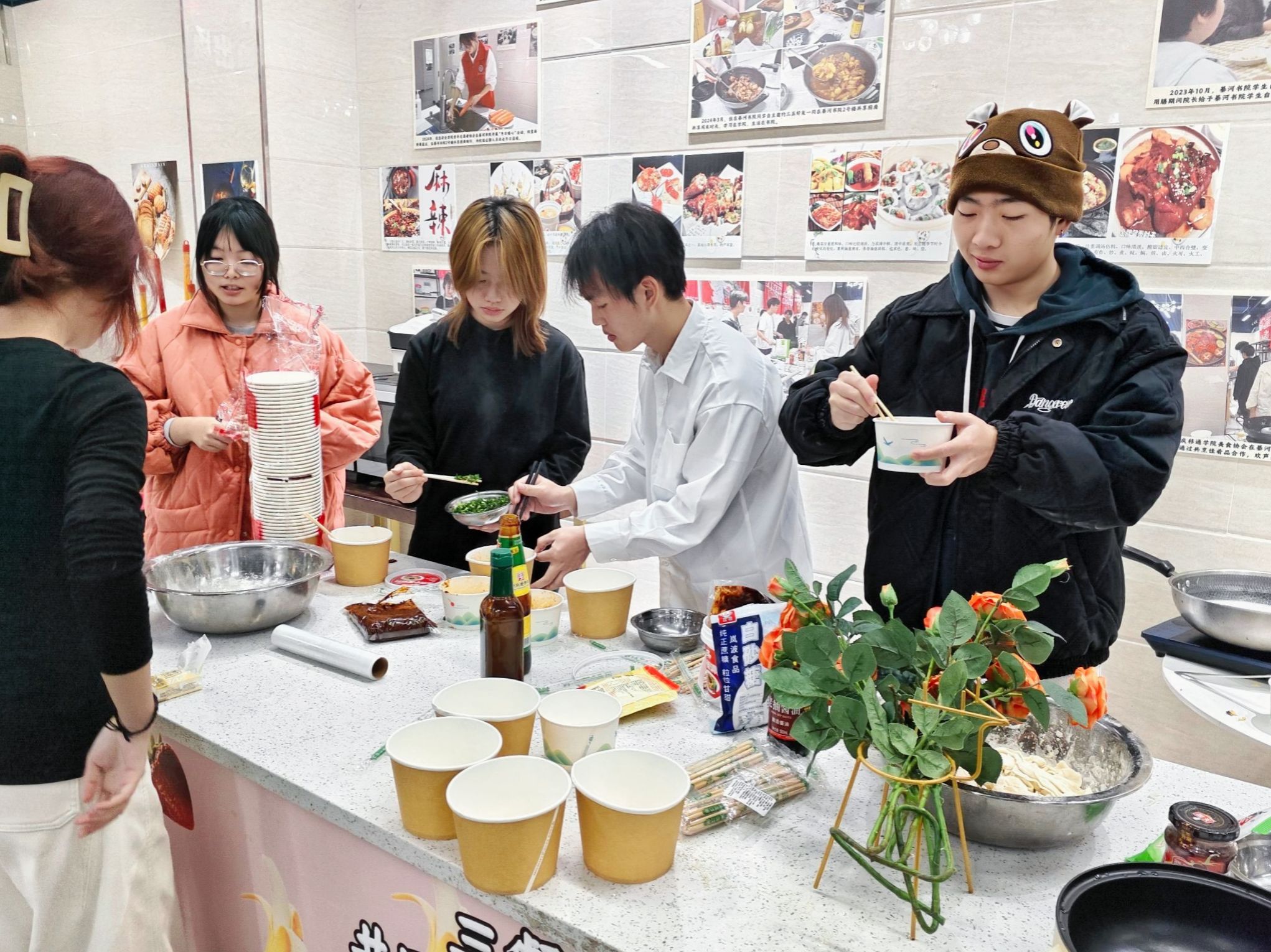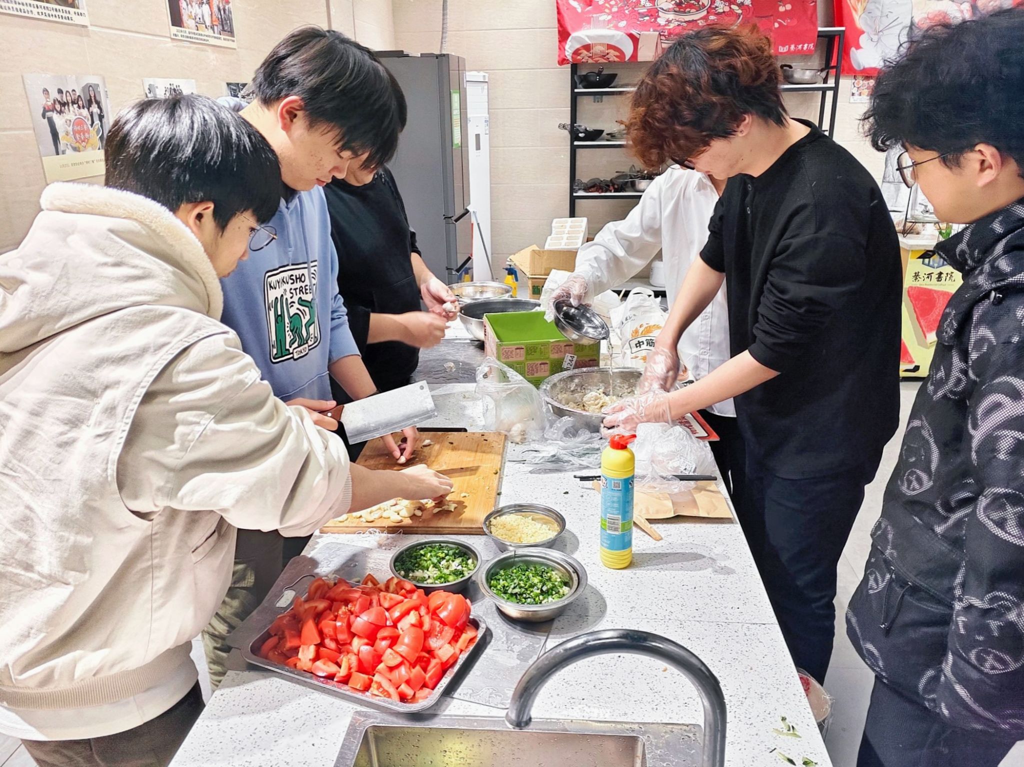 为培养同学们对传统艺术的热爱,主持人带领大家前往共享厨房进行铺盖面的制作。看到桌上的面粉、各类食材及调料,同学们都跃跃欲试,迫不及待地想要去体验这一过程,在指导人员的协助下,同学们分工协作进行了面团的揉捏、佐料的调配,凭借自己的双手完成了传统特色面食——铺盖面的制作,并品尝到这道美味的特色佳肴。