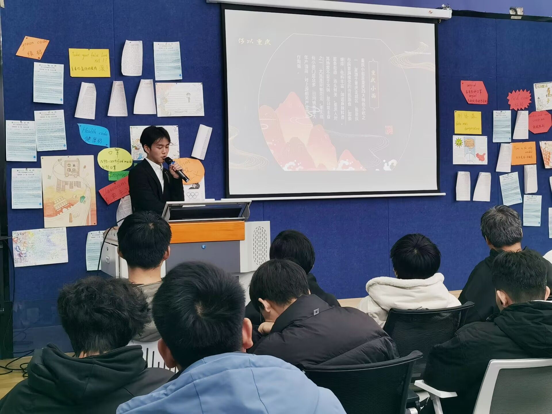 重庆,这座位于长江上游的山城,以其独特的地貌、丰富的历史文化底蕴和现代化的城市风貌闻名遐迩。为了让同学们更深入地了解重庆,探索其悠久的历史脉络和璀璨的文化遗产,2024年12月6日物联网工程1班于綦河书院的两句·演讲培训室与小厨·共享厨房开展了以“何以重庆”为主题的完超活动,同学们纷纷参与互动并各抒己见,同时在实践环节中立学笃行。