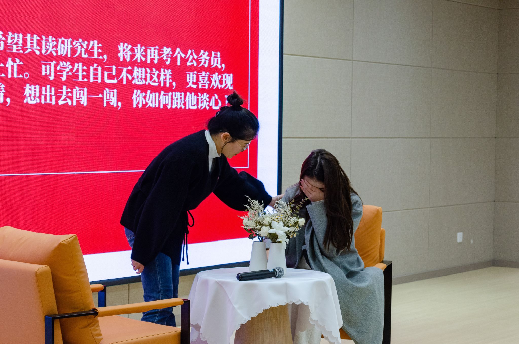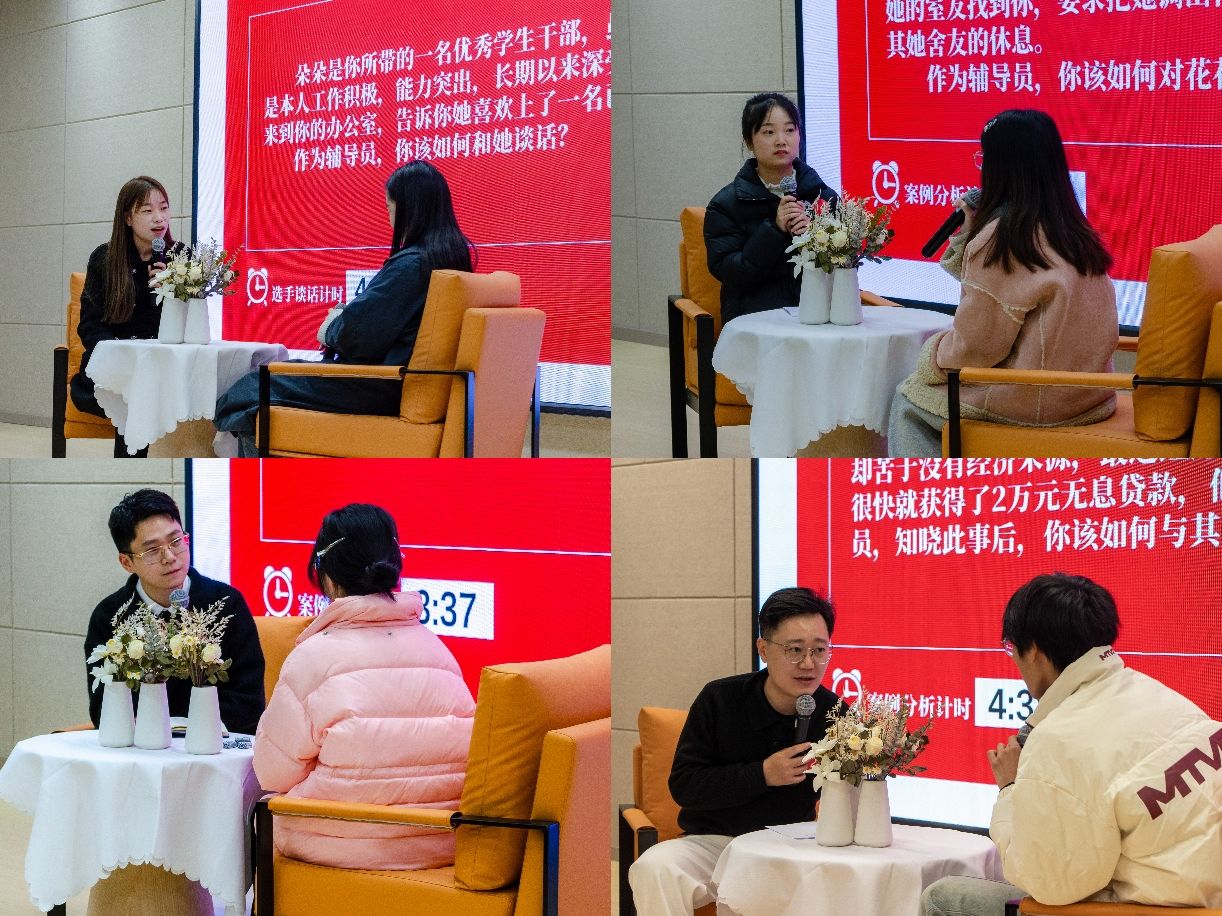 在谈心谈话环节中,主要考察辅导员对学生特征、学生成长成才规律的了解把握程度,对学生的教育引导能力、解决理论困惑和实际问题的能力等。参赛选手共12名,提前一天抽题,按照“人题匹配”的原则与相应学生开展谈心谈话,谈话限时5分钟。在这短暂的时间内,他们需要和“问题”同学进行深入交流,充分展现出他们在学生辅导工作中的专业素养。面对学生关于学业困惑的问题时,辅导员们耐心倾听,用温和的语言和专业的视角帮助同学分析问题、解决问题;在处理学生情感问题时,辅导员们以诚恳的态度和细致的观察,深入学生的内心世界,化解心结;在探讨职业规划时,辅导员们更是以丰富的经验和前瞻的视角,为学生描绘未来的蓝图等。这一环节的设计,不仅是对辅导员个人综合素质的一次全面检验,它更是加强师生之间情感联系、提升辅导员队伍整体工作水平的重要手段。