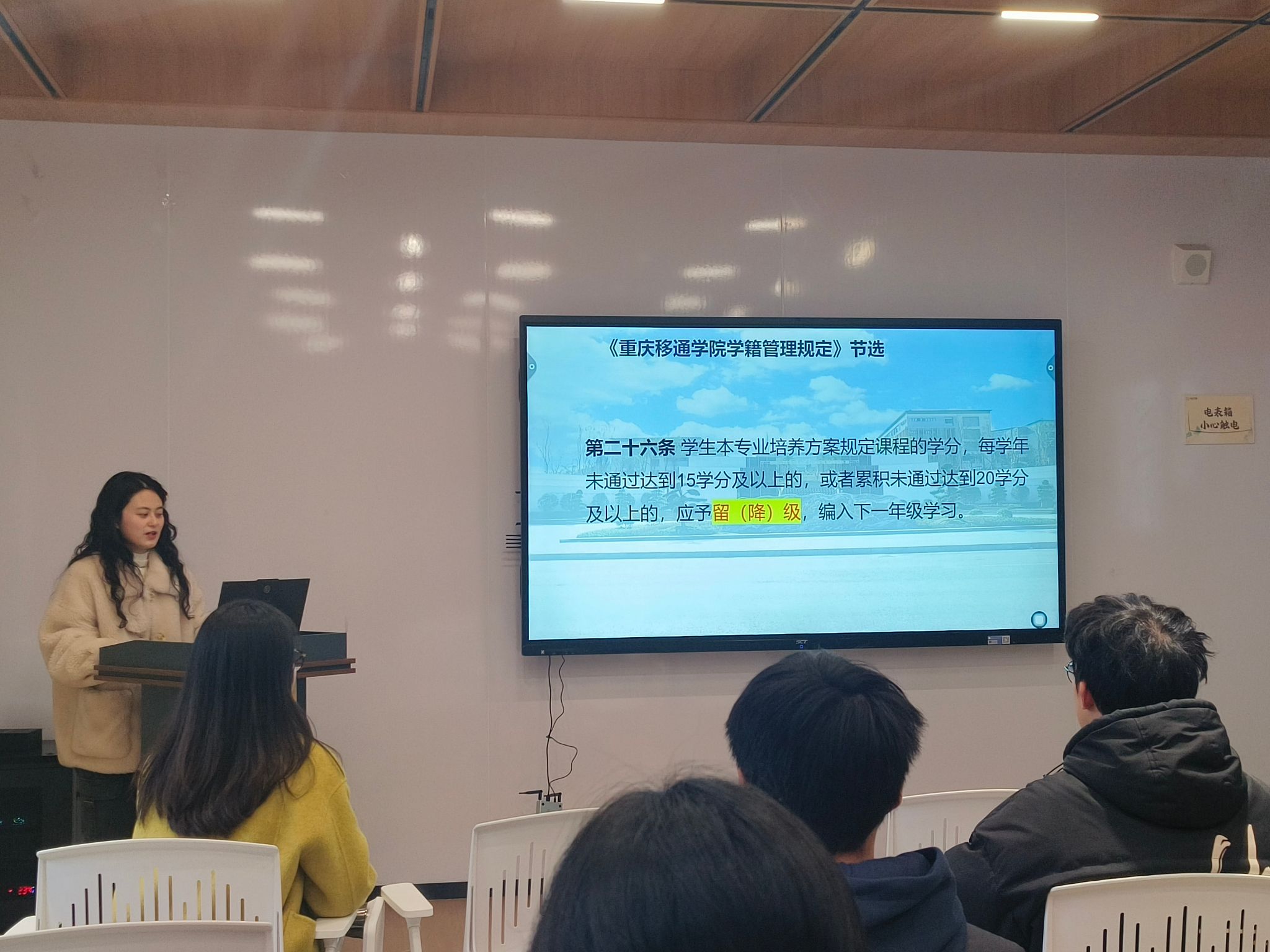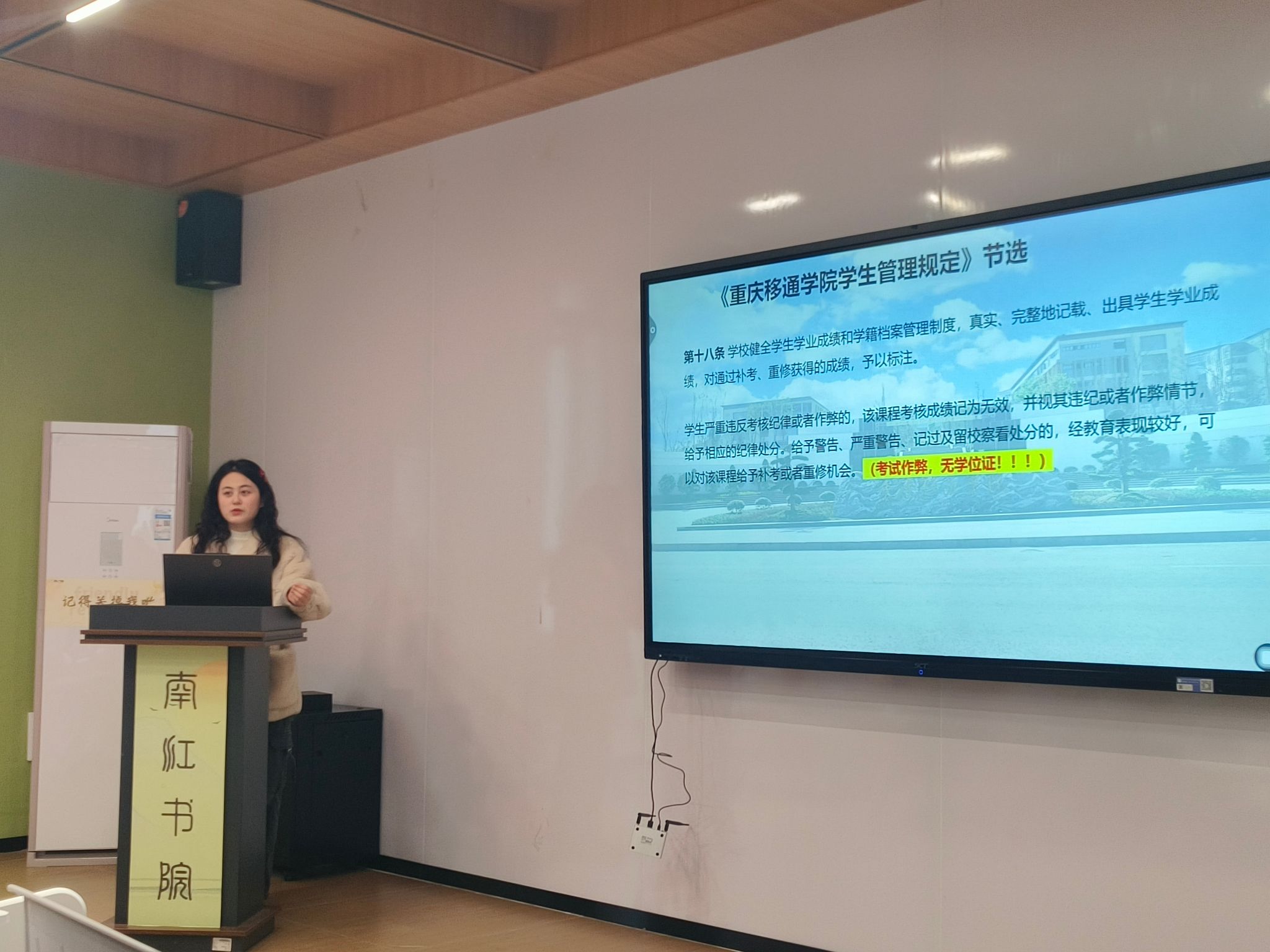 诚信是做人基本的道德要求,诚信应考也是必须遵守的纪律规范。焦梦玲老师首先向大家强调了诚信考试的重要性,以及在考试中作弊后果的严重性,给各位参会人员敲响了警钟。接着,她提到培养方案规定的课程学分要求,提醒学生们要对专业学习、期末复习提高重视,认真备考,避免挂科。焦梦玲老师鼓励学生们树立正确的考试观,不轻视考试重要性,不夸大考试影响力,把考试作为对自己学习效果的检验以及发现自身不足的一种途径。